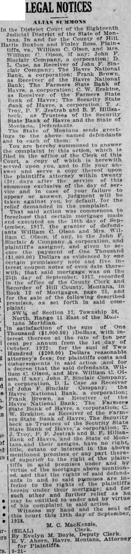 LEGAL NOTICES ALIAS SUMMONS In the District Court of the Eighteenth Judicial District of the State of Montana, In and for the County of Hill. Hattle Buxton and Finley Ross, Plaintiffs, vs., William C. Olson, and Mrs. William Olson, if any: John F Sinclair Company, a corporation: D. L. Case, as Receiver of John Sinclair Company: The Havre National Bank, corporation: Frank Brown, as Receiver of the Havre National Bank; The Farmers State Bank of Havre corporation; C. W. Erskine, as of the Farmers State Bank of Havre; The Security State Bank of Havre, corporation: Troy, P. F. Jestrab and B. F. Hillsabeck. as Trustees of the Security State Bank of Havre and the State of The State of Montana sends greetings to the above named defendants and to each of them: You are hereby summoned to answer the in this action, which is filed in the office of the Clerk of this Court, copy of which herewith served upon you, and to file your answer and copy thereof upon the plaintiffs attorney within twenty (20) days after the service of this summons exclusive of the day of service and in case of your failure to appear or answer, judgment will be taken against you, by default. for the relief demanded in the complaint That said action was commencea to foreclose that certain mortgage made and executed on the 10th day of September, 1917, the grantor of defendants William C. Olson and Mrs. William C. Olson, if any, to the John F. Sinclair & Company a and plaintiff's assignor, and given to secure the payment of One Thousand ($1 00) Dollars as evidenced by one certain promissory note and five interest coupon notes of even date therewith; that said mortgage was on the 25th day of September, 1917. recorded in the office of the County Clerk and Recorder of Hill County, Montana, in Book 12 of Mortgages, page 75, and for the sale of the following described premises, as set forth in said complaint: SW% of Section 17. Township 36, North, Range 11 East of the Monitana Meridian. in satisfaction of the sum of One Thousand 000 Dollars, with interest thereon at the rate of ten per cent per annum from the 1st day of October. 1922: for the sumi of Two Hundred ($200.00) Dollars reasonable attorney's fees; for plaintiffs costs and disbursements in said action ;and for decree that the said defendants, William Olson, and Mrs. William C. O1son, if any; John F. Sinclair Company, D. L. Case as Receiver of John F. Sinclair Company the Havre National Bank, a corporation; Frank Brown, Receiver the Havre National Bank The Farmers State Bank of Havre, corporation; C. W. Erskine as Receiver of the Farmers State Bank of Havre; The Security beck as Trustees of the Security State State Bank of Havre, T. Troy, Jestrab and B. F. HillsaBank of Havre, and the State of Montana,and their assigns, have no right, title, estate or interest in the above mentioned premises or any part thereof superior to the right of the plaintiffs in said premises under and by virtue of the mortgage above mentioned, and that the rights of said defendants in and to said premises are inferior to the rights the plaintiffs herein under their mortgage and for such other and further relief as he may be entitled to under and by virtue of his complaint in said action. Witness my hand and the seal of this court this 19th day of September, 1928. M. C. MacKenzie, Clerk. By (SEAL) Evelyn M. Boyle, Deputy Clerk. E. V. Ahern. Havre. Montana, Attorney for Plaintiffs. 9-21-