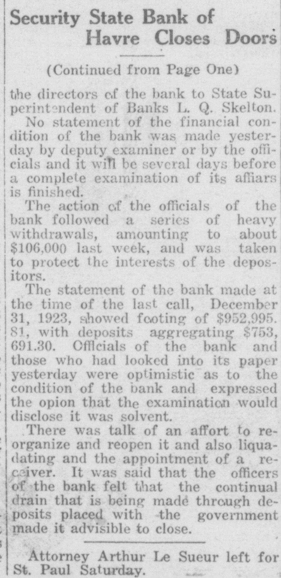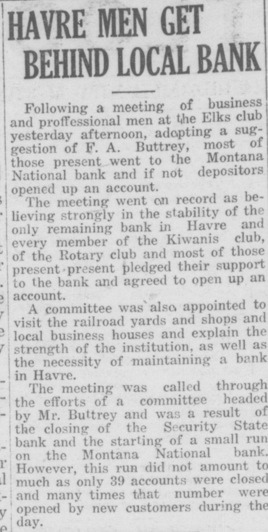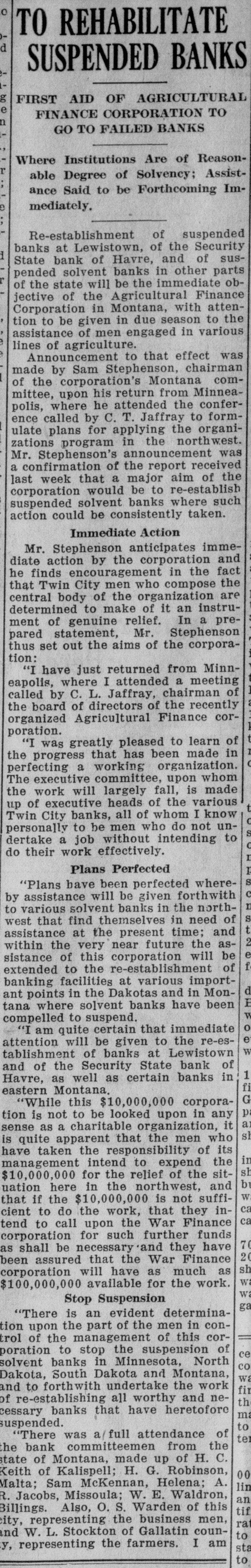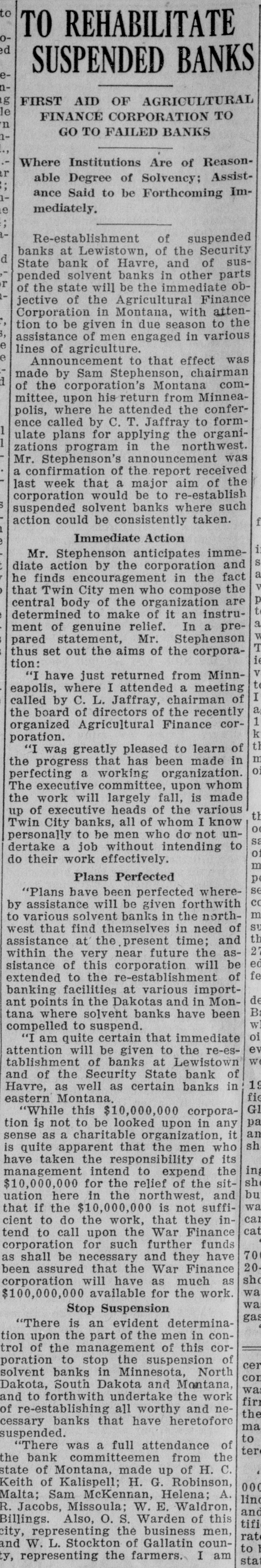 "I am quite certain that immediate attention will be given to the re-establishment of banks at Lewistown and of the Security State bank of Havre, as well as certain banks in eastern Montana.