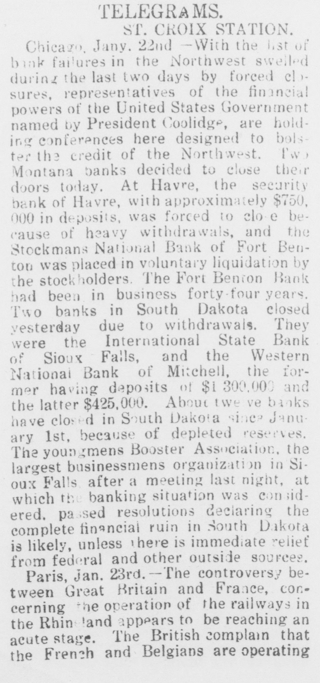"Plans have been perfected whereby assistance will be given forthwith to various solvent banks in the northwest that find themselves in need of assistance at the present time; and within the very near future the assistance of this corporation will be extended to the re-establishment of banking facilities at various important points in the Dakotas and in Montana where solvent banks have been compelled to suspend.