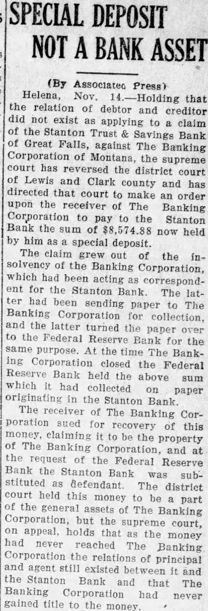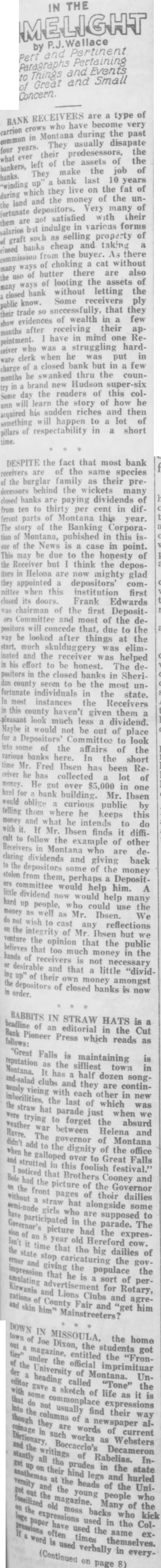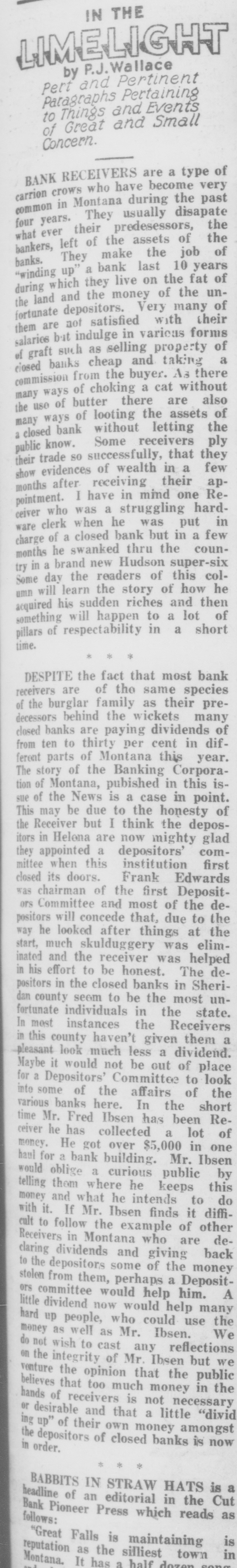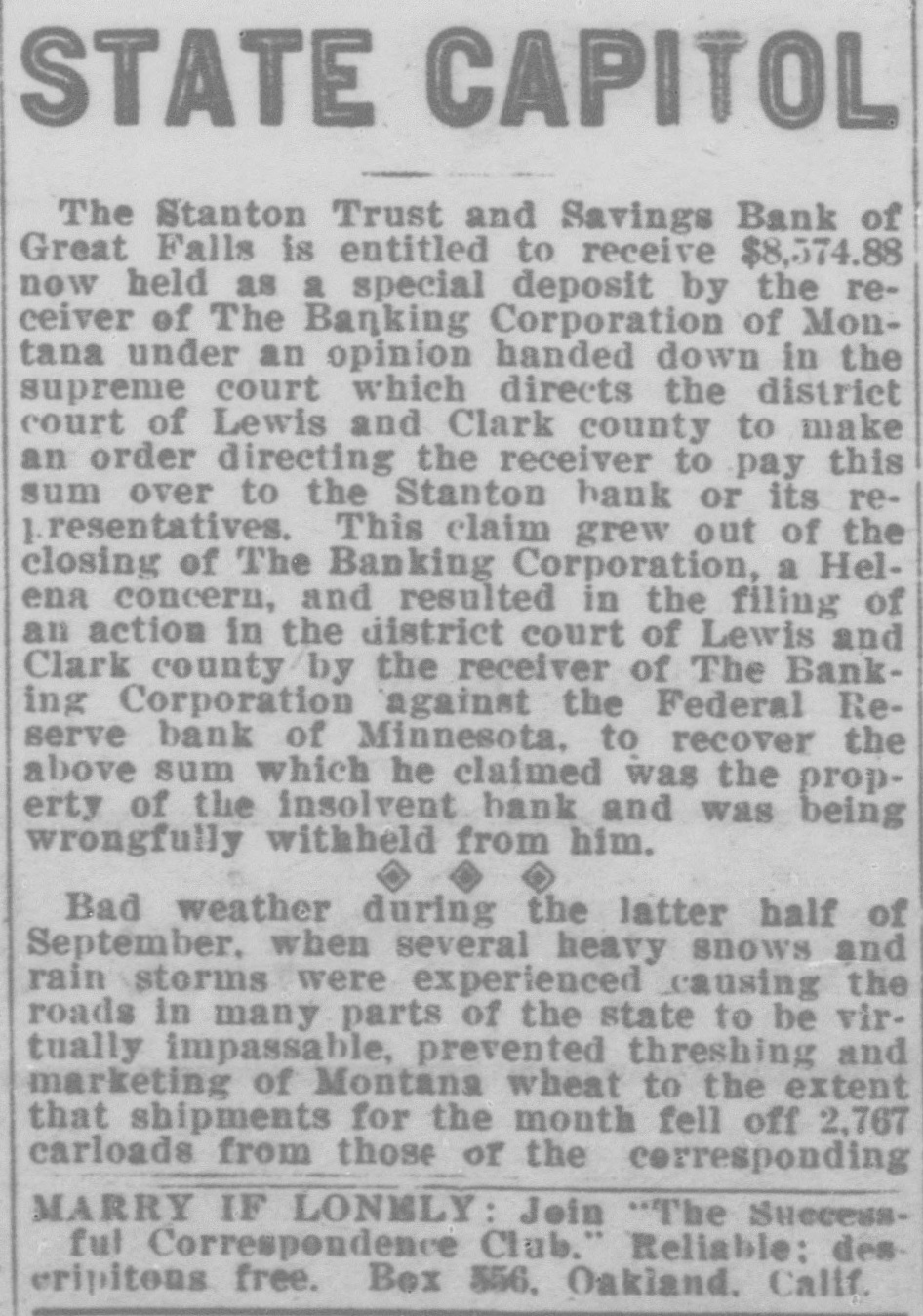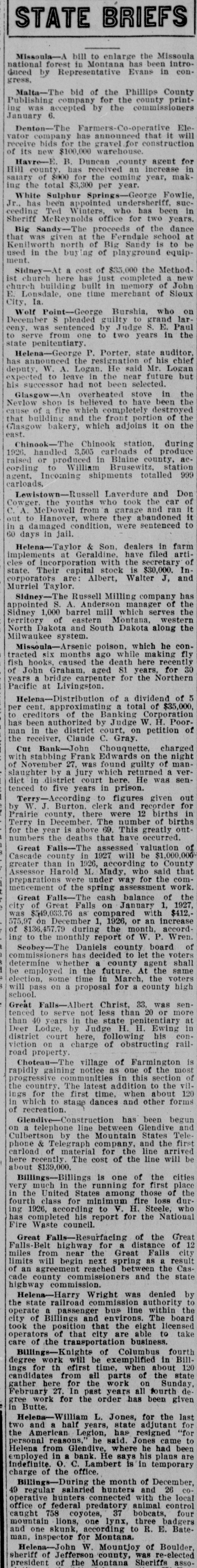 STATE BRIEFS Missoula-A bill to enlarge the Missoula national forest in Montana has been introduced by Representative Evans in congress. Malta-The bid of the Phillips County Publishing company for the county printing was accepted by the commissioners January 6. Denton-The Farmers-Co-operative Elevator company has announced that it will receive bids for the gravel for construction of its new $100,000 warehouse. Havre-E. B. Duncan county agent for Hill county. has received an increase in saiary of $000 for the coming year, making the total $3,300 per year. White Sulphur Springs-George Fowlie, Jr., has been appointed undersheriff, succeeding Ted Winters, who has been in Sheriff McReynolds office for two years. Big Sandy-The proceeds of the dance that was given at the Ferndale school at Kenilworth north of Big Sandy is to be used in the buy ing of playground equipment. Sidney-At a cost of $35,000 the Methodist church here has just completed a new church building built in memory of John E. Lonsdale. one time merchant of Sioux City, Ia. Wolf Point-George Burshia, who on December 8 pleaded guilty to grand larceny, was sentenced by Judge S. E. Paul to serve from one to two years in the state penitentiary. Helena-George P. Porter. state auditor. has announced the resignation of his chief deputy, W. A. Logan. He said Mr. Logan expected to leave in the near future but his successor had not been selected. Glasgow-An overheated stove in the Nevlow shop is believed to have been the cause of a fire which completely destroyed that building and the front portion of the Glasgow bakery, which adjoins it on the east. Chinook-The Chinook station, during 1926. handled 3,505 carloads of produce raised or produced in Blaine county, according to William Brusewitz, station agent. Incoming shipments totalled 999 carloads. Lewistown-Russell Laverdure and Don Cowger. the youths who took the car of C. A. McDowell from a garage and ran it out to Hanover, where they abandoned it in a damaged condition, were sentenced to 60 days in jail. Helena-Taylor & Son. dealers in farm implements at Geraldine. have filed articles of incorporation with the secretary of state. Their capital stock is $30,000. Incorporators are: Albert, Walter J, and Murriel Taylor. Sidney-The Russell Milling company has appointed S. A. Anderson manager of the Sidney 1,000 barrel mill which serves the territory of eastern Montana, western North Dakota and South Dakota along the Milwaukee system. Missoula-Arsenic poison, which he contracted six months ago while making fly fish hooks. caused the death here recently of John Graham, aged 81 years, for 30 years a bridge carpenter for the Northern Pacific at Livingston. Helena-Distribution of a dividend of 5 per cent. approximating a total of $35,000, to creditors of the Banking Corporation has been authorized by Judge W. H. Poorman in the district court, on petition of the receiver, Claude C. Gray. Cut Bank-John Chouquette, charged with stabbing Frank Edwards on the night of November 27, was found guilty of manslaughter by a jury which returned a verdict in district court here. He was sentenced to five years in prison. Terry-According to figures given out by W. J. Burton. clerk and recorder for Prairie county. there were 12 births in Terry in December. The number of births for the year is above 69. This greatly outnumbers the deaths that have occurred. Great Falls-The assessed valuation of Cascade county in 1927 will be $1,000,000greater than in 1926, according to County Assessor Harold M. Mady, who said that preparations were under way for the commencement of the spring assessment work. Great Falls-The cash balance of the city of Great Falls on January 1, 1927, was $549,033.76 as compared with $412,575.97 on December 1, 1926, or an increase of $136,457.79 during the month, according to the monthly report of W. P. Wren. Scobey-The Daniels county board of commissioners has decided to let the voters determine whether a county agent shall be employed in the future. At the same election, some time in March, the voters will pass on a proposal for a county high school. Great Falls-Albert Christ, 33, was sentenced to serve not less than 20 or more than 40 years in the state penitentiary at Deer Lodge. by Judge H. H. Ewing in district court here, following his conviction on a charge of obstructing railroad property. Choteau-The village of Farmington is rapidly gaining notice as one of the most progressive communities in this section of the country. The latest addition to the vilings for the first time, when about 120 in which to stage dances and other forms of recreation. Glendive-Construction has been begun on a telephone line between Glendive and Culbertson by the Mountain States Telephone & Telegraph company, and the first carload of material for the line arrived here recently. The cost of the line will be about $139,000. Billings-Billings is one of the cities very much in the running for first place in the United States among those of the fourth class for minimum fire loss during 1926, according to V. H. Steele, who has completed his report for the National Fire Waste council. Great Falls-Resurfacing of the Great Falls-Belt highway for a distance of 12 miles from near the Great Falls city limits will begin next spring as a result of an agreement reached between the Cascade county commissioners and the state