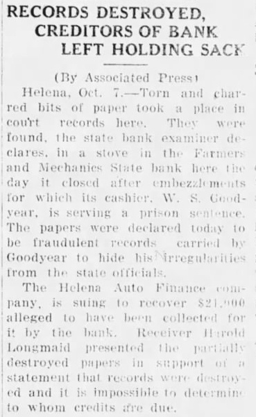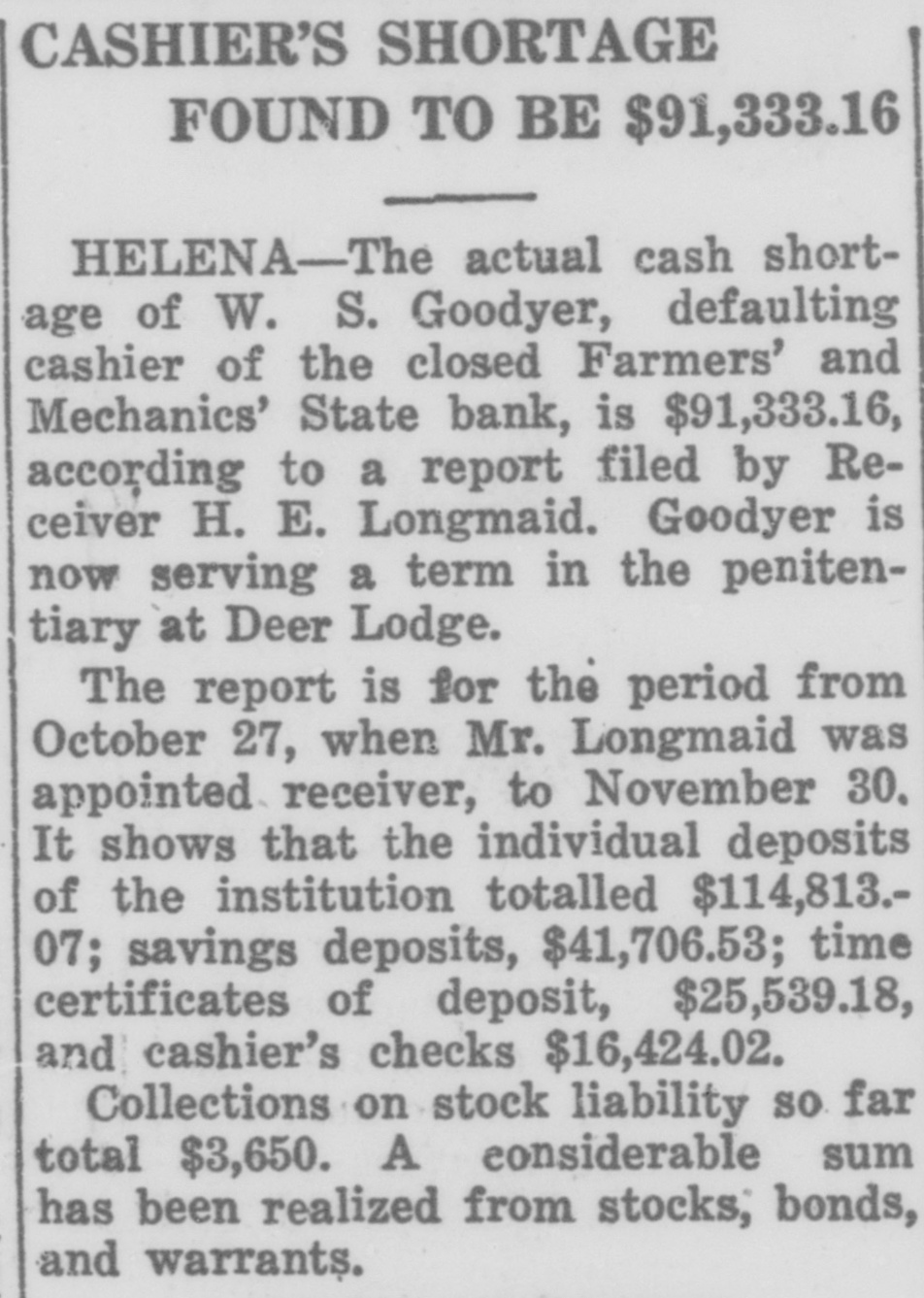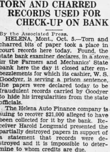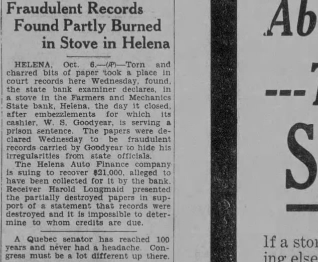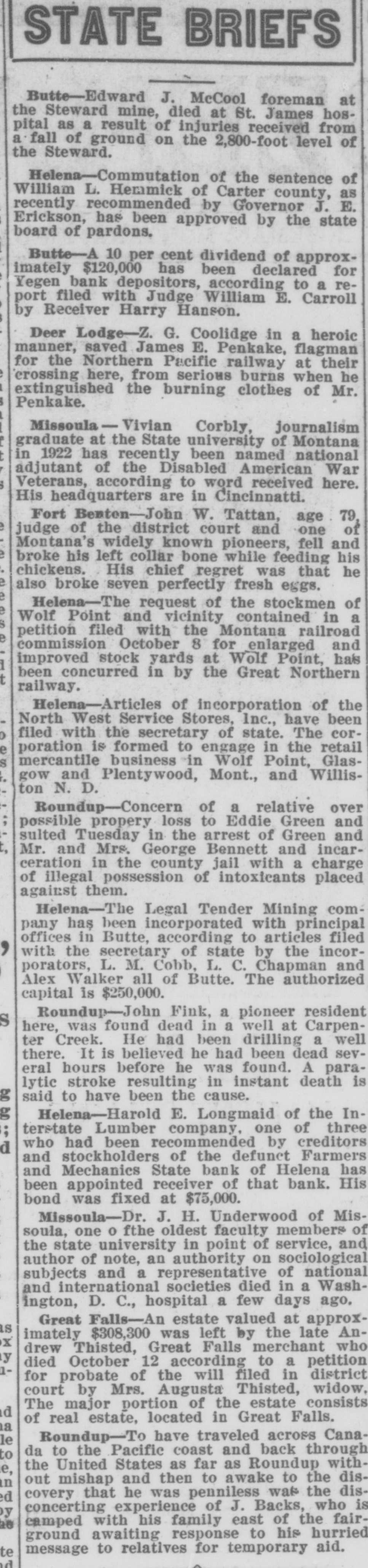 STATE BRIEFS Butte-Edward J. McCool foreman at the Steward mine, died at St. James hospital as a result of injuries received from a fall of ground on the 2,800-foot level of the Steward. Helena-Commutation of the sentence of William L. Hemmick of Carter county, as recently recommended by Governor J. E. Erickson, has been approved by the state board of pardons. Butte-A 10 per cent dividend of approximately $120,000 has been declared for Yegen bank depositors, according to a report filed with Judge William E. Carroll by Receiver Harry Hanson. Deer Lodge-Z. G. Coolidge in a heroic manner, saved James E. Penkake, flagman for the Northern Pacific railway at their crossing here, from serious burns when he extinguished the burning clothes of Mr. Penkake. Missoula - Vivian Corbly, journalism graduate at the State university of Montana in 1922 has recently been named national adjutant of the Disabled American War Veterans, according to word received here. His headquarters are in Cincinnatti. Fort Besten-John W. Tattan, age 79. judge of the district court and one of Montana's widely known pioneers, fell and broke his left collar bone while feeding his chickens. His chief regret was that he also broke seven perfectly fresh eggs. Helena-The request of the stockmen of Wolf Point and vicinity contained in a petition filed with the Montana railroad commission October 8 for enlarged and improved stock yards at Wolf Point, has | been concurred in by the Great Northern railway. Helena-Articles of incorporation of the North West Service Stores, Inc., have been filed with the secretary of state. The corporation is formed to engage in the retail mercantile business in Wolf Point, Glasgow and Plentywood, Mont., and Williston N. D. Roundup-Concern of a relative over possible propery loss to Eddie Green and sulted Tuesday in the arrest of Green and Mr. and Mrs. George Bennett and incarceration in the county jail with a charge of illegal possession of intoxicants placed against them. Helena-The Legal Tender Mining company has been incorporated with principal offices in Butte, according to articles filed with the secretary of state by the incorporators, L. M. Cobb, L. C. Chapman and Alex Walker all of Butte. The authorized capital is $250,000. Roundup-John Fink, a pioneer resident here, was found dead in a well at Carpenter Creek. He had been drilling a well there. It is believed he had been dead several hours before he was found. A paralytic stroke resulting in instant death is said to have been the cause. Helena-Harold E. Longmaid of the Interstate Lumber company, one of three who had been recommended by creditors and stockholders of the defunct Farmers and Mechanics State bank of Helena has been appointed receiver of that bank. His bond was fixed at $75,000. Missoula-Dr. J. H. Underwood of Missoula, one 0 fthe oldest faculty members of the state university in point of service, and author of note, an authority on sociological subjects and a representative of national and international societies died in a Washington, D. C., hospital a few days ago, Great Falls-An estate valued at approximately $308,300 was left by the late AnX drew Thisted, Great Falls merchant who y died October 12 according to a petition for probate of the will filed in district court by Mrs. Augusta Thisted, widow. The major portion of the estate consists d of real estate, located in Great Falls. a Roundup-To have traveled across Canale da to the Pacific coast and back through the United States as far as Roundup withdie,