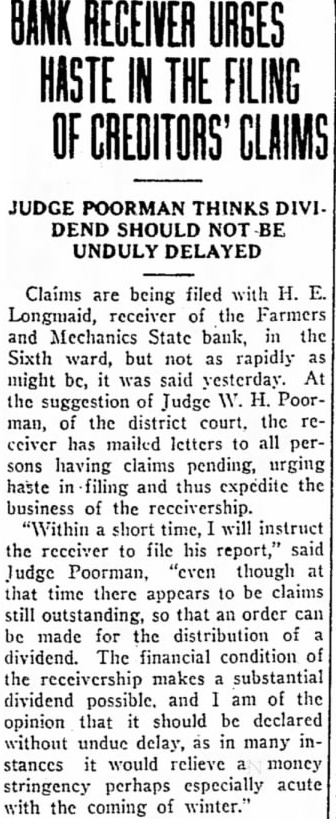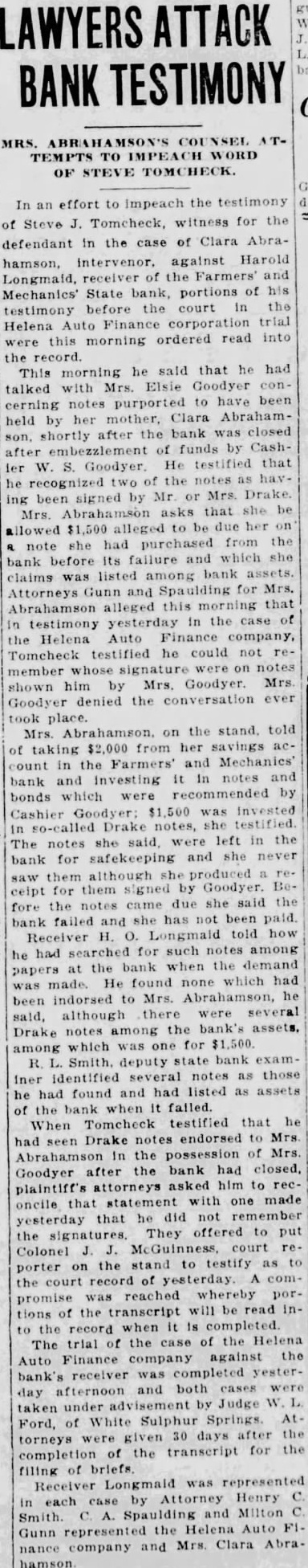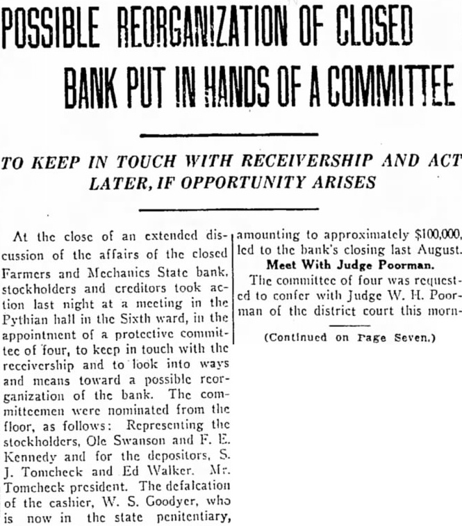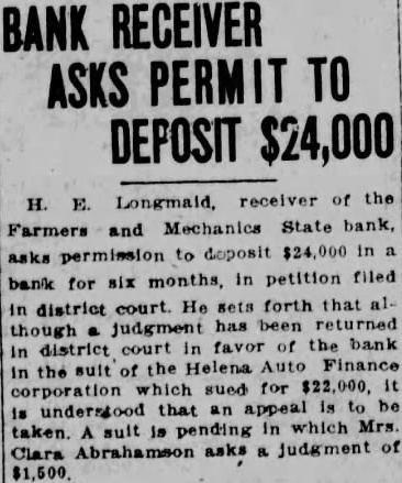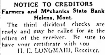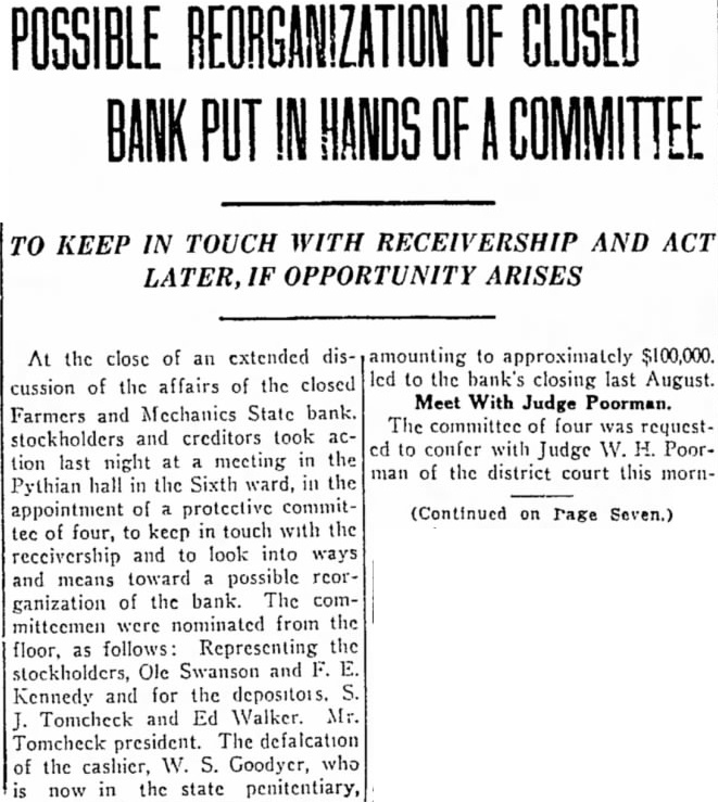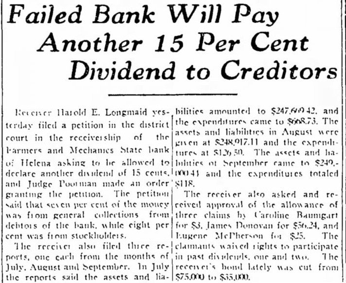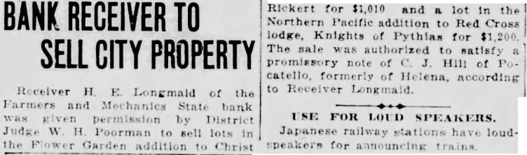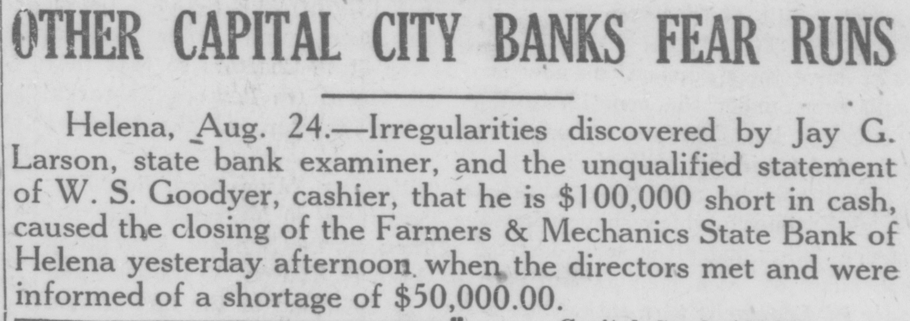 STATE BRIEFS Butte-Edward J. McCool foreman at the Steward mine, died at St. James hospital as a result of injuries received from a fall of ground on the 2,800-foot level of the Steward. Helena-Commutation of the sentence of William L. Hemmick of Carter county, as recently recommended by Governor J. E. Erickson, has been approved by the state board of pardons. Butte-A 10 per cent dividend of approximately $120,000 has been declared for Yegen bank depositors, according to a report filed with Judge William E. Carroll by Receiver Harry Hanson. Deer Lodge-Z. G. Coolidge in a heroic manner, saved James E. Penkake, flagman for the Northern Pacific railway at their crossing here, from serious burns when he extinguished the burning clothes of Mr. Penkake. Missoula - Vivian Corbly, journalism graduate at the State university of Montana in 1922 has recently been named national adjutant of the Disabled American War Veterans, according to word received here. His headquarters are in Cincinnatti. Fort Besten-John W. Tattan, age 79. judge of the district court and one of Montana's widely known pioneers, fell and broke his left collar bone while feeding his chickens. His chief regret was that he also broke seven perfectly fresh eggs. Helena-The request of the stockmen of Wolf Point and vicinity contained in a petition filed with the Montana railroad commission October 8 for enlarged and improved stock yards at Wolf Point, has | been concurred in by the Great Northern railway. Helena-Articles of incorporation of the North West Service Stores, Inc., have been filed with the secretary of state. The corporation is formed to engage in the retail mercantile business in Wolf Point, Glasgow and Plentywood, Mont., and Williston N. D. Roundup-Concern of a relative over possible propery loss to Eddie Green and sulted Tuesday in the arrest of Green and Mr. and Mrs. George Bennett and incarceration in the county jail with a charge of illegal possession of intoxicants placed against them. Helena-The Legal Tender Mining company has been incorporated with principal offices in Butte, according to articles filed with the secretary of state by the incorporators, L. M. Cobb, L. C. Chapman and Alex Walker all of Butte. The authorized capital is $250,000. Roundup-John Fink, a pioneer resident here, was found dead in a well at Carpenter Creek. He had been drilling a well there. It is believed he had been dead several hours before he was found. A paralytic stroke resulting in instant death is said to have been the cause. Helena-Harold E. Longmaid of the Interstate Lumber company, one of three who had been recommended by creditors and stockholders of the defunct Farmers and Mechanics State bank of Helena has been appointed receiver of that bank. His bond was fixed at $75,000. Missoula-Dr. J. H. Underwood of Missoula, one 0 fthe oldest faculty members of the state university in point of service, and author of note, an authority on sociological subjects and a representative of national and international societies died in a Washington, D. C., hospital a few days ago, Great Falls-An estate valued at approximately $308,300 was left by the late AnX drew Thisted, Great Falls merchant who y died October 12 according to a petition for probate of the will filed in district court by Mrs. Augusta Thisted, widow. The major portion of the estate consists d of real estate, located in Great Falls. a Roundup-To have traveled across Canale da to the Pacific coast and back through the United States as far as Roundup withdie,
