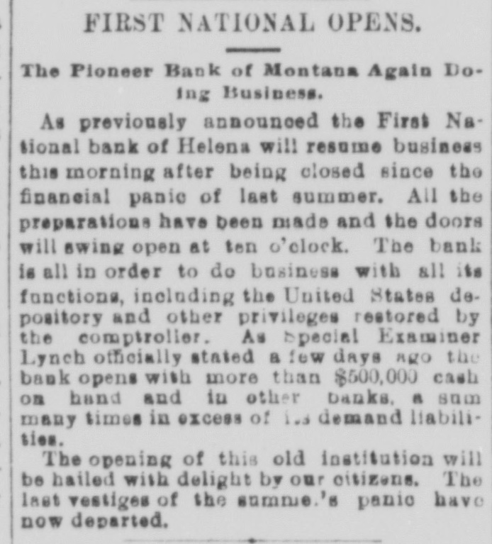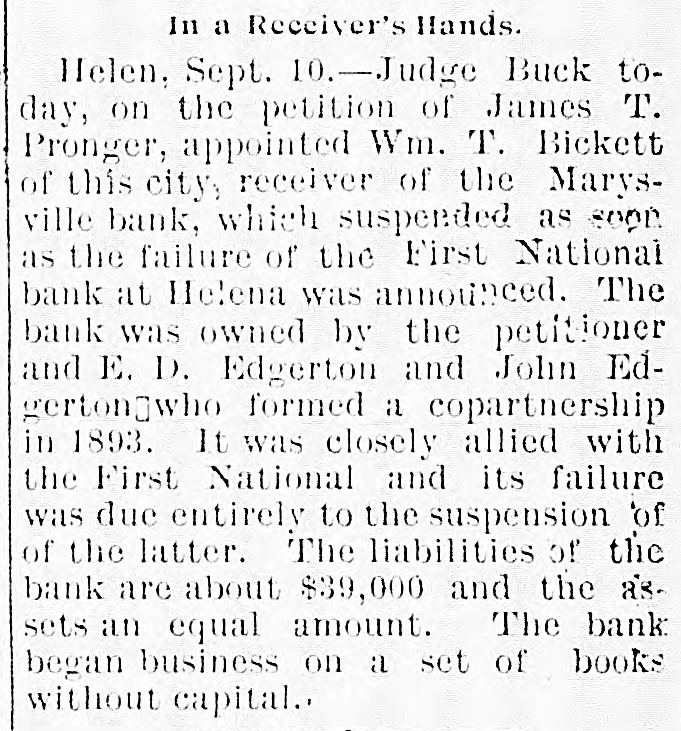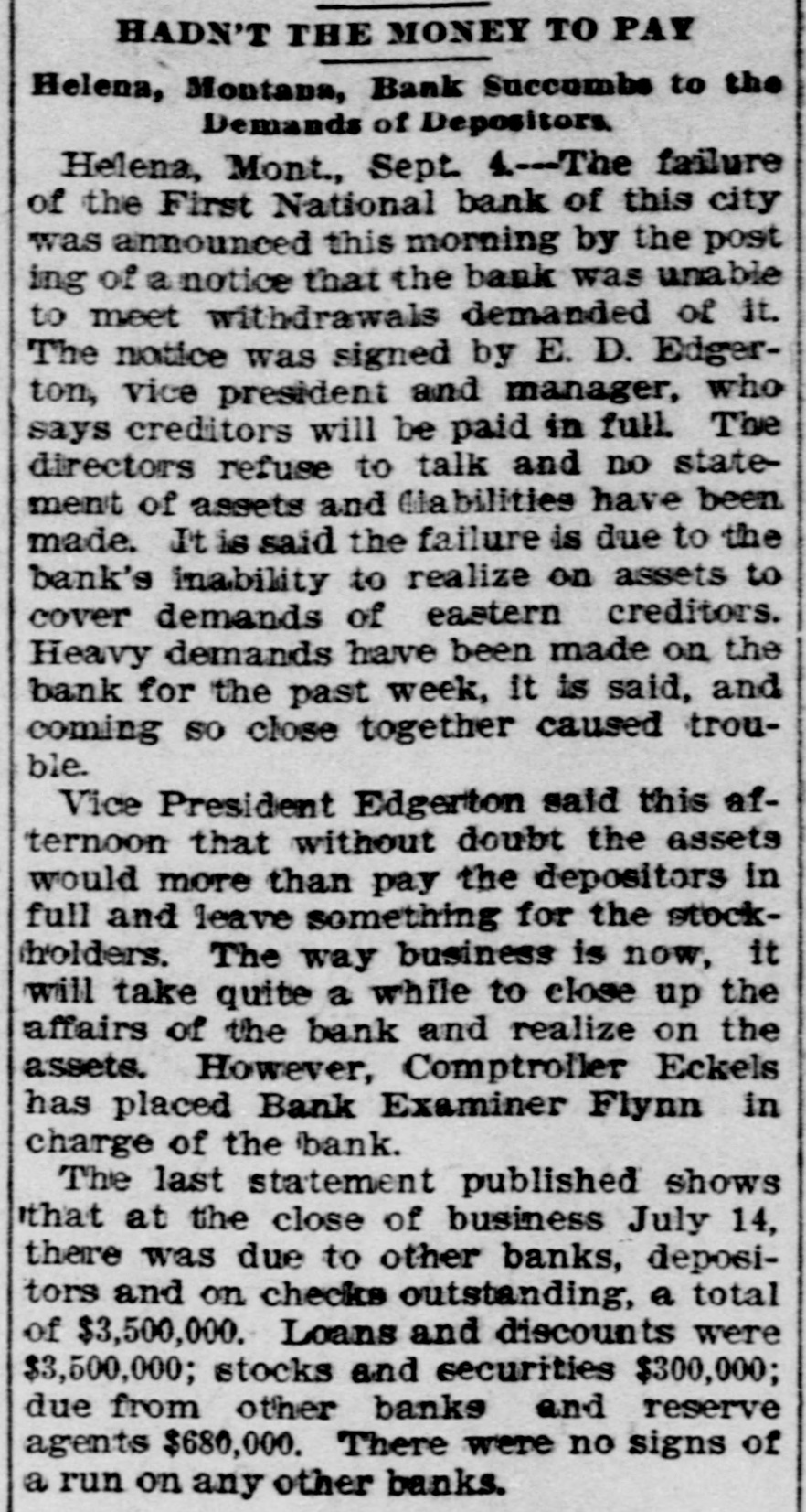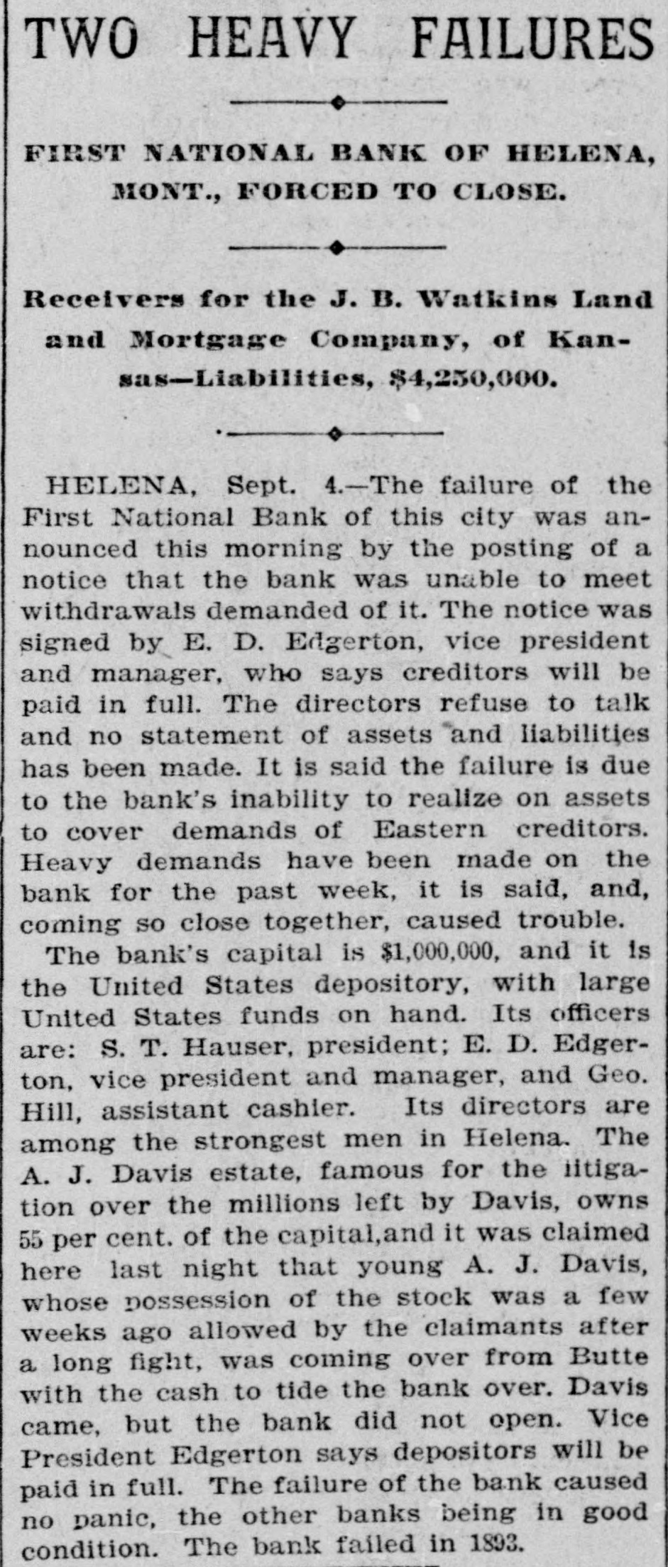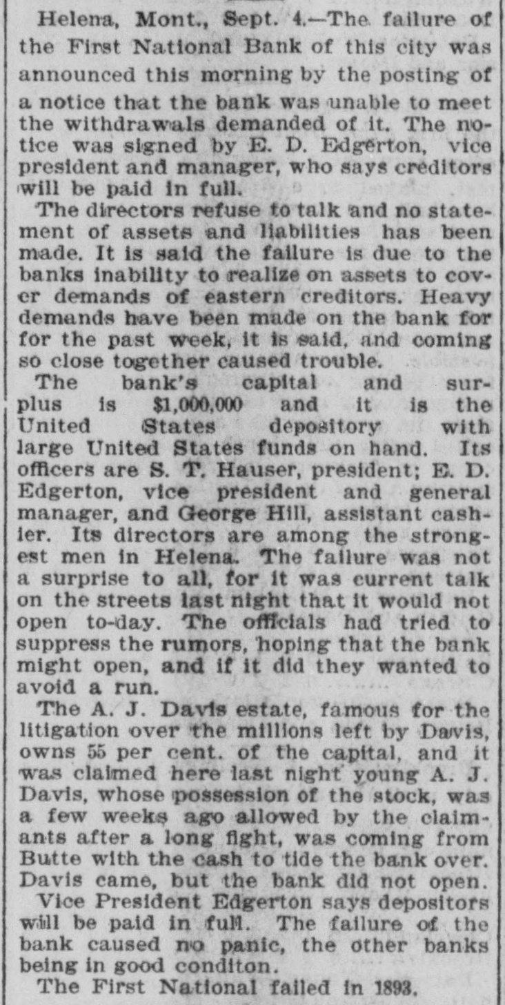 MONTANA BANKS CLOSED. A Run in Progress at Helena-Assignments of Business Men-Other Banks Fail to Open Their Doors. HELENA, Mon, July 27.-The First National and Montana National banks failed to open this morning. A run is now in progress on the other banks of the city. C. W. Cannon, a local dealer in real estate, assigned yesterday. He wasa large endorser on corporation paper, and stringency of the money market caused the assignment. The liabilities are $240,000; assets, $1,500,000. A M. Halper also made a personal as signment. He, too, was a heavy endorser of corporation paper. His liabilities are $600,000; assets, $1,000,000. The Halper Hardware company, of which he is president, is not affected by the assignment. MOUNT STERLING, Ky., July 27.-The new Farmers' bank here failed to open its doors this morning, owing to a heavy run during the past week. All depositors will be paid in full. The capital stock is $250,000, and the bank was supposed to be one of the strongest in Kentucky. EXETER, N. H., July 27.-The National Granite State bank temporarily suspended payment this morning. The institution is declared by officials to be perfectly sound, the present embarrassment having been caused by a drainage of the cash supply and delayed remittances from Boston. An immediate resumption of business is expected. PORTAGE, Wis., July 27.-The City bank closed its doors this morning. The suspension is due to the condition of the money market. PORTLAND, Ore., July 27.-The Oregon National bank and the Northwest Loan & Trust company of this city suspended this morning. George B. Markle is president of both institutions. The capital stock of the Oregon National is $200,000; surplus, g $40,000; average deposits $500,000. Capiy tal stock of the Northwest Loan & Trust company $250,000; surplus $25,000. Rev. O. D. Taylor, manager of the In8 terstate Investment company at The Dalles has been arrested on a charge of embezzlement. It is alleged that Taylor is short $50,000 in his accounts.