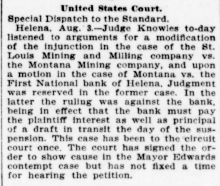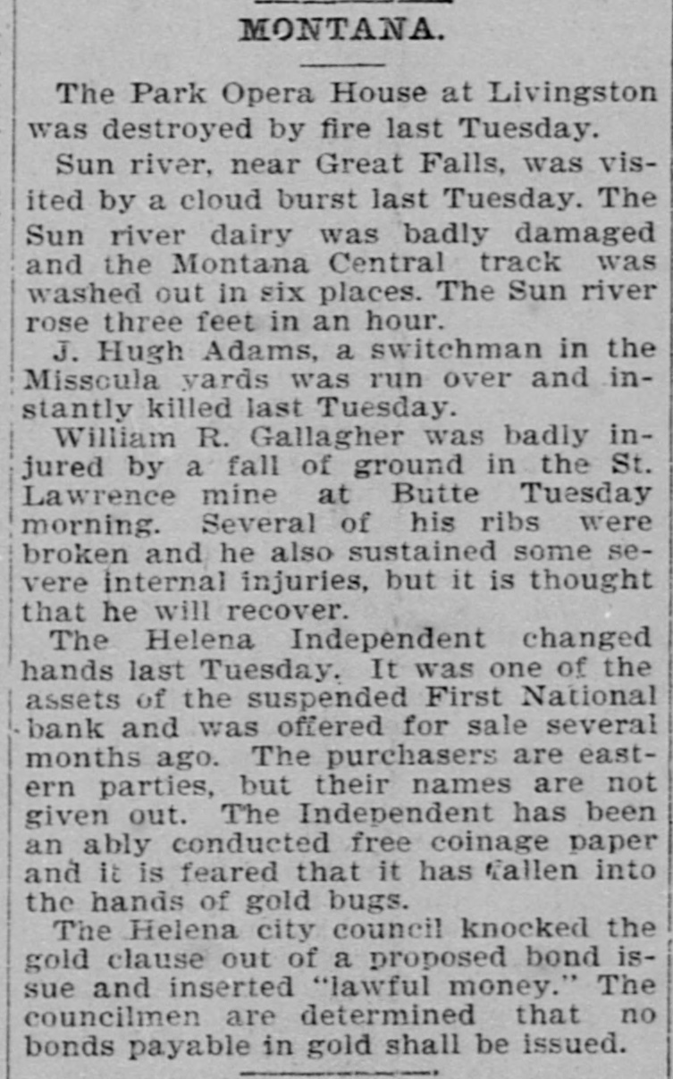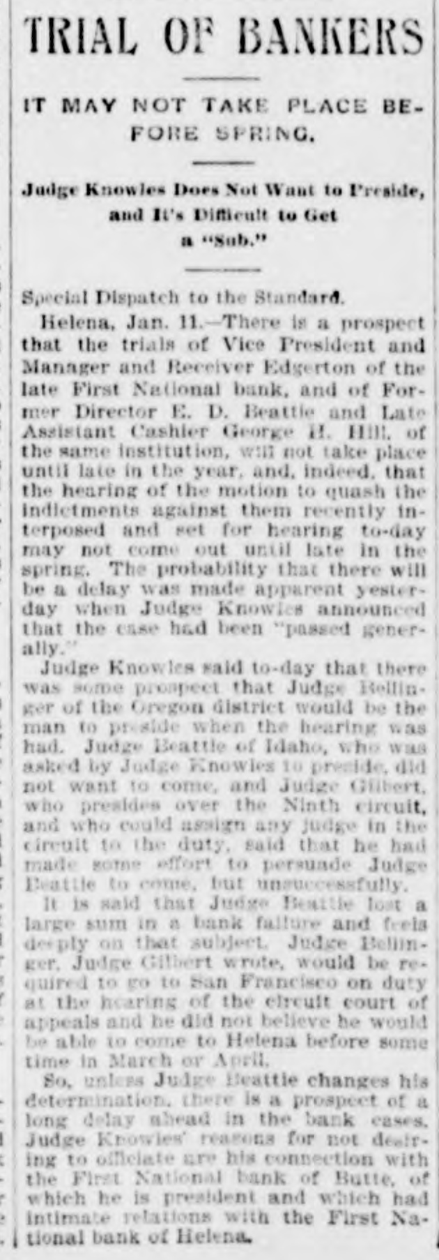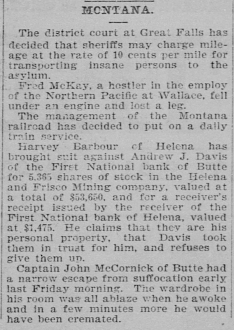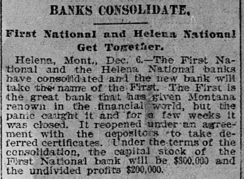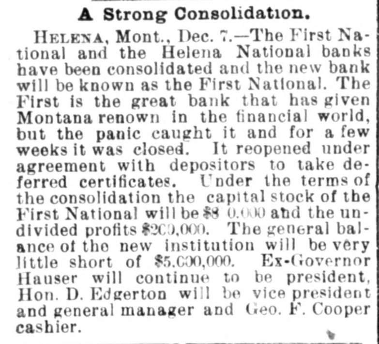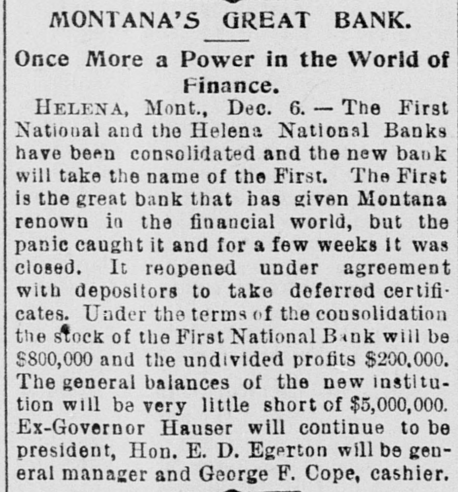 MONTANA BANKS CLOSED. A Run in Progress at Helena-Assignments of Business Men-Other Banks Fail to Open Their Doors. HELENA, Mon, July 27.-The First National and Montana National banks failed to open this morning. A run is now in progress on the other banks of the city. C. W. Cannon, a local dealer in real estate, assigned yesterday. He wasa large endorser on corporation paper, and stringency of the money market caused the assignment. The liabilities are $240,000; assets, $1,500,000. A M. Halper also made a personal as signment. He, too, was a heavy endorser of corporation paper. His liabilities are $600,000; assets, $1,000,000. The Halper Hardware company, of which he is president, is not affected by the assignment. MOUNT STERLING, Ky., July 27.-The new Farmers' bank here failed to open its doors this morning, owing to a heavy run during the past week. All depositors will be paid in full. The capital stock is $250,000, and the bank was supposed to be one of the strongest in Kentucky. EXETER, N. H., July 27.-The National Granite State bank temporarily suspended payment this morning. The institution is declared by officials to be perfectly sound, the present embarrassment having been caused by a drainage of the cash supply and delayed remittances from Boston. An immediate resumption of business is expected. PORTAGE, Wis., July 27.-The City bank closed its doors this morning. The suspension is due to the condition of the money market. PORTLAND, Ore., July 27.-The Oregon National bank and the Northwest Loan & Trust company of this city suspended this morning. George B. Markle is president of both institutions. The capital stock of the Oregon National is $200,000; surplus, g $40,000; average deposits $500,000. Capiy tal stock of the Northwest Loan & Trust company $250,000; surplus $25,000. Rev. O. D. Taylor, manager of the In8 terstate Investment company at The Dalles has been arrested on a charge of embezzlement. It is alleged that Taylor is short $50,000 in his accounts.