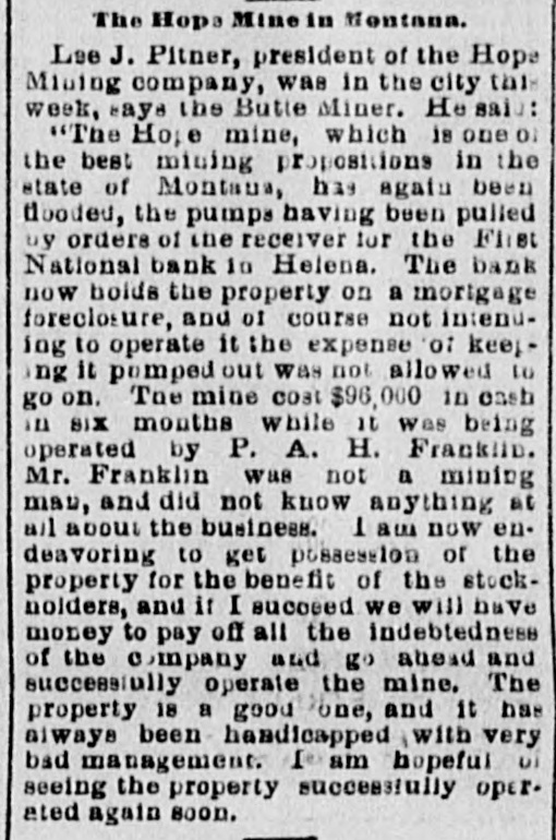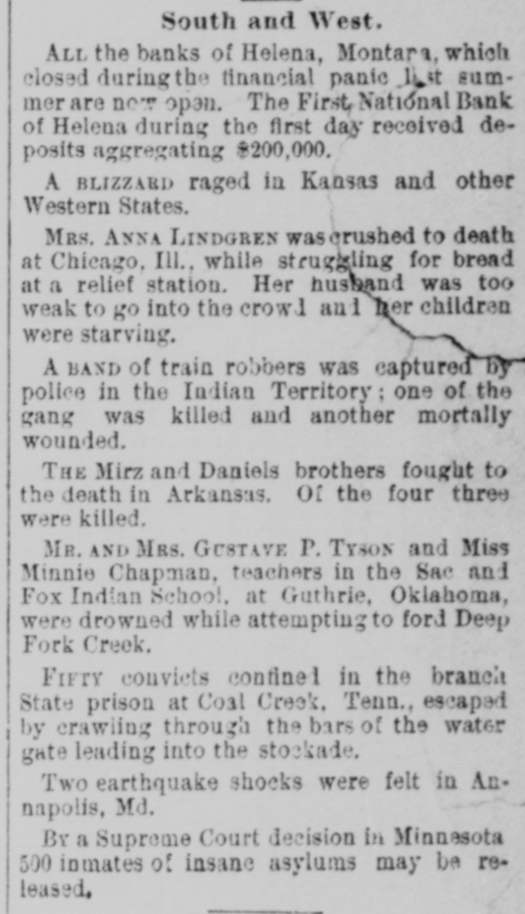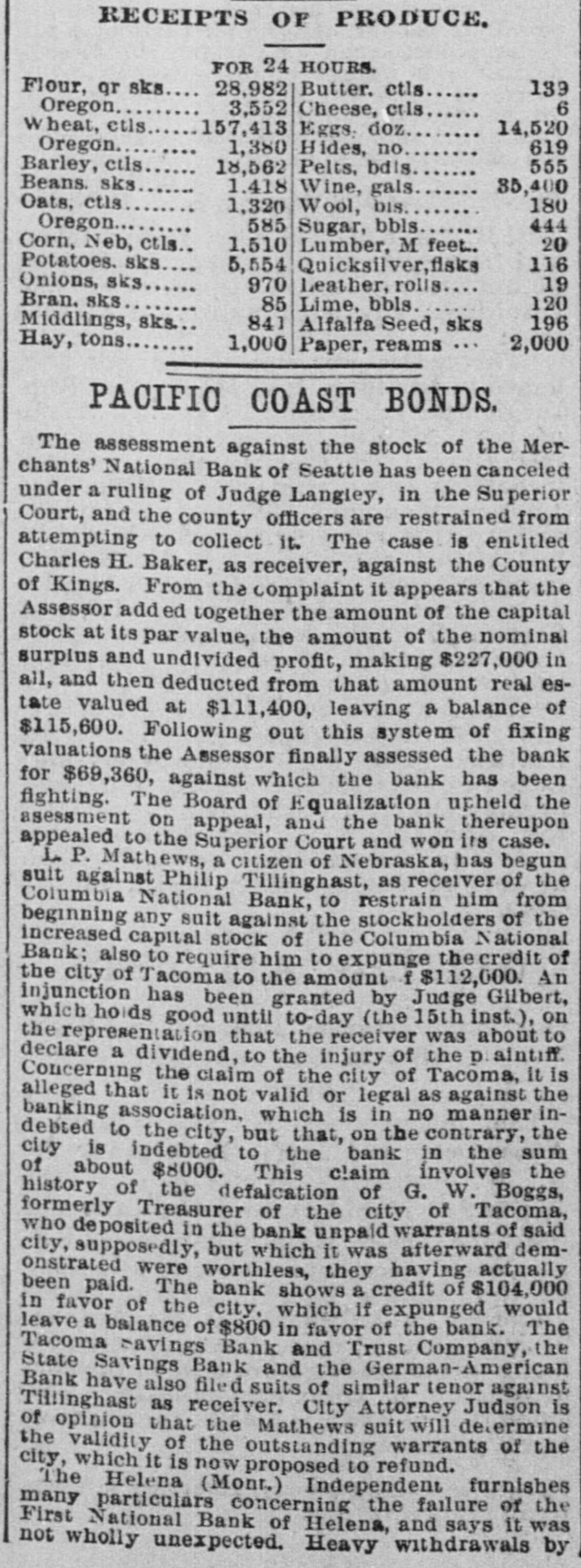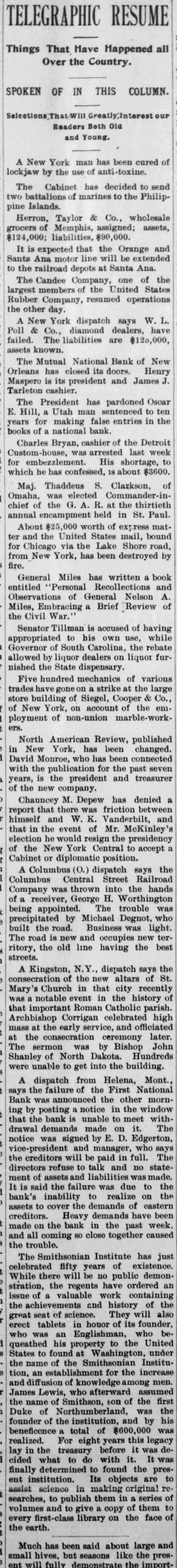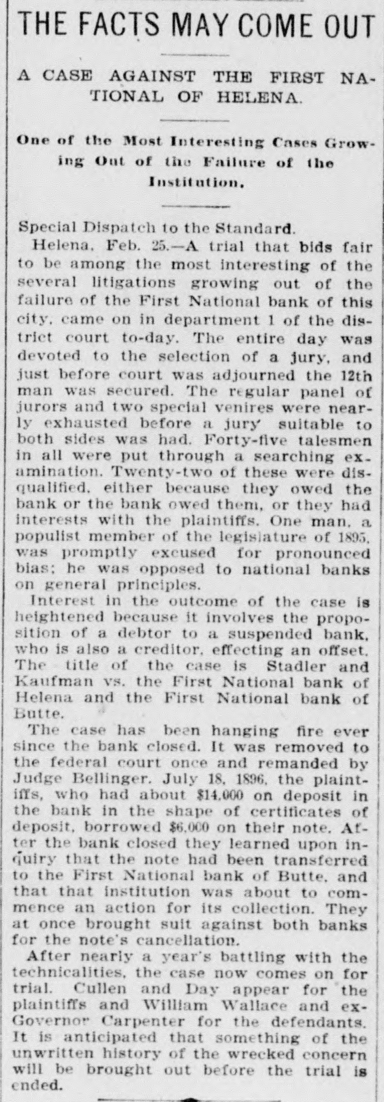 MONTANA BANKS CLOSED. A Run in Progress at Helena-Assignments of Business Men-Other Banks Fail to Open Their Doors. HELENA, Mon, July 27.-The First National and Montana National banks failed to open this morning. A run is now in progress on the other banks of the city. C. W. Cannon, a local dealer in real estate, assigned yesterday. He wasa large endorser on corporation paper, and stringency of the money market caused the assignment. The liabilities are $240,000; assets, $1,500,000. A M. Halper also made a personal as signment. He, too, was a heavy endorser of corporation paper. His liabilities are $600,000; assets, $1,000,000. The Halper Hardware company, of which he is president, is not affected by the assignment. MOUNT STERLING, Ky., July 27.-The new Farmers' bank here failed to open its doors this morning, owing to a heavy run during the past week. All depositors will be paid in full. The capital stock is $250,000, and the bank was supposed to be one of the strongest in Kentucky. EXETER, N. H., July 27.-The National Granite State bank temporarily suspended payment this morning. The institution is declared by officials to be perfectly sound, the present embarrassment having been caused by a drainage of the cash supply and delayed remittances from Boston. An immediate resumption of business is expected. PORTAGE, Wis., July 27.-The City bank closed its doors this morning. The suspension is due to the condition of the money market. PORTLAND, Ore., July 27.-The Oregon National bank and the Northwest Loan & Trust company of this city suspended this morning. George B. Markle is president of both institutions. The capital stock of the Oregon National is $200,000; surplus, g $40,000; average deposits $500,000. Capiy tal stock of the Northwest Loan & Trust company $250,000; surplus $25,000. Rev. O. D. Taylor, manager of the In8 terstate Investment company at The Dalles has been arrested on a charge of embezzlement. It is alleged that Taylor is short $50,000 in his accounts.