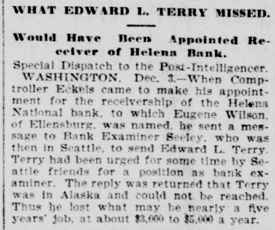 WHAT EDWARD L. TERRY MISSED. Would Have Been Appointed Receiver of Helena Bank. Special Dispatch to the Post-Intelligencer. WASHINGTON Dec. 3.-When Comptroller Eckels came to make his appointment for the receivership of the Helena National bank. to which Eugene Wilson, of Ellensburg, was named. he sent a message to Bank Examiner Seeley, who was then in Seattle, to send Edward L. Terry Terry had been urged for some time by Seattle friends for a position as bank examiner. The reply was returned that Terry was in Alaska and could not be reached. Thus he lost what may be nearly a five years' job, at about $3,000 to $5,000 a year.