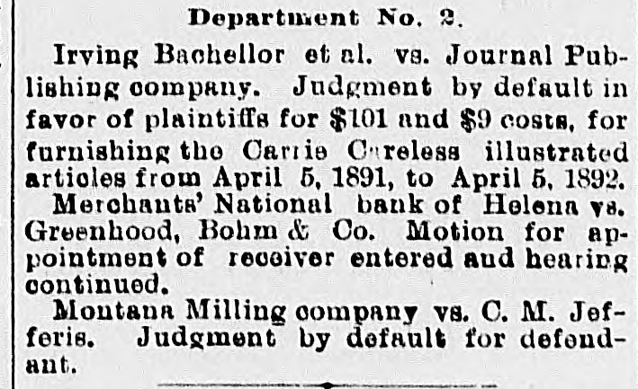 Department No. 2. Irving Bachellor et al. VS. Journal Publishing company. Judgment by default in favor of plaintiffs for $101 and $9 costs, for furnishing the Carrie Careless illustrated articles from April 5, 1891, to April 5. 1892. Merchants' National bank of Helena vs. Greenhood, Bohm & Co. Motion for appointment of receiver entered and hearing continued. Montana Milling company vs. C. M. Jefferis. Judgment by default for defendant.