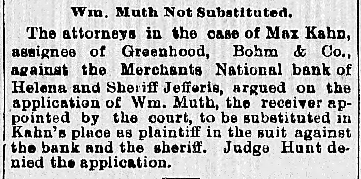 Wm. Muth Not Substituted. The attorneys in the case of Max Kahn, assignee of Greenhood, Bohm & Co., against the Merchants National bank of Helena and Sheriff Jefferis, argued on the application of Wm. Muth, the receiver appointed by the court, to be substituted in Kahn's place as plaintiff in the suit against the bank and the sheriff. Judge Hunt denied the application.