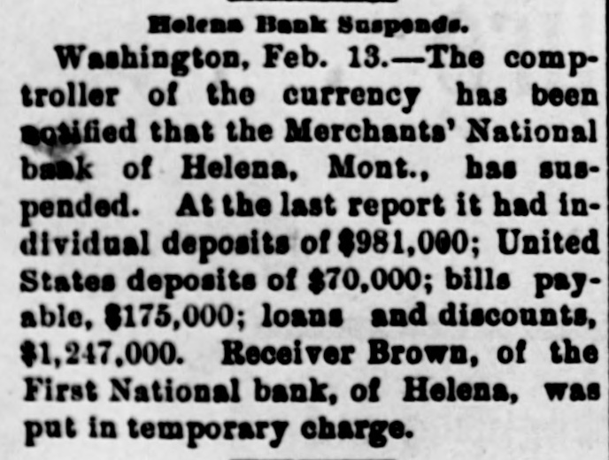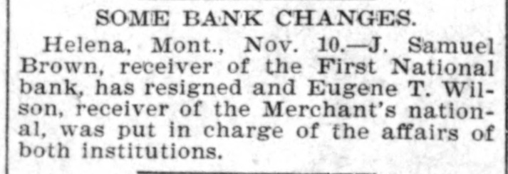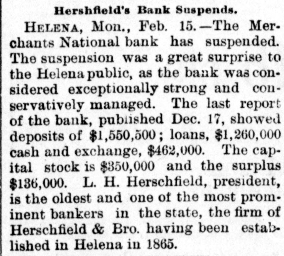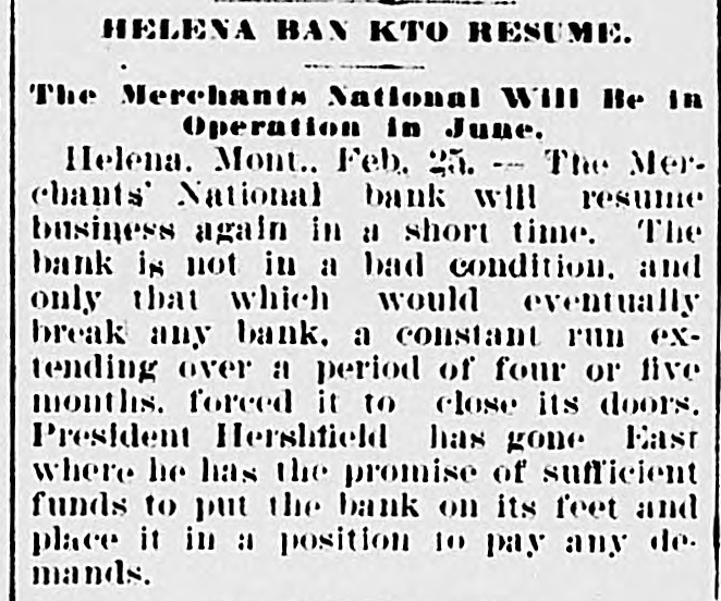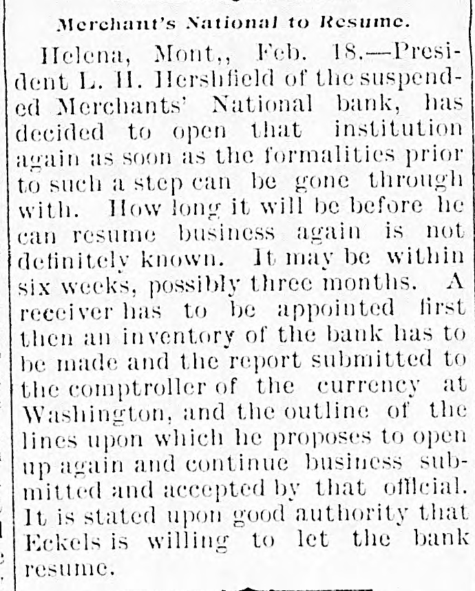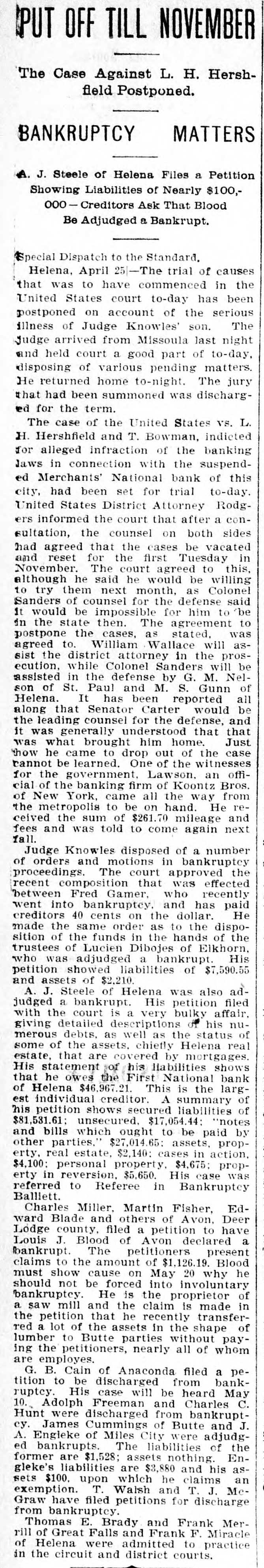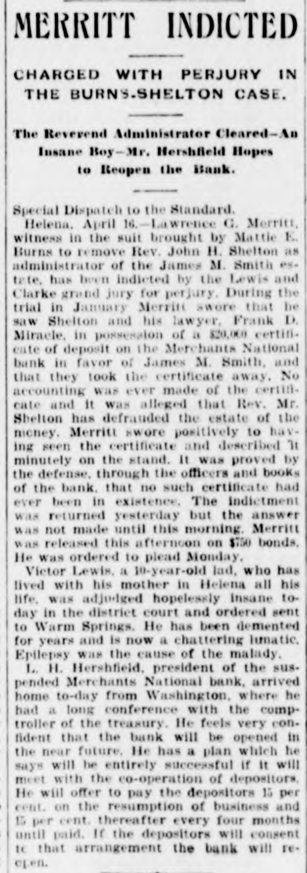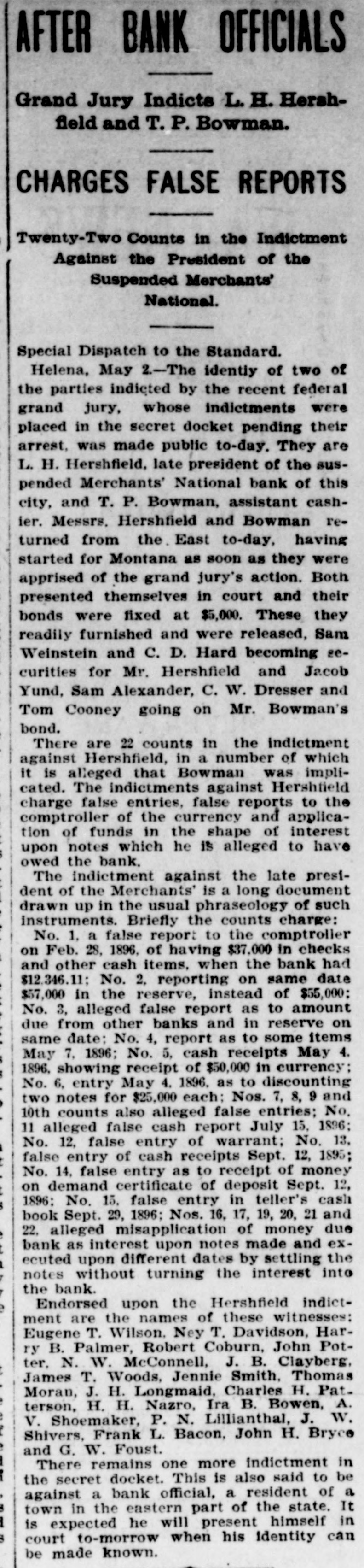 Helena, May 2-The idently of two of the parties indicted by the recent federal grand jury, whose indictments were placed in the secret docket pending their arrest, was made public to-day. They are L. H. Hershfield, late president of the suspended Merchants' National bank of this city, and T. P. Bowman, assistant cashier. Messrs. Hershfield and Bowman returned from the East to-day, having started for Montana as soon as they were apprised of the grand jury's action. Both presented themselves in court and their bonds were fixed at $5,000. These they readily furnished and were released, Sam Weinstein and C. D. Hard becoming securities for Mr. Hershfield and Jacob Yund, Sam Alexander, C. W. Dresser and Tom Cooney going on Mr. Bowman's bond.