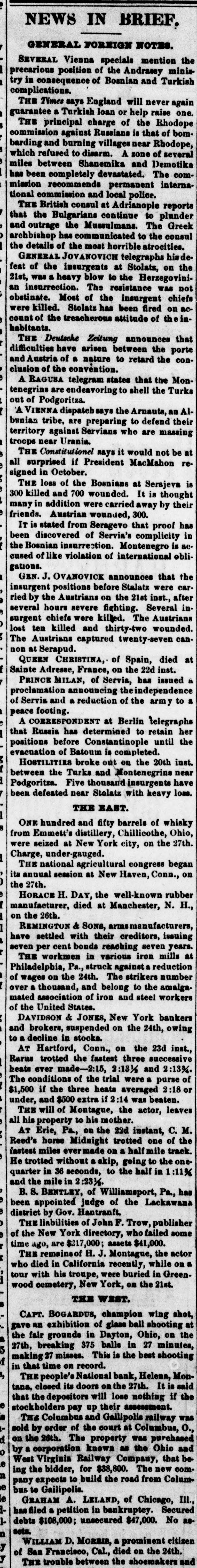 NEWS IN BRIEF, GENERAL FOREIGN NOTES. mention SEVERAL Vienna specials the Andrassy try in precarious consequence position of of Bosnian complications. never again says England will help raise one THE Times a Turkish loan or of the Rhodope guarantee principal charge is that of bomburning zone of barding commission THE and against disarm. Russians villages A near Demotika Rhodope, several The which refused to Shanemika and comrecommends has miles been between completely devastated. permanent internaBritish mission commission and local Adrianople police. reports tional consul at to plunder THE the Bulgarians continue The Greek that Mussulmans. the consul has most hisde archbishop and outrage the communicated to strocities. feat details of the telegraphs the the GENERAL of the heavy insurgents JOVANOVICH blow to resistance at the Stolats, Herzegovin was on not 21st, was The chiefs the count of Stolatz has attitude of the were killed. obstinate. an insurrection. Most treacherous of the been insurgent fired on in- ac. that announces habitants. Deuloche Zeitung between the porte conAustria difficulties THE have of a arisen nature to retard the and of the convention. the that Mon clusion A Ragusa are telegram indeavoring states shell the Turks Al an tenegrins of Podgoriza says the Arnauts, out VIENNA dispatch to defend their territory against benian A tribe, are Servians preparing who are massing near Urania it be at not would surprised troops THE Constitutionel if President nays MacMahon signed all in loss October. of the Bosnians at It Serajeva is thought 300 THE killed and 700 wounded. carried away by their has many in addition Austrian wounded, that 300. proof friends. IT is stated from of Seragevo Servia's complicity in of like discovered Montenegro obli cused been the Bosnian insurrestion violation of international the that announces gations. GEN. J. OVANOVICE before Stalatz inst., were after car insurgent by the positions Austrians fighting. the 21st Several Austrians in several ried hours severe killed. The wounded Austrians lost ten killed captured surgent chiefs we and thirty-two twenty-seven The non at Serapud. died Spain, Adresse, CHRISTINA, of on the 22d inst. Servis, QUEEN France, has issued of Servin Sainte proclama PRINCE and MILAN, announcing a reduction of of the the independence army peace footing. at Berlin to retain telegraphe her of that A Russia has Constantinople until the inst. positions before Batoum is completed. the 20th evacuation HOSTILITIES Turks broke and Montenegrins insurgents have near been defeated between the thousand loss. Pedgoritza. Five near Stolatz with heavy THE EAST. 1 of whisky ONE hundred distillery, and fifty barrels Chillicothe, the Ohio, 27th. I from seized Emmett's at New York city, on began its on were Charge, under gauged. tural congress the THE annual national session agricultur at New Haven, Conn., rubber manufacturer, on the 26th. HORACE 27th. H. DAY, died the at Manchester, well-known N. H., & SONS, their creditors, issuing years. with seven at have REMINGTON settled per cent bonds in various reaching iron mills seven workmen againsta reduction THE Pa. struck e strikers number over Philadelphia, 24th. to the amalga association of wages a thousand, on the and of iron belong and steel workers mated United States. York bankers brokers, of DAVIDSON the & suspended JONES, New on the 24th, owing on the 23d inst., and to a decline in stocks. Conn., successive AT Hartford, the fastest three and 2:133.4 Rarus trotted 2:15, 2:13 1/2 purse heats ever made- of the trial averaged were 2:18 The conditions if the three heats 2:14 beaten. under, $1,500 and $500 Montague, extra if the actor, leaves THE will of to mother. M. c. all his on the one of Reed's overmade AT Erie, property horse Pa, Midnight on trotted 22d instant, mile the track one the fastest miles a skip, going in 1:11% He trotted in 36 without seconds, to the half has quarter the mile in 2:23 1/2 Williamsport, Pa. appointed and B.S. BENTLEY, judge of of the Lackawana district been liabilities by Gov. Hantrant of John F. who Trow, failed publisher some THE York directory, assets $41,000. actor the New $217,000; the time of ago, are H. J. Montague, while on wood THE died remain in California were recently, buried in Greenwho the 21st. tour with cemetery, his troupe, New York, on 6 THE WEST. shot, BOGARDUS, champion ball shooting wing a CAPT. exhibition of glass Ohio, on the 27th, 5 27 gavenn grounds in balls Dayton, in 27 minutes, misses. the fair breaking 375 This is the best shooting , Mon f making that time on record. bank, Helena, It is said e closed its doors will lose nothing if is in tana, THE PEOPLE'S depositors National assessment. 27th. the THE that the pay up their Gallipolis railway of the stockholders Columbu and court at Columbus, purchased sold by order The property was Ohio and e d comn Columby on the corporation Virginia 26th. Railway known $38,800. Company, as the The new that be e le ing the West bidder, to for build the road from III., 1pany bus to expects Gailipolis. LELAND, of Chicago, Secured 1debts $108,000; n has GRAHAM filed a petition A. unsecured in bankruptcy. $47,000. No as citizen prominent y y THE of San trouble Francisco, between the shoemakers sets. WILLIAM D. MORRIS, Cal., died a on the 24th. and
