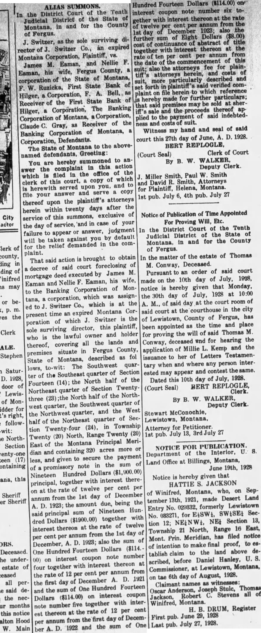 ALIAS SUMMONS. In the District Court of the Tenth Judicial District of the State of Montana, in and for the County of Fergus. J. Switzer, as the sole surviving director of J. Switzer Co., an expired Montana Corporation, Plaintiff, V8. James M. Eaman, and Nellie F. Eaman, his wife, Fergus County, a corporation of the State of Montana, F. W. Ruzicka, First State Bank of Hilger, a Corporation, F. A. Bell, as Receiver of the First State Bank of Hilger, a Corporation, The Banking Corporation of Montana, Corporation, Claude C. Gray, as Receiver of the Banking Corporation of Montana, a Corporation, Defendants. The State of Montana to the abovenamed defendants, Greeting: You are hereby summoned to answer the complaint in this action which is filed in the office of the clerk of this court, a copy of which is herewith served upon you, and to file your answer and serve a copy thereof upon the plaintiff's attorneys herein within twenty days after the service of this summons, exclusive of the day of service, 'and in case of your failure to appear or answer, judgment will be taken against you by default for the relief demanded in the complaint. That said action is brought to obtain a decree of said court foreclosing of mortgage deed executed by James M. Eaman and Nellie F. Eaman, his wife, to the Banking Corporation of Montana, a corporation, which was assigned to J. Switzer Co., which is at the present time an expired Montana Corporation of which J. Switzer is the sole surviving director, this plaintiff, who is the lawful owner and holder thereof, covering all the lands and premises situate in Fergus County, State of Montana, described as fol lows, to-wit: The Southwest quarter of the Southeast quarter of Section Fourteen (14); the North half of the Northeast quarter of Section Twentythree (23);the North half of the Northwest quarter, the Southwest quarter of the Northwest quarter, and the West half of the Northeast quarter of Section Twenty-four (24), in Township Twenty (20) North, Range Twenty (20) East of the Montana Principal Meridian and containing 320 acres more or less, and given to secure the payment of a promissory note in the sum of Nineteen Hundred Dollars ($1,900.00) principal, together with interest thereon at the rate of twelve per cent per annum from the 1st day of December A. D. 1923; the amount due, being the said principal sum of Nineteen Hundred Dollars ($1900.00) together with interest thereon at the rate of twelve per cent per annum from the 1st day of December, A. D. 1923; also the sum of One Hundred Fourteen Dollars ($114. 00) on interest coupon note number four together with interest thereon at the rate of 12 per cent per annum from the first day of December A. D. 1921 and the sum of One Hundred Fourteen Dollars ($114.00) on interest coupon note number five together with interest thereon at the rate of 12 per cent per annum from the first day of December A. D. 1922 and the sum of One Hundred Fourteen Dollars ($114.00) one interest coupon note number six together with interest thereon at the rate of twelve per cent per annum from the 1st day of December 1923; also the further sum of Eight Dollars ($8.00) cost of continuance of abstract of title together with interest thereon at the rate of ten per cent per annum from the date of the commencement of this suit; also the attorneys fee for plaintiff's attorneys herein, and costs of suit, more particularly described and set forth in plaintiff's said verified complaint on file herein to which reference hereby made for further particulars; that said premises may be sold at sheriff's sale and the proceeds thereof applied to the payment of said indebtedness and costs suit. Witness my hand and seal of said court this 27th day of June, A. D. 1928. BERT REPLOGLE, Clerk of Court (Court Seal) By B. W. WALKER, Deputy Clerk. J. Miller Smith, Paul W. Smith and David R. Smith, Attorneys for Plaintiff, Helena, Montana. 1st pub. July 6, 4th pub. July 27 Notice of Publication of Time Appointed For Proving Will, Etc. In the District Court of the Tenth Judicial District of the State of Montana, in and for the County of Fergus. In the matter of the estate of Thomas M. Conway, Deceased. Pursuant to an order of said court made on the 10th day of July, 1928, notice is hereby given that Monday, the 30th day of July, 1928 at 10:00 A. M., of said day at the court room of said court at the courthouse in the city of Lewistown, County of Fergus, has been appointed as the time and place for proving the will of said Thomas M. Conway, deceased and for hearing the application of Millie L. Kemp and the issuance to her of Letters Testamentary when and where any person interested may appear and contest the same. Dated this 10th day of July, 1928. (Court Seal) BERT REPLOGLE, Clerk. By B. W. WALKER, Deputy Clerk. Stewart McConochie, Lewistown, Montana, Atterney for Petitioner. 1st pub. July 13, July 27 NOTICE FOR PUBLICATION. Department of the Interior, U. S. Land Office at Billings, Montana, June 19th, 1928 Notice is hereby given that HATTIE S. JACKSON of Winifred, Montana, who, on September 13th, 1921, made Desert Land Entry No. 029332, formerly Lewistown tion 12; NE+NW+, NE+ Section 13, Township 21 North, Range 16 East, Mont. Prin. Meridian, has filed notice of intention to make final proof, to establish claim to the land above described, before Daniel Hanley, U. S. Commissioner, at Lewistown, Montana, on tae 6th day of August, 1928. Claimant names as witnesses: Oscar Anderson, Joseph Stule, Thomas Jackson, Robert C. Stevens all of Winifred, Montana. H. B. DRUM, Register First pub. June 29, 1928 Last pub. July 27, 1928.