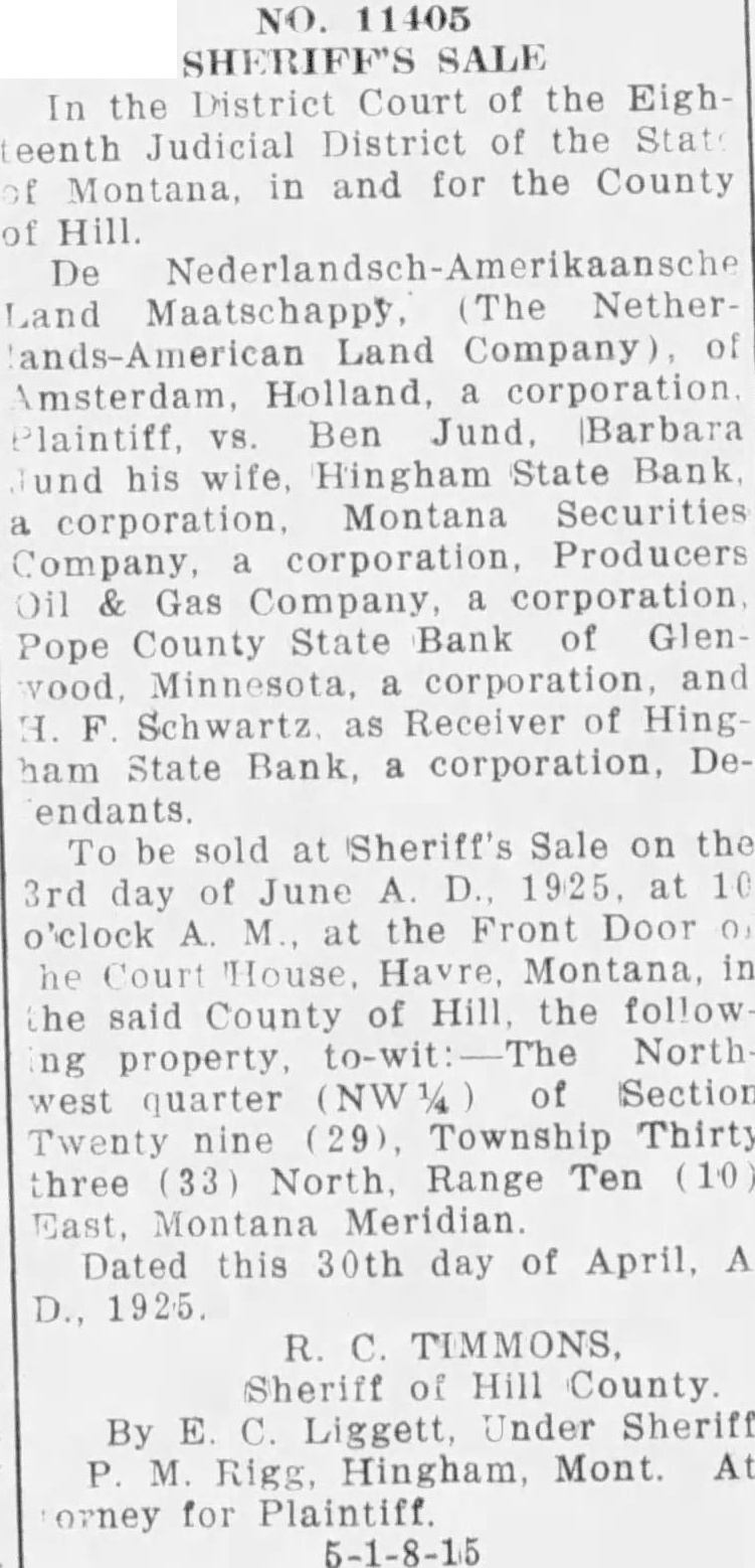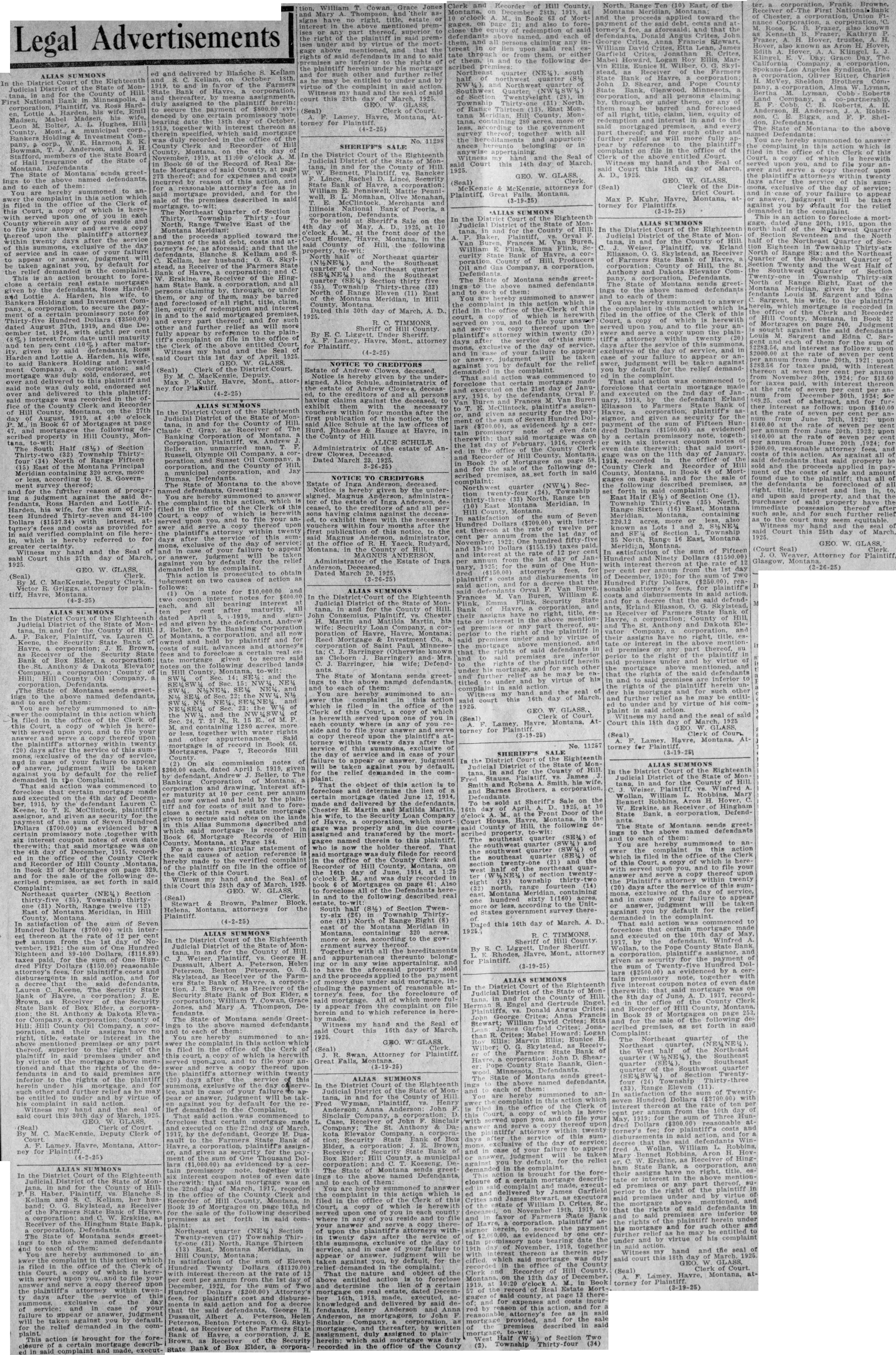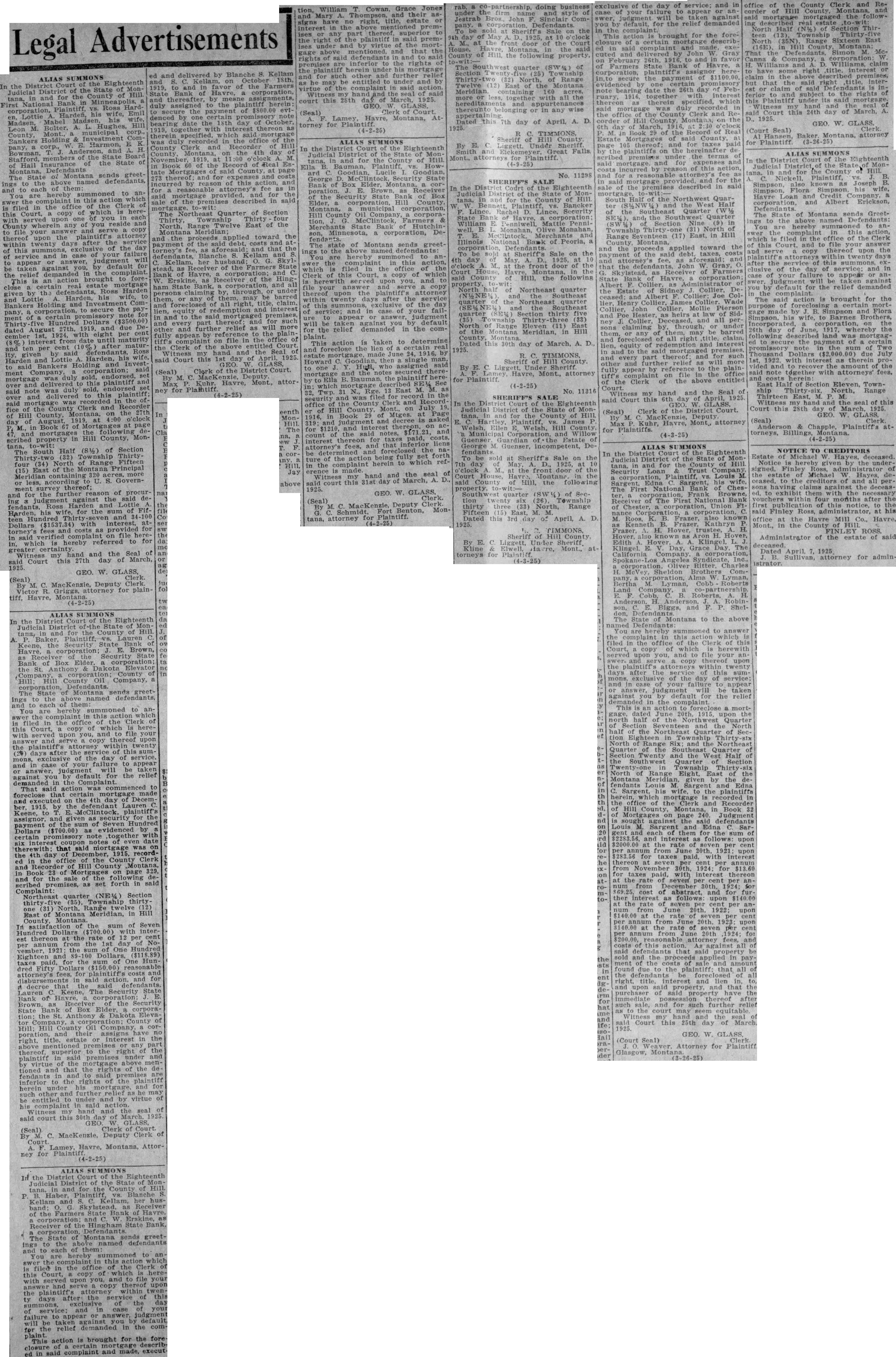 Legal Advertisements ALIAS SUMMONS Eighteenth In the the State MonDistrict of Judicial and for the County of Hill National Bank First Ross HardPlaintiff, corporation, his wife, Emil Lottle Harden, wife, Madsen, Mabel Hughes, Hill Leon M. Bolter, Mont., municipal corp., County, Holding Investment Bankers Harmon, pany, Bowman, corp., Stafford, of the Board Insurance the State Hail The State of Montana greetto this action filed in the office the herethis Court, one each reside and file your plaintiff's attorney thereof upon twenty after the within and appear judgment default for taken against you, demanded the complaint. This action brought to close estate the Harden corporation, secure the pany, note ment Thirty Dollars dated due Deeight per ten after maturgiven Bankers Invest mortgage duly endorsed, set delivered this plaintiff and said duly sold, and to this plaintiff said the fice the County Clerk and Recorder of Hill County, Montana, the 'clock 27th day Book of at page and mortgages property in Hill County, Montana, South Half (S½) of Section Thirty(34) of Range Fifteen East the Principal 320 or less, S. Governfor of against the said ing fendants, Ross Lottle Harden, the of Fifteen Hundred Thirty and 34-100 Dollars interest, tgrney's fees as provided for file hereby to for greater Witness my hand and the Seal Court this 27th March, ALIAS MMONS In the District Court the Eighteenth District the State of Monthe County of Hill. A. Plaintiff, Keene, Bank Havre, E. Brown, Security State Bank of Box Elevator County Company corporation, Defendants. Montana greetings to the above named each hereby to the in this filed of the Court, copy your upon plaintiff's attorney twenty after the this sumof the service, in your failure to appear judgment be taken against default for the relief the That commenced and the 4th of defendant Keene, to McClintock, plaintiff's assignor, and as for the payment Seven Dollars ($700.00) certain note six notes even date therewith that said mortgage was the 4th day of recordthe the County Clerk Hill in Book of on page and for the sale of scribed as set forth in said Northeast quarter (NE%) Section thirty-five thirtyNorth, Range East Montana Meridian, in Hill the sum of Seven Hundred Dollars interthereon the rate of 12 per annum the 1st day Nothe Eighteen Dollars, taxes One Hundred Dollars attorney's disbursements in action, and for Lauren The State Bank of Brown of the Security State of Box corporation; the St. & ElevaHill: Hill Oil Company, poration, assigns no right, estate interest the above any superior the plaintiff virtue the mortgage above tioned that rights of the fendants in inferior to the and for such other and further entitled under by virtue complaint and seal of said court this March, GEO. Clerk Court C. MacKenzie, Deputy Clerk of Lamey. Montana, Attorfor Plaintiff. ALIAS In the Eighteenth State and for the P Haber Blanche Kellam and her hus as the Farmers Havre, corporation: Receiver of Hingham State Bank, Defendants The State Montana greetto the of hereby summoned to an the this action filed in the office the Clerk this Court, of which hereserved upon your upon the plaintiff's within twenafter service this the day summons, and in case your will be taken against by default. for the relief demanded in the complaint. This action is brought for the foreclosure said complaint and made, executed in ed and delivered by Blanche S. Kellam 18th, 1919, and in favor of the Farmers State Bank corporation, and thereafter by assignments, duly assigned to the to secure of $800 00 denced by one the 18th October 1919, thereon specified, mortgage of the the office Clerk Recorder of Hill County County, on the day Book 60 of the of Real EsMortgages said and for expenses and incurred by and for the of the in Northeast Quarter of Section Thirty North, Range Twelve East of the Montana toward the the debt, and torney's Kellam and Kellam stead, as Receiver Havre, of the Hingham State Bank claiming barred right claim, redemption and interest in the said mortgaged premises relief as will other file office the the Court this (Seal) Clerk the District Court. MacKenzie, Deputy Max Kuhr. Havre, Mont., attorney for Plaintiff (4-2-25) ALIAS SUMMONS Eighteenth In the Judicial District of for County Hill. tana, Corporation Plaintiff, vs. Andrew Beller. unmarried man, Russell, Oil poration, and corporation, and Hill and Jay Montana to the above You summoned to are is this office the of this filed the Court, and to file anserved swer within twenty the the day of service and exclusive case your appear judgment default the relief against the complaint. to obtain judgment This on two causes of action as follows: note In bearing interest and all after ten dated April by The and all by plaintiff and for owned and fees costs and real given said tate lands Montana, and the and the containing more and water rights Said Book mortgage Hill Mortgages, Page six $300.00 each, dated Beller, The Montana Banking and drawing, aft per annum er maturity and and for suit certain said the lands given this Alias Summons described and which mortgage of Hill Book Page 184. For more causes action hereby made the the on file in the office Clerk of this Witness the Seal this Court this 28th day GEO. W. GLASS, (Seal) Stewart & Brown, Palmer Block, for the Helena. Plaintiff (4-2-25) ALIAS SUMMONS the Eighteenth In the of Hill Weiser Plaintiff H Albert Peterson, Helen Dussault, of the ers as the Security State Bank of Box Elder, William Jones, and Mary Thompson, Defendan The State of Montana sends Greet the to of You are summoned to anthis the Cerk this and to file your answer copy thereof upon the within the service this of and in your judgment will be against for the re lief the on the 22nd of March, 1917, the defendant, George H. Dussault Farmers State given as the ment the as tain promissory note, together with of date the 22nd of the office the County Clerk Hill County, Montana, Book 39 of on 103,a for the of as se