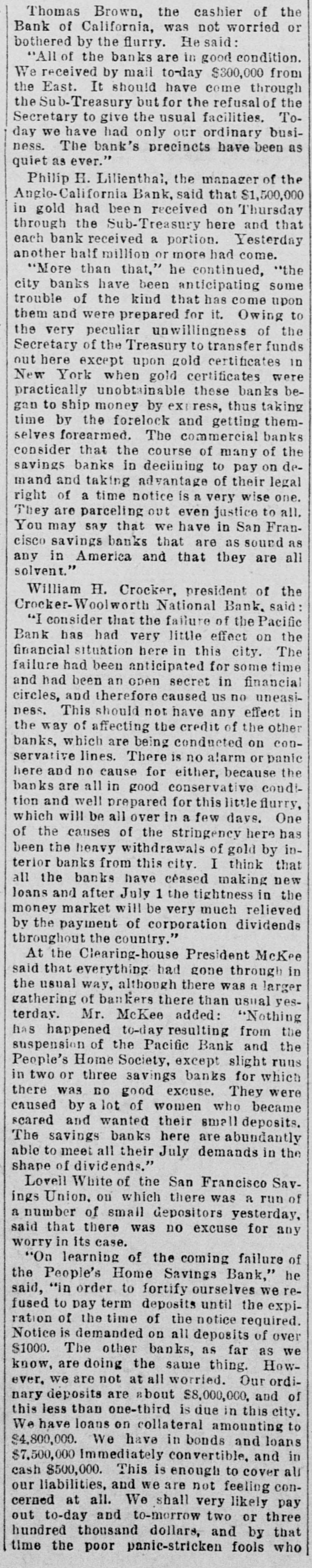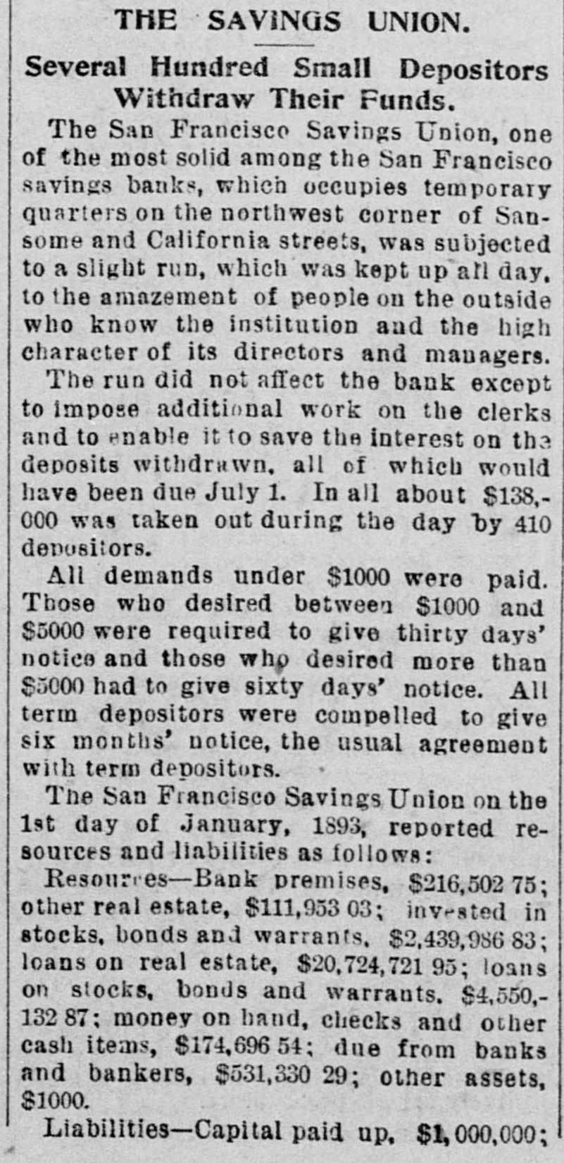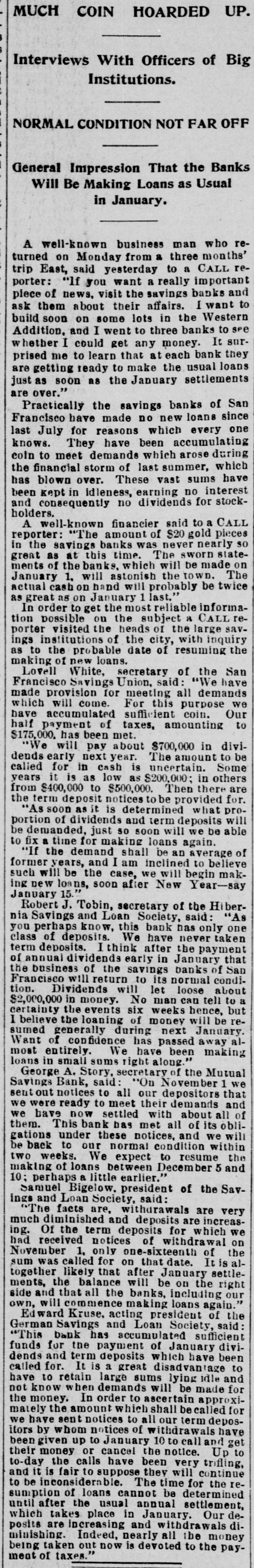 MUCH COIN HOARDED UP. Interviews With Officers of Big Institutions. NORMAL CONDITION NOT FAR OFF General Impression That the Banks Will Be Making Loans as Usual in January. business man who returned on from a three A well-known Monday CALL months' trip East, said yesterday to a reporter: "If want a really news, you banks important and piece of visit the savings ask about their affairs. I want to build on some lots in them soon the banks Western to and I went to three see I could get any money. me to learn that at each whether Addition. prised bank It loans they surare getting ready to make the usual just as soon as the January settlements are over." Practically the savings banks of San Francisco have made no new loans since last for reasons which have been knows. July They accumulating every during one demands which arose the storm of last summer, has over. These vast sums coin financial blown to meet interest which have been kept in Idleness, earning no stockand consequently no dividends for holders. A well-known financier said to a CALL reporter: "The amount of $20 gold nearly pieces so in the savings banks was never at this time. The sworn stateof the banks. which will be 1, will astonish the town. great ments January as made be twice The on actual cash on hand will probably as on as great order to get January the 1 last." reliable informaIn possible ou the subject a CALL reporter tion visited the heads of the large savings institutions of the city, with inquiry the as to the probable date of resuming making of new loans. Lovell White, secretary of the San Francisco Savings Union. said: "We have made provision for meeting all demands which will come. For this purpose we have accumulated sufficient coin. Our to half payment of taxes, amounting $175,000. has been met. We will pay about $700,000 in dividends early next year. The amount to be called for in cash is uncertain. Some years it is as low as $200,000; in others from $400,000 to $500,000. Then there for. are the term deposit notices to be provided As soon as it is determined what proportion of dividends and term deposits able will be demanded, just so soon will we be to fix a time for making loans again. "If the demand shall be an average of former years, and am inclined to believe such will be the case, we will begin making new loans, soon after New Year-say January Robert 15." J. Tobin, secretary of the Hibernia Savings and Loan Society, said: "As perhaps know, this bank nas only one you class of deposits. We have never taken term deposits. I think after the payment that of annual dividends early in January business of the savings banks of San the Francisco will return to its normal condi- about tion. Dividends will let loose to $2,000,000 in money. No mian can tell but a the events six weeks hence, be certainty I believe the loaning of money will resumed generally during next January. alWant of confidence has passed away most entirely. We have been making loans in small some right along. George A. Story, secretary of the Mutual we Bank, said: "On November 1 notices to all our to meet their of Savings sentout were ready depositors demands about all that and we have now settled with oblithem. we This bank has met all of its will under these notices, and we within gations back to our normal condition the be weeks. We expect to resume and making two of loans between December 10; Samuel perhaps Bigelow. a little earlier. president of the Savand Loan Society, said: ings facts are. withdrawals are very "The diminished and deposits are which increasmuch Of the term deposits for we on ing. received notices of withdrawal had 1, only one-sixteenth of the November was called for on that date. It settle- is alsum that after January balance will be on that all the banks, side ments, together and the likely including loans the again." right our will commence making of the own, Edward Kruse. acting president said: Savings and Loan Society, German bank has accumulated sufficient divi"This for the payment of January been funds and term deposits which have to dends for. It is a great disadvan age and called retain large sums lying made idle for have know to when demands will be approxinot In order to ascertain for the amount which shall sent notices to all our term we whom notices of mately money. have the withdrawals be called depos- have itors up to January 10 call to or cancel the their the calls have been very continue to-day been by given money notice. will and trifling, Up get is fair to suppose they the reand it inconsiderable. The time determined for to be of loans cannot be settlement, sumption the usual annual which until after takes place in and January. withdrawals Our de- diposits are increasing Indeed, nearly all be money meat of taxes." being minishing. taken out now is devoted to the pay-