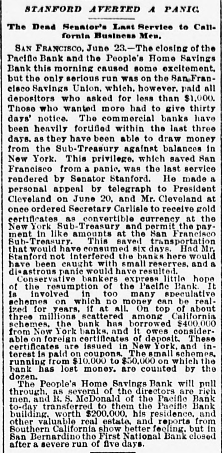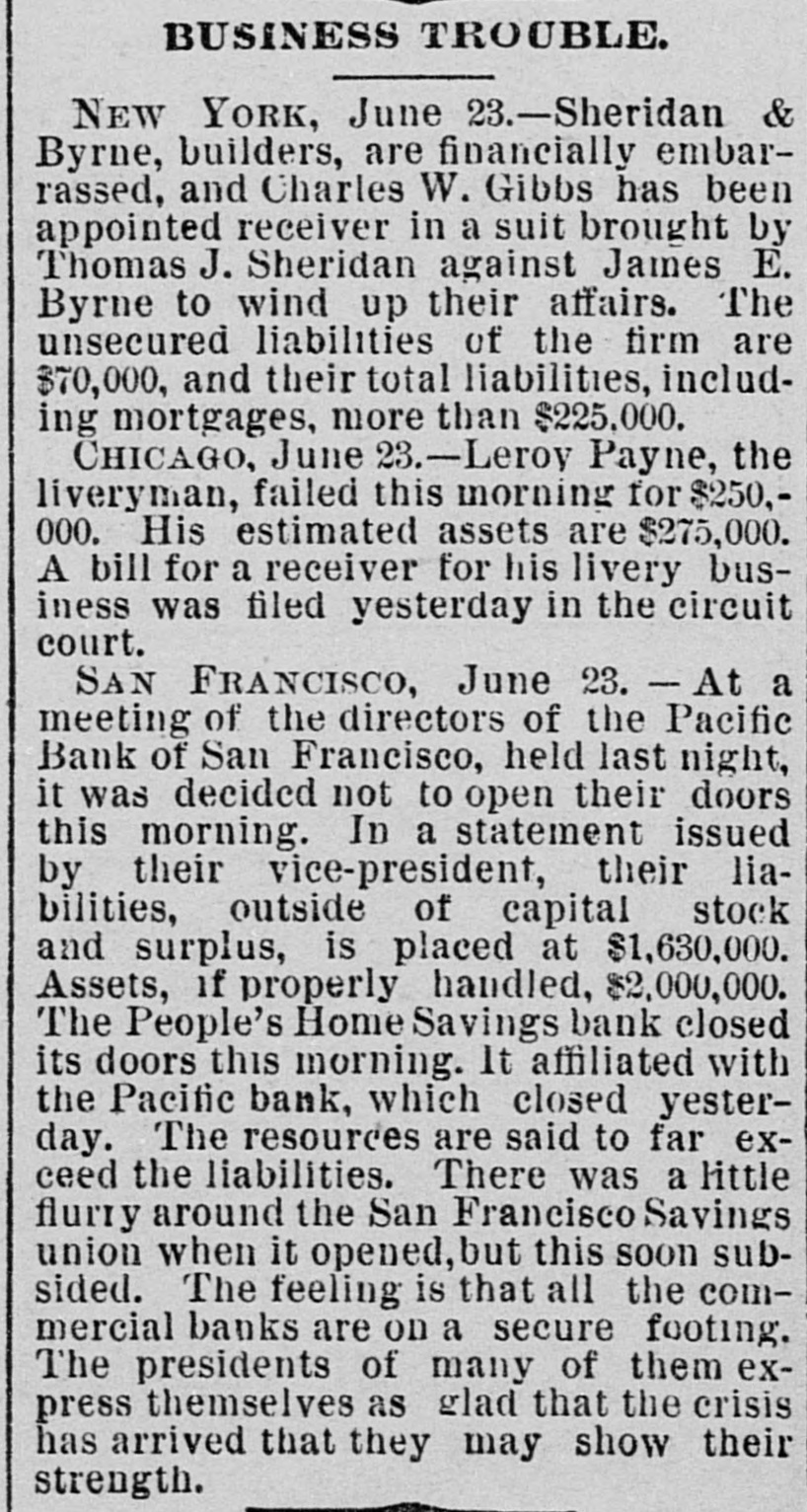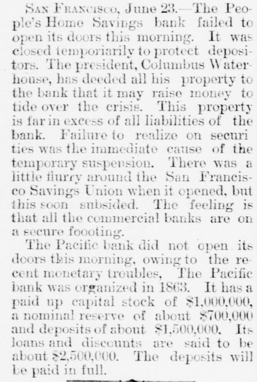 MUCH COIN HOARDED UP. Interviews With Officers of Big Institutions. NORMAL CONDITION NOT FAR OFF General Impression That the Banks Will Be Making Loans as Usual in January. business man who returned on from a three A well-known Monday CALL months' trip East, said yesterday to a reporter: "If want a really news, you banks important and piece of visit the savings ask about their affairs. I want to build on some lots in them soon the banks Western to and I went to three see I could get any money. me to learn that at each whether Addition. prised bank It loans they surare getting ready to make the usual just as soon as the January settlements are over." Practically the savings banks of San Francisco have made no new loans since last for reasons which have been knows. July They accumulating every during one demands which arose the storm of last summer, has over. These vast sums coin financial blown to meet interest which have been kept in Idleness, earning no stockand consequently no dividends for holders. A well-known financier said to a CALL reporter: "The amount of $20 gold nearly pieces so in the savings banks was never at this time. The sworn stateof the banks. which will be 1, will astonish the town. great ments January as made be twice The on actual cash on hand will probably as on as great order to get January the 1 last." reliable informaIn possible ou the subject a CALL reporter tion visited the heads of the large savings institutions of the city, with inquiry the as to the probable date of resuming making of new loans. Lovell White, secretary of the San Francisco Savings Union. said: "We have made provision for meeting all demands which will come. For this purpose we have accumulated sufficient coin. Our to half payment of taxes, amounting $175,000. has been met. We will pay about $700,000 in dividends early next year. The amount to be called for in cash is uncertain. Some years it is as low as $200,000; in others from $400,000 to $500,000. Then there for. are the term deposit notices to be provided As soon as it is determined what proportion of dividends and term deposits able will be demanded, just so soon will we be to fix a time for making loans again. "If the demand shall be an average of former years, and am inclined to believe such will be the case, we will begin making new loans, soon after New Year-say January Robert 15." J. Tobin, secretary of the Hibernia Savings and Loan Society, said: "As perhaps know, this bank nas only one you class of deposits. We have never taken term deposits. I think after the payment that of annual dividends early in January business of the savings banks of San the Francisco will return to its normal condi- about tion. Dividends will let loose to $2,000,000 in money. No mian can tell but a the events six weeks hence, be certainty I believe the loaning of money will resumed generally during next January. alWant of confidence has passed away most entirely. We have been making loans in small some right along. George A. Story, secretary of the Mutual we Bank, said: "On November 1 notices to all our to meet their of Savings sentout were ready depositors demands about all that and we have now settled with oblithem. we This bank has met all of its will under these notices, and we within gations back to our normal condition the be weeks. We expect to resume and making two of loans between December 10; Samuel perhaps Bigelow. a little earlier. president of the Savand Loan Society, said: ings facts are. withdrawals are very "The diminished and deposits are which increasmuch Of the term deposits for we on ing. received notices of withdrawal had 1, only one-sixteenth of the November was called for on that date. It settle- is alsum that after January balance will be on that all the banks, side ments, together and the likely including loans the again." right our will commence making of the own, Edward Kruse. acting president said: Savings and Loan Society, German bank has accumulated sufficient divi"This for the payment of January been funds and term deposits which have to dends for. It is a great disadvan age and called retain large sums lying made idle for have know to when demands will be approxinot In order to ascertain for the amount which shall sent notices to all our term we whom notices of mately money. have the withdrawals be called depos- have itors up to January 10 call to or cancel the their the calls have been very continue to-day been by given money notice. will and trifling, Up get is fair to suppose they the reand it inconsiderable. The time determined for to be of loans cannot be settlement, sumption the usual annual which until after takes place in and January. withdrawals Our de- diposits are increasing Indeed, nearly all be money meat of taxes." being minishing. taken out now is devoted to the pay-