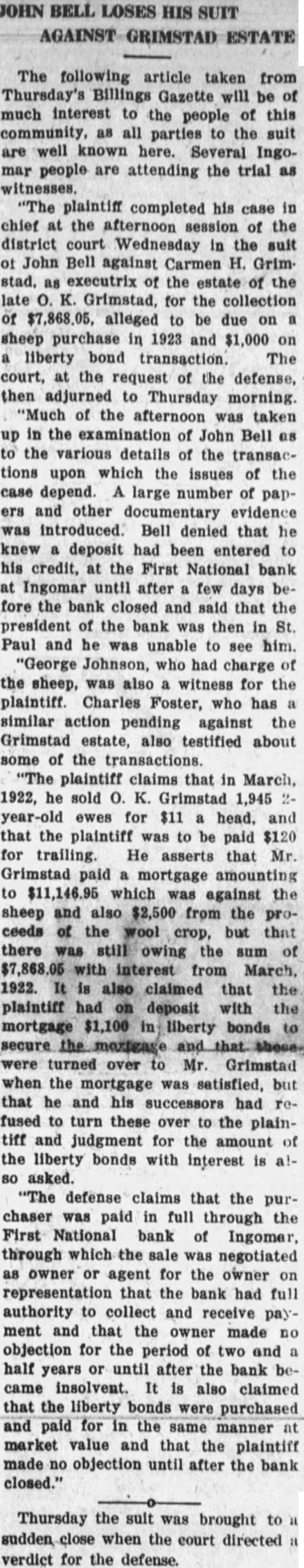 The following article taken from Thursday's Billings Gazette will be of much interest to the people of this community, as all parties to the suit are well known here. Several Ingomar people are attending the trial as witnesses. "The plaintiff completed his case in chief at the afternoon session of the district court Wednesday in the suit of John Bell against Carmen H. Grimstad, as executrix of the estate of the late O. K. Grimstad, for the collection of $7,868.05, alleged to be due on a sheep purchase in 1923 and $1,000 on a liberty bond transaction. The court, at the request of the defense, then adjurned to Thursday morning. "Much of the afternoon was taken up in the examination of John Bell as to the various details of the transactions upon which the issues of the case depend. A large number of papers and other documentary evidence was introduced. Bell denied that he knew a deposit had been entered to his credit, at the First National bank at Ingomar until after a few days before the bank closed and said that the president of the bank was then in St. Paul and he was unable to see him. "George Johnson, who had charge of the sheep, was also a witness for the plaintiff. Charles Foster, who has a similar action pending against the Grimstad estate, also testified about some of the transactions. "The plaintiff claims that in March, 1922, he sold O. K. Grimstad 1,945 2year-old ewes for $11 a head. and that the plaintiff was to be paid $120 for trailing. He asserts that Mr. Grimstad paid a mortgage amounting to $11,146.95 which was against the sheep and also $2,500 from the proceeds of the wool crop, but that there was still owing the sum of $7,868.05 with interest from March. 1922. It is also claimed that the plaintiff had on deposit with the mortgage $1,100 in liberty bonds to secure the mortgage and that those were turned over to Mr. Grimstad when the mortgage was satisfied, but that he and his successors had refused to turn these over to the plaintiff and judgment for the amount of the liberty bonds with interest is a!so asked. "The defense claims that the purchaser was paid in full through the First National bank of Ingomer, through which the sale was negotiated as owner or agent for the owner on representation that the bank had full authority to collect and receive payment and that the owner made no objection for the period of two and a half years or until after the bank became insolvent. It is also that the liberty bonds were purchased market value and that the plaintiff made no objection until after the bank closed."