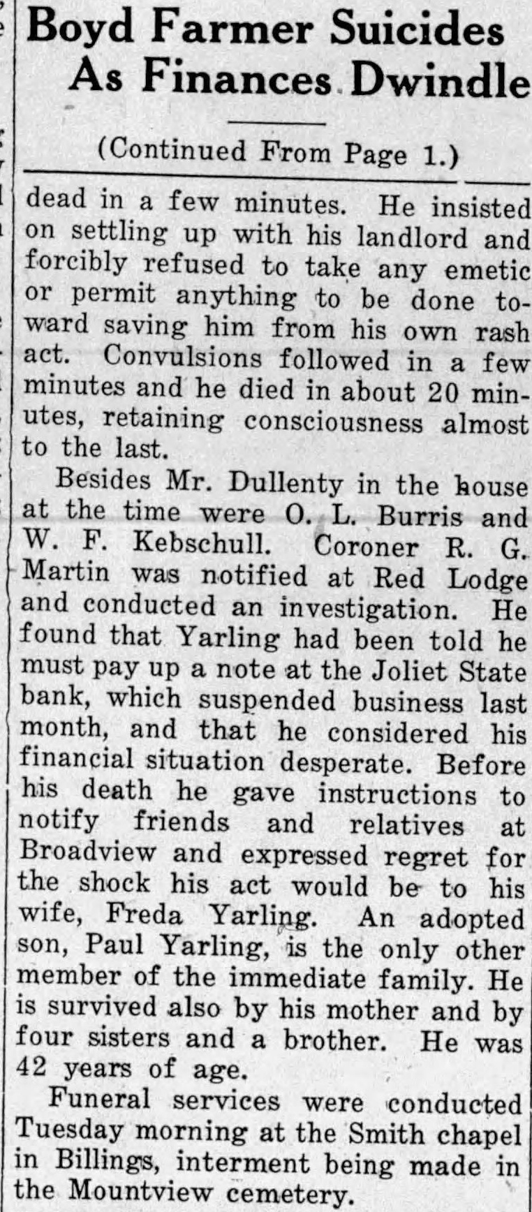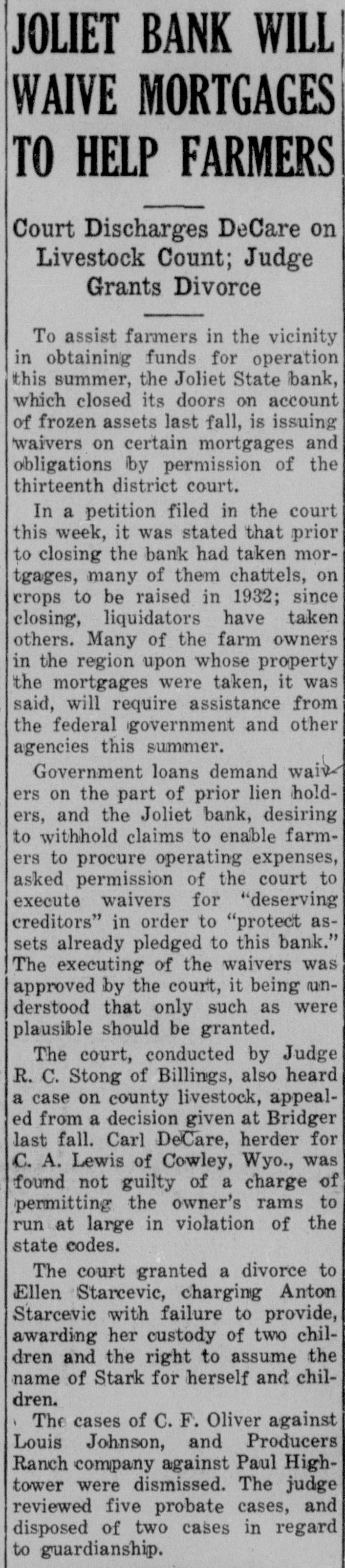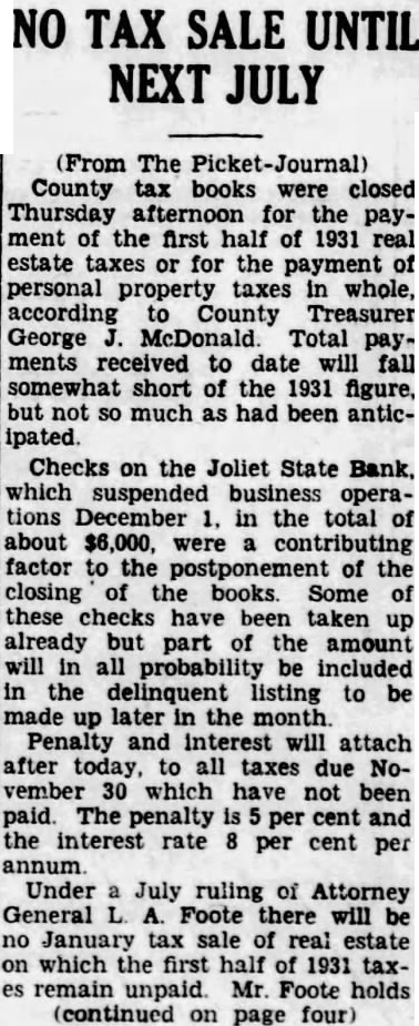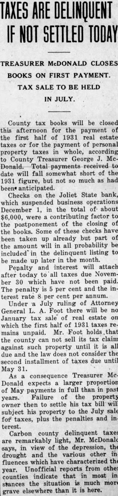 TAXES ARE DELINQUENT IF NOT SETTLED TODAY TREASURER McDONALD CLOSES BOOKS ON FIRST PAYMENT. TAX SALE TO BE HELD IN JULY. County tax books will be closed this afternoon for the payment of the first half of 1931 real estate taxes or for the payment of personal property taxes in whole, according to County Treasurer George J. McDonald. Total payments received to date will fall somewhat short of the 1931 figure, but not so much as had been anticipated. Checks on the Joliet State bank, which suspended business operations December 1, in the total of about $6,000, were a contributing factor to the postponement of the closing of the books. Some of these checks have been taken up already but part of the amount will in all probability be included in the delinquent listing to be made up later in the month. Penalty and interest will attach after today to all taxes due November 30 which have not been paid. The penalty is 5 per cent and the interest rate 8 per cent per annum. Under a July ruling of Attorney General L. A. Foot there will be no January tax sale of real estate on which the first half of 1931 taxes remains unpaid. Mr. Foot holds that the county can not sell its tax claim against such property until it is all due and the law does not consider the second installment of taxes due until May 31. As a consequence Treasurer McDonald expects a larger proportion of May payments in full than in past years. Failure of the property owner then to settle his tax bill will subject his property to the July sale for taxes, plus the penalties and interest. Carbon county delinquent taxes are remarkably light, Mr. McDonald says, in view of the depression, the drought and the various other influences which have characterized the year. Unofficial reports from other counties indicate that in most instances the situation is much more grave elsewhere than it is here.