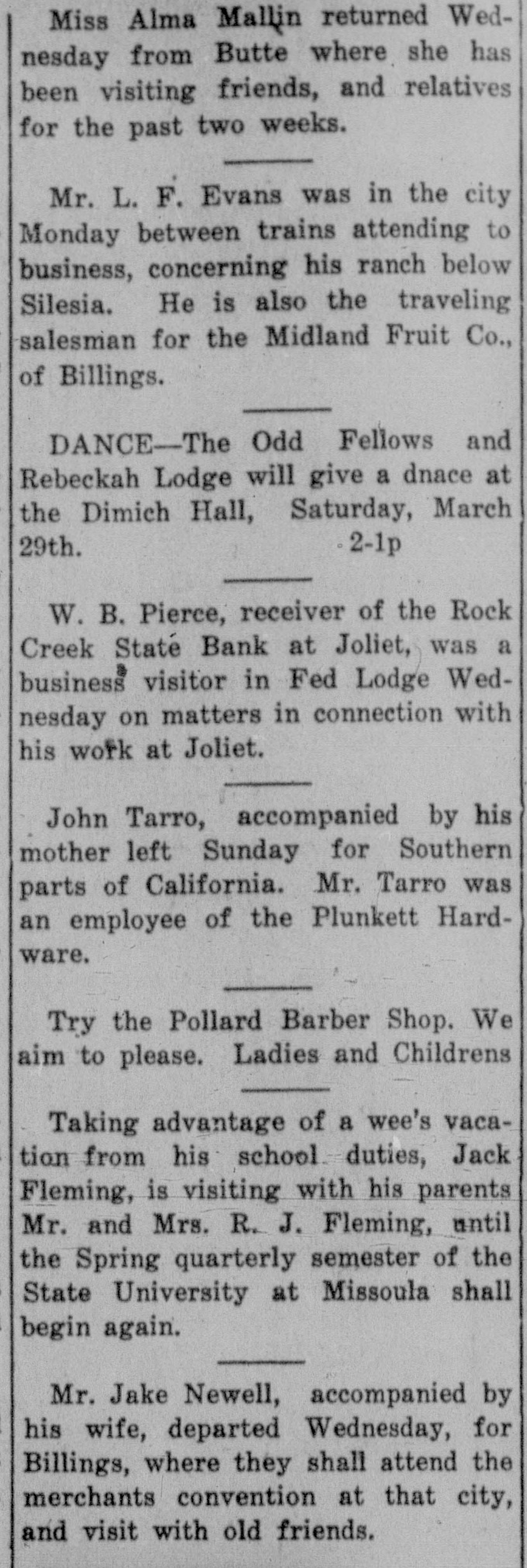 Miss Alma Mallin returned Wednesday from Butte where she has been visiting friends, and relatives for the past two weeks. Mr. L. F. Evans was in the city Monday between trains attending to business, concerning his ranch below Silesia. He is also the traveling salesman for the Midland Fruit Co., of Billings. # DANCE-The Odd Fellows and Rebeckah Lodge will give a dnace at the Dimich Hall, Saturday, March 29th. 2-1p W. B. Pierce, receiver of the Rock Creek State Bank at Joliet, was a business visitor in Fed Lodge Wednesday on matters in connection with his work at Joliet. John Tarro, accompanied by his mother left Sunday for Southern parts of California. Mr. Tarro was an employee of the Plunkett Hardware. Try the Pollard Barber Shop. We aim to please. Ladies and Childrens Taking advantage of a wee's vacation from his school duties, Jack Fleming, is visiting with his parents Mr. and Mrs. R. J. Fleming, until the Spring quarterly semester of the State University at Missoula shall begin again. Mr. Jake Newell, accompanied by his wife, departed Wednesday, for Billings, where they shall attend the merchants convention at that city, and visit with old friends.