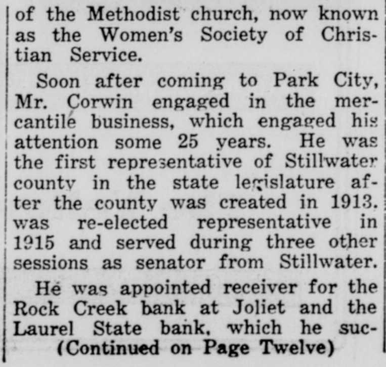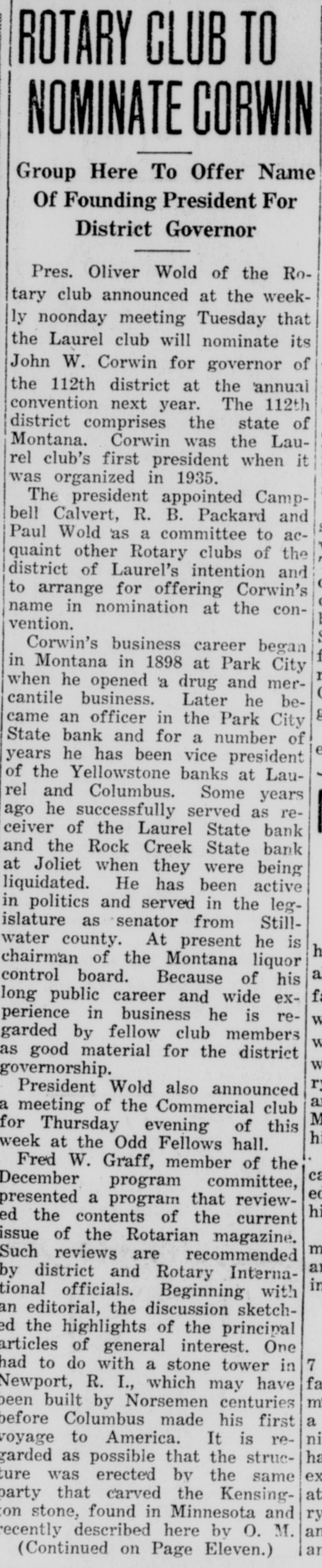 ROTARY CLUB TO NOMINATE CORWIN Group Here To Offer Name Of Founding President For District Governor Pres. Oliver Wold of the Rotary club announced at the weekly noonday meeting Tuesday that the Laurel club will nominate its John W. Corwin for governor of the 112th district at the annual convention next year. The 112th district comprises the state of Montana. Corwin was the Laurel club's first president when it was organized in 1935. The president appointed Campbell Calvert, R. B. Packard and Paul Wold as a committee to acquaint other Rotary clubs of the district of Laurel's intention and to arrange for offering Corwin's name in nomination at the convention. Corwin's business career began in Montana in 1898 at Park City I when he opened a drug and mercantile business. Later he became an officer in the Park City State bank and for a number of years he has been vice president of the Yellowstone banks at Laurel and Columbus. Some years ago he successfully served as receiver of the Laurel State bank and the Rock Creek State bank at Joliet when they were being liquidated. He has been active in politics and served in the legislature as senator from Stillwater county. At present he is h chairman of the Montana liquor a control board. Because of his f long public career and wide experience in business he is reW garded by fellow club members W as good material for the district W governorship. r) President Wold also announced a a meeting of the Commercial club M for Thursday evening of this h week at the Odd Fellows hall. Fred W. Graff, member of the ca December program committee, eo presented a program that reviewhi ed the contents of the current issue of the Rotarian magazine. m Such reviews are recommended a by district and Rotary Internain tional officials. Beginning with an editorial, the discussion sketched the highlights of the principal articles of general interest. One 7 had to do with a stone tower in fa Newport, R. I., which may have m been built by Norsemen centuries a before Columbus made his first ni voyage to America. It is reha garded as possible that the strucex ture was erected by the same at party that carved the Kensingry on stone, found in Minnesota and an recently described here by O. M. an (Continued on Page Eleven.)