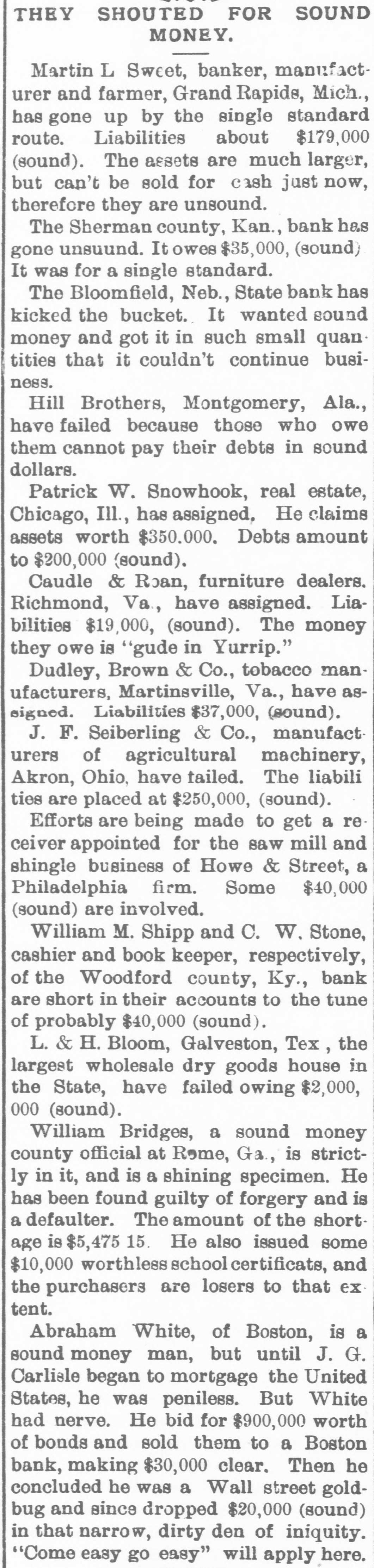 THEY SHOUTED FOR SOUND MONEY. Martin L Sweet, banker, manufacturer and farmer, Grand Rapids, Mich., has gone up by the single standard route. Liabilities about $179,000 (sound). The assets are much larger, but can't be sold for cash just now, therefore they are unsound. The Sherman county, Kan., bank has gone unsuund. It owes $35,000, (sound) It was for a single standard. The Bloomfield, Neb., State bank has kicked the bucket. It wanted sound money and got it in such small quan tities that it couldn't continue business. Hill Brothers, Montgomery, Ala., have failed because those who owe them cannot pay their debts in sound dollars. Patrick W. Snowhook, real estate, Chicago, Ill., has assigned, He claims assets worth $350.000. Debts amount to $200,000 (sound). Caudle & Roan, furniture dealers. Richmond, Va, have assigned. Liabilities $19,000, (sound). The money they owe is "gude in Yurrip." Dudley, Brown & Co., tobacco manufacturers, Martinsville, Va., have assigned. Liabilities $37,000, (sound). J. F. Seiberling & Co., manufacturers of agricultural machinery, Akron, Ohio, have tailed. The liabili ties are placed at $250,000, (sound). Efforts are being made to get a receiver appointed for the saw mill and shingle business of Howe & Street, a Philadelphia firm. Some $40,000 (sound) are involved. William M. Shipp and C. W. Stone, cashier and book keeper, respectively, of the Woodford county, Ky., bank are short in their accounts to the tune of probably $40,000 (sound). L. & H. Bloom, Galveston, Tex, the largest wholesale dry goods house in the State, have failed owing $2,000, 000 (sound). William Bridges, a sound money county official at Rome, Ga, is strictly in it, and is a shining specimen. He has been found guilty of forgery and is a defaulter. The amount of the shortage is $5,475 15. He also issued some $10,000 worthless school certificats, and the purchasers are losers to that ex tent. Abraham White, of Boston, is a sound money man, but until J. G. Carlisle began to mortgage the United States, he was peniless. But White had nerve. He bid for $900,000 worth of bonds and sold them to a Boston bank, making $30,000 clear. Then he concluded he was a Wall street goldbug and since dropped $20,000 (sound) in that narrow, dirty den of iniquity. "Come easy go easy" will apply here.