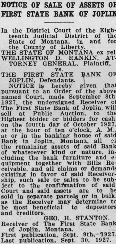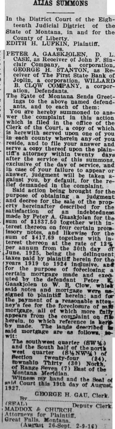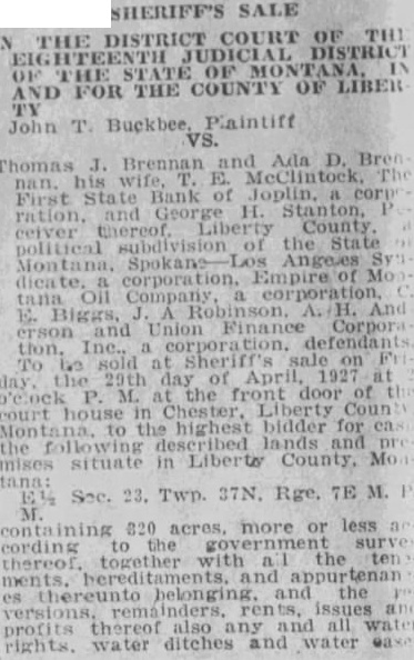 SHERIFF'S SALE THE DISTRICT COURT OF THE HTEENTH DISTRICT OF OF AND HE FOR THE COUNTY OF LIBER John TX Buckbee Plaintiff Thomas J. Brennan McClintock Ada D. Bre his nan. First State Bank of Joplin, corp ration, and George H. Stanton, ceiver thereof Liberty County political subdivision the State dicate corporation, Empire Mo E. Biggs, erson and Union Finance Corpora tion. Inc., defendant To at Sheriff's sale on day the 29th day of the door court in Chester, Liberty Coun to the highest bidder for en lands and the following situate in Liberty County, Mo M 820 acres, more or less cording surv thereof. together with all the ter es belonging and the profits thereof also any and all wat rights. water ditches and water