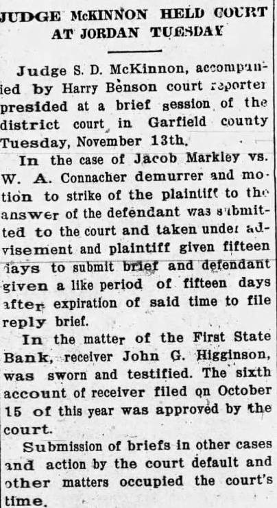 JUDGE McKINNON HELD COURT AT JORDAN TUESDAY Judge S. D. McKinnon, accompanled by Harry Benson court reporter presided at a brief gession of the district court in Garfield county Tuesday, November 13th. In the case of Jacob Markley vs. W. A. Connacher demurrer and motion to strike of the plaintiff to the answer of the defendant was submitted to the court and taken under advisement and plaintiff given fifteen lays to submit brief and defendant given a like period of fifteen days after expiration of said time to file reply brief. In the matter of the First State Bank, receiver John G. Higginson, was sworn and testified. The sixth account of receiver filed on October 15 of this year was approved by the court. Submission of briefs in other cases and action by the court default and other matters occupied the court's time.