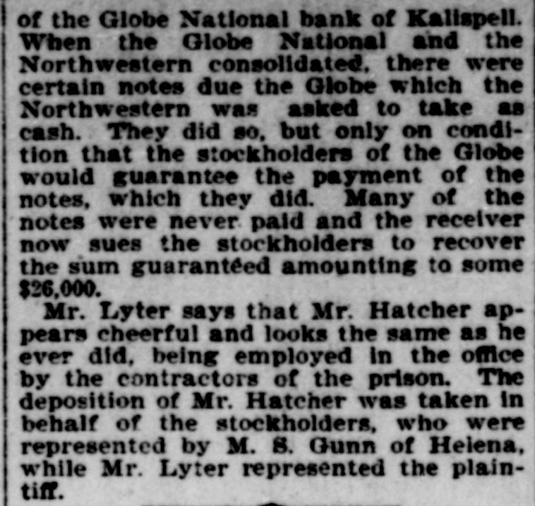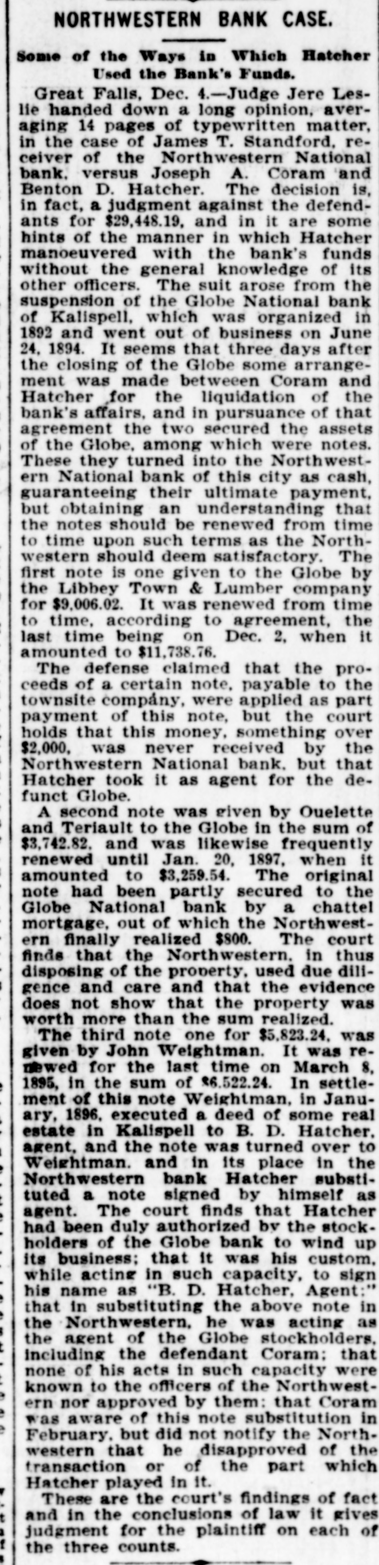 NORTHWESTERN BANK CASE. Some of the Ways in Which Hatcher Used the Bank's Funds. Great Falls, Dec. 4.-Judge Jere Leslie handed down a long opinion, averaging 14 pages of typewritten matter, in the case of James T. Standford, receiver of the Northwestern National bank. versus Joseph A. Coram and Benton D. Hatcher. The decision is, in fact, a judgment against the defendants for $29,448.19, and in it are some hints of the manner in which Hatcher manoeuvered with the bank's funds without the general knowledge of its other officers. The suit arose from the suspension of the Globe National bank of Kalispell, which was organized in 1892 and went out of business on June 24. 1894. It seems that three days after the closing of the Globe some arrangement was made betweeen Coram and Hatcher for the liquidation of the bank's affairs. and in pursuance of that agreement the two secured the assets of the Globe, among which were notes. These they turned into the Northwestern National bank of this city as cash, guaranteeing their ultimate payment, but obtaining an understanding that the notes should be renewed from time to time upon such terms as the Northwestern should deem satisfactory. The first note is one given to the Globe by the Libbey Town & Lumber company for $9,006.02. It was renewed from time to time, according to agreement, the last time being on Dec. 2. when it amounted to $11,738.76. The defense claimed that the proceeds of a certain note, payable to the townsite company, were applied as part payment of this note, but the court holds that this money, something over $2,000. was never received by the Northwestern National bank. but that Hatcher took it as agent for the defunct Globe. A second note was given by Ouelette and Teriault to the Globe in the sum of $3,742.82. and was likewise frequently renewed until Jan. 20, 1897, when it amounted to $3,259.54. The original note had been partly secured to the Globe National bank by a chattel mortgage, out of which the Northwestern finally realized $800. The court finds that the Northwestern. in thus disposing of the property, used due dillgence and care and that the evidence does not show that the property was worth more than the sum realized. The third note one for $5,823.24. was given by John Weightman. It was renewed for the last time on March 8, 1895, in the sum of $6,522.24. In settlement of this note Weightman. in January, 1896, executed a deed of some real estate in Kalispell to B. D. Hatcher. agent, and the note was turned over to Weightman. and in its place in the Northwestern bank Hatcher substituted a note signed by himself as agent. The court finds that Hatcher had been duly authorized by the stockholders of the Globe bank to wind up its business: that it was his custom. while acting in such capacity, to sign his name as "B. D. Hatcher, Agent: that in substituting the above note in the Northwestern. he was acting as $ the agent of the Globe stockholders. t including the defendant Coram: that none of his acts in such capacity were known to the officers of the Northwestern nor approved by them: that Coram was aware of this note substitution in e February. but did not notify the Northwestern that he disapproved of the transaction or of the part which Hatcher played in it. These are the court's findings of fact t and in the conclusions of law it gives a judgment for the plaintiff on each of f the three counts. $