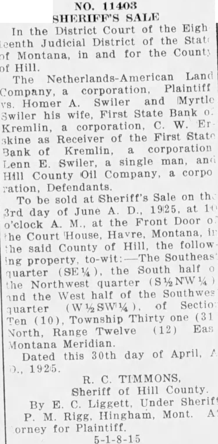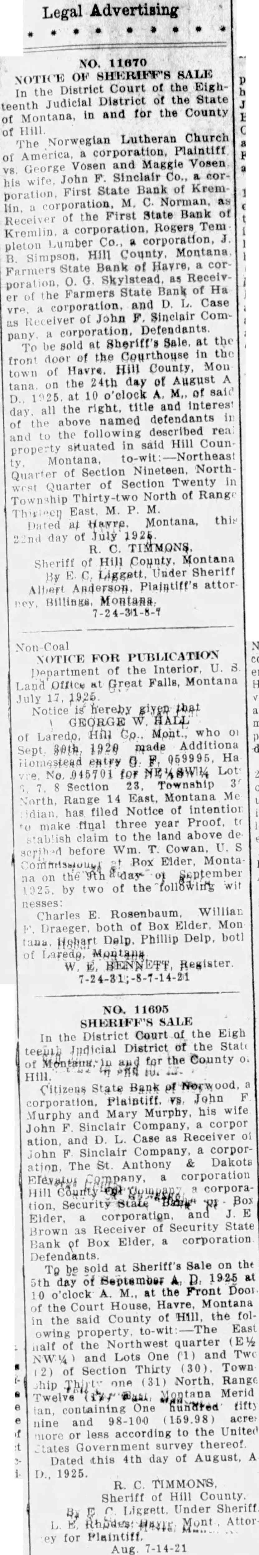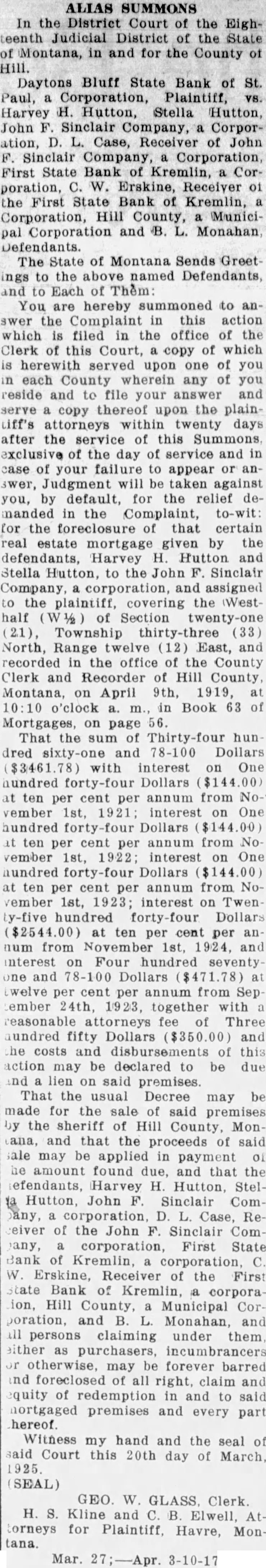 ALIAS SUMMONS In the District Court of the Eighteenth Judicial District of the State of Montana, in and for the County of Hill. Daytons Bluff State Bank of St. Paul, a Corporation, Plaintiff, VS. Harvey H. Hutton, Stella Hutton, John F. Sinclair Company, a Corporation, D. Case, Receiver of John F. Sinclair Company, Corporation, First State Bank of Kremlin, a Corporation, C. W. Erskine, Receiver of the First State Bank of Kremlin, a Corporation, Hill County, a Municipal Corporation and B. L. Monahan, Defendants. The State of Montana Sends Greetings to the above named Defendants, and to Each of Them: You are hereby summoned to answer the Complaint in this action which is filed in the office of the Clerk of this Court, a copy of which is herewith served upon one of you in each County wherein any of you reside and to file your answer and serve copy thereof upon the plaintiff's attorneys within twenty days after the service of this Summons exclusive of the day of service and in case of your failure to appear or answer, Judgment will be taken against you, by default, for the relief demanded in the Complaint, to-wit: for the foreclosure of that certain real estate mortgage given by the defendants, Harvey H. Hutton and Stella Hutton, to the John F. Sinclair Company, a corporation, and assigned to the plaintiff, covering the Westhalf of Section twenty-one (21), Township thirty-three (33) North, Range twelve (12) East, and recorded in the office of the County Clerk and Recorder of Hill County Montana, on April 9th, 1919, at o'clock a. m., in Book 63 of Mortgages, on page 56. That the sum of Thirty-four hun dred sixty-one and 78-100 Dollars $3461 78) with interest on One hundred forty-four Dollars at ten per cent per annum from November 1st, 1921; interest on One hundred forty-four Dollars ($144.00) it ten per cent per annum from No vember 1st, 1922; interest on One hundred forty-four Dollars ($144.00) at ten per cent per annum from November 1st, 1923; interest on Twen ty-five hundred forty-four Dollars at ten per cent per an num from November 1st, 1924, and interest on Four hundred seventy one and 78-100 Dollars $471.78) at welve per cent per annum from Sepember 24th, 1923, together with a reasonable attorneys fee of Three hundred fifty Dollars and he costs and disbursements of this action may be declared to be due nd lien on said premises That the usual Decree may be made for the sale of said premises by the sheriff of Hill County, Monana, and that the proceeds of said ale may be applied in payment 01 he amount found due, and that the efendants, Harvey H. Hutton, StelHutton, John F. Sinclair Comany, a corporation, D. L. Case, Reeiver of the John F. Sinclair Comany, corporation, First State Bank of Kremlin, corporation, C. W. Erskine, Receiver of the First state Bank of Kremlin, a corporaion, Hill County, a Municipal Cororation, and B. L. Monahan, and all persons claiming under them ither as purchasers, incumbrancers or otherwise, may be forever barred ind foreclosed of all right, claim and quity of redemption in and to said nortgaged premises and every part hereof. Witness my hand and the seal of said Court this 20th day of March, 1925. SEAL) GEO W. GLASS. Clerk. H. S. Kline and C. B. Elwell, Attorneys for Plaintiff, Havre, Montana. Mar. 27;-Apr. 3-10-17