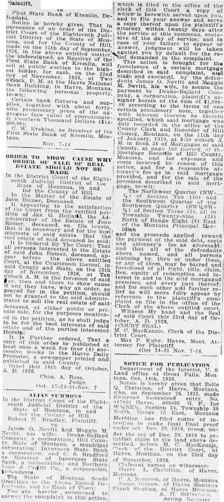 Plaintiff, fendant. First State Bank V8 of Kremlin, DeNotice is hereby given, That in pursuance of an order of the Distriet Court of the Eighteenth Judicial District the State of Montana, for of Hill, made on the 15th day of September the 1926, in the entitled matter undersigned, as Receiver of the sell First State Bank of Kremlin. will public auction to the highest for cash, on the 22nd day of November 1926, at Two o'clock P. M. at the Havre National Bank Building. in Havre, Montana, to-wit: the following personal property, Certain bank fixtures and supplies, together with fortynine promissory notes of the ag. gregate face value of 000.00). Fourteen Thousand Dollars ($14First State Erskine. as Receiver of the Bank of Kremlin, Montana. 7-14 ORDER ORDER TO OF SHOW CAUSE WHY ESTATE SHOULD SALE OF NOT REAL BE In the District MADE Court of the Eighteenth Judicial District of State of Montana, in and for the County of Hill. John In the Romer, Matter of the Estate of appearing to the satisfaction of the Court from the verified petition of Jas. Hollard, the Administrator of the Estate Jonn Romer deceased. on file herein. interests that is necessary of said and for the best estate that real the estate deceased be sold: Ordered By of all said persons interested The in Court: the Estate That John pear before the above entitled Court. the at said in County and State, on the 15th day of November, o'clock A. M. in the forenoon at of said Ten and to show cause any they why an as prayed not be granted for in the petition. should to the trator to sell the real said estate adminis- of said deceased, at either public or vate sale, for the purposes mention- pried in the petition. as he shall judge to be for the best interests of said estate therein: and of the parties interested It Further ordered, That copy of this order be published at least once week for four (4) successive the Havre Daily published Promoter in newspaper said printed and A. D. 1026. 16th day of October. Chas. A. Rose. Oct. 17-24-31-Nov. 7 ALIAS SUMMONS In the District Court the Eighteenth Judicial District of State of Montana, in and the County Hill. Robert C. Bradley, Plaintiff. James O. Nevitt and Maggie M. Nevitt. his wife: Ballard Company corporation: Hill CounState of Montana, municipal corporation: Inverness State Bank corporation Receiver and Bradford of Bank, a corporatio Inverness and Northern State Defendants. Loan Credit Co., corporation, The State of Montana Sends Greetings to the Named Defendants. and to Each of Them: You hereby summoned to answer the complaint in this action, which is filed in the office of the clerk of this Court copy of which is herewith served upon you, and to file your and serve copy thereof upon the plaintiff's attorney within twenty after the of this summons, exclusive of the day of service: and in case of your failure to appear or answer, will taken against you by default for the redemanded in the This action is brought for the foreclosure certain mortgage described in said and made and executed, by the defendants James O. Nevitt and Maggie M. Nevitt, his wife, to secure the payment to Drake- Ballard pany, plaintiff's signor herein of the sum 000.00 according to the terms one certain promissory note, together specified, which said mortgage was duly office County Clerk and Recorder of Hill County. Montana, on the 11th day of January 1919, o'clock A. M. in Book 38 of Mortgages or said County, at page Mortgage Records of Hill County, Montana, and for expenses and costs incurred by reason of this action. and for reasonable torney's fee as in said mortgage provided, and for the sale of the premises described in said mortThe Northwest Quarter (NWSection (10) and the Southwest Quarter the Southwest Quarter (SW ASW. 1/4) of Section Three (3). all in Township (29) North of Range Eight (8) East idian the Montana Principal and the proceeds applied toward the of the said debt, costs and attorney's fee as aforesald above and that all of the defendants and all persons claiming thru or under or of may be barred them, and foreclosed of all right. title, lien, equity of and interest in and to the said mortgaged and every part thereof; and for such other and further lief as will more fully appear by reference the plaintiff's complaint on file in the office of the Clerk the above entitled court. My hand the Seal tober. of said Court D. this 23rd day of Oc1926. (COURT SEAL) trict M. Court. MacKenzie, Clerk of the DisMax for Kuhr. Plaintiff Havre, Mont. Attorney (Oct 24-31 Nov. 7-14. NOTICE FOR PUBLICATION Department of the Interior, Land office at Great Falls, Mon tana. Oct. 14th, 1926. given that Belle Q. Christian, of Havre, Montana, Enlarged who, on September 26, 1922. made homestead 047046 060698 entry. G. No. for W Section 24, Township 30 North. East, Montana Meridian has filed notice of intention under to make final proof Dec. 29. 1916, under the net of Dec. 29, 1916 to establish claim to the land above described, before M. C. MacKenzie, Clerk District Court, Havre. Montana. on the 23rd day of November, 1926. Claimant witnesses: Harry L. Christian of Havre, Nystrom. of Havre, Montana Gibson, of Havre Montana Frank Stepling. of Havre Montana. Acting Register