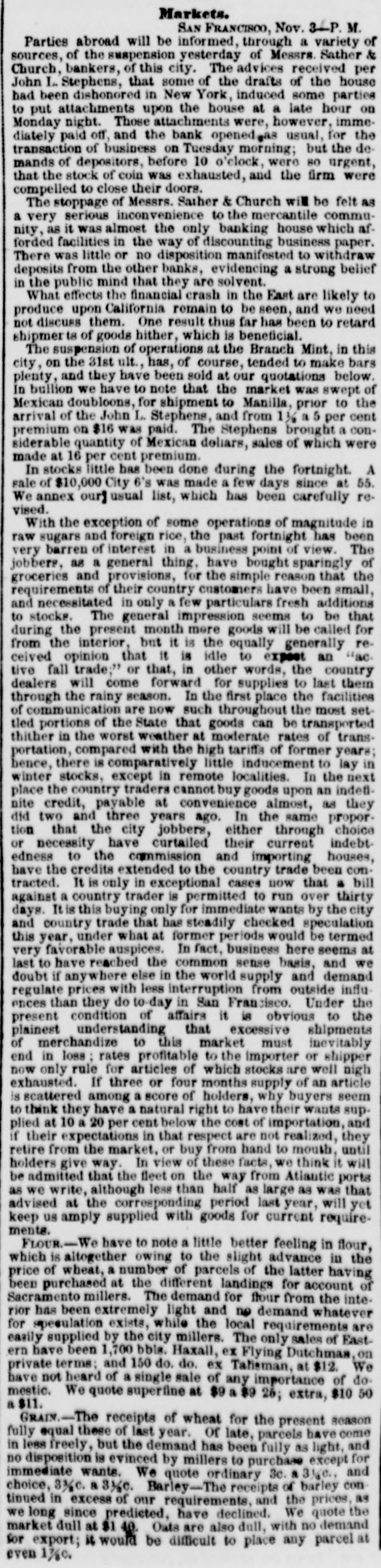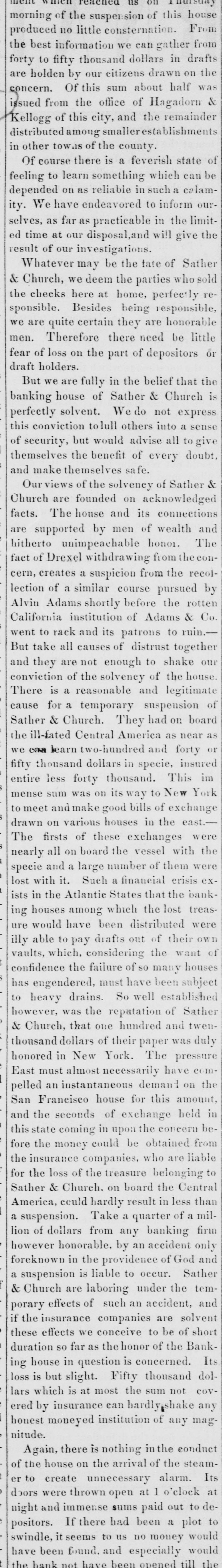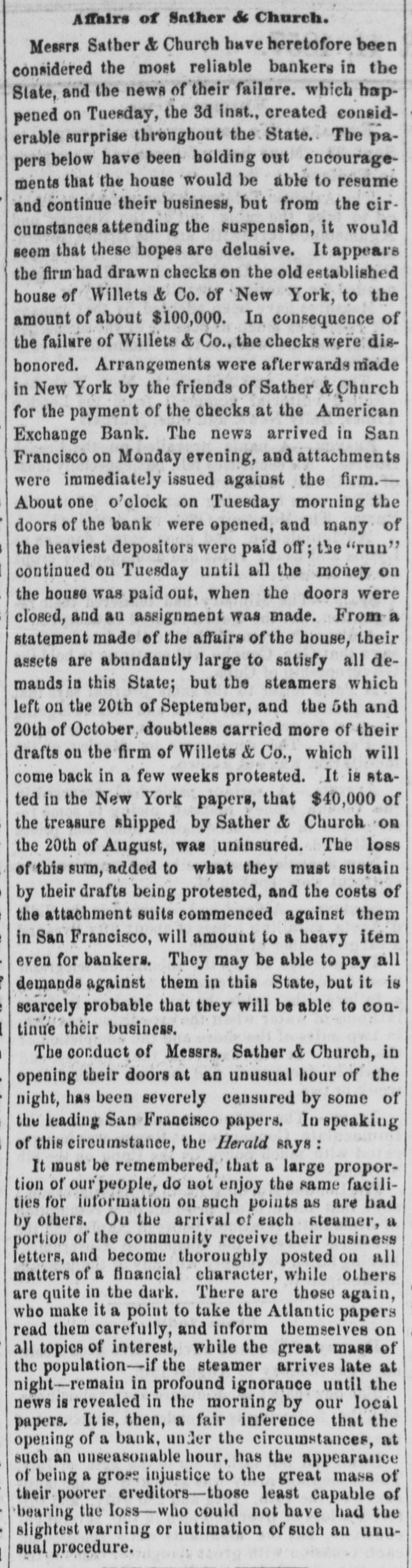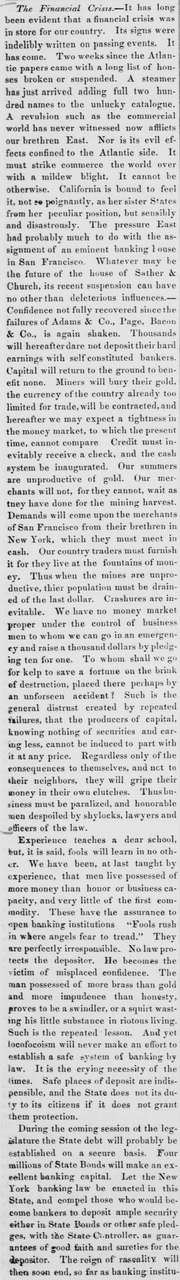 # The Financial Crisis It has long been evident that a financial crisis was in store for our country. Its signs were indelibly written on passing events. It has come. Two weeks since the Atlantic papers came with a long list of houses broken or suspended. A steamer has just arrived adding full two hundred names to the unlucky catalogue. A revulsion such as the commercial world has never witnessed now afflicts our brethren East. Nor is its evil effects confined to the Atlantic side. It must strike commerce the world over with a mildew blight. It cannot be otherwise. California is bound to feel it, not so poignantly, as her sister States from her peculiar position, but sensibly and disastrously. The pressure East had probably much to do with the assignment of an eminent banking house in San Francisco. Whatever may be the future of the house of Sather & Church, its recent suspension can have no other than deleterious influences. Confidence not fully recovered since the failures of Adams & Co., Page, Bacon & Co., is again shaken. Thousands will hereafter dare not deposit their hard earnings with self constituted bankers. Capital will return to the ground to benefit none. Miners will bury their gold, the currency of the country already too limited for trade, will be contracted, and hereafter we may expect a tightness in the money market, to which the present time, cannot compare. Credit must inevitably receive a check, and the cash system be inaugurated. Our summers are unproductive of gold. Our merchants will not, for they cannot, wait as they have done for the mining harvest. Demands will come upon the merchants of San Francisco from their brethren in New York, which they must meet in cash. Our country traders must furnish it for they live at the fountains of money. Thus when the mines are unproductive, thier population must be drained of the last dollar. Crashures are inevitable. We have no money market proper under the control of business men to whom we can go in an emergency and raise a thousand dollars by pledging ten for one. To whom shall we go for kelp to save a fortune on the brink of destruction, placed there perhaps by an unforseen accident? Such is the general distrust created by repeated failures, that the producers of capital, knowing nothing of securities and caring less, cannot be induced to part with it at any price. Regardless only of the consequences to themselves, and not to their neighbors, they will gripe their money in their own clutches. Thus business must be paralized, and honorable men despoiled by shylocks, lawyers and officers of the law. Experience teaches a dear school, but, it is said, fools will learn in no other. We have been, at last taught by experience, that men live possessed of more money than honor or business capacity, and very little of the first commodity. These have the assurance to open banking institutions "Fools rush in where angels fear to tread." They are perfectly irresponsible. No law protects the depositor. He becomes the victim of misplaced confidence. The man possessed of more brass than gold and more impudence than honesty, proves to be a swindler, or a squirt wasting his little substance in riotous living. Such is the repeated lesson. And yet locofocoism will never make an effort to establish a safe system of banking by law. It is the erying necessity of the times. Safe places of deposit are indispensible, and the State does not its duty to its citizens if it does not grant them protection. During the coming session of the legislature the State debt will probably be established on a secure basis. Four millions of State Bonds will make an excellent banking capital. Let the New York banking law be enacted in this State, and compel those who would become bankers to deposit ample security either in State Bonds or other safe pledges, with the State Controller, as guarantees of good faith and sureties for the depositor. The reign of rascality will then soon end, so far as banking institu-