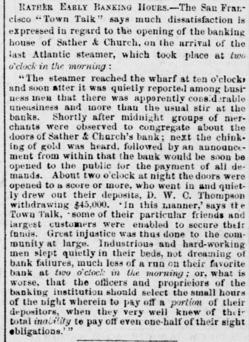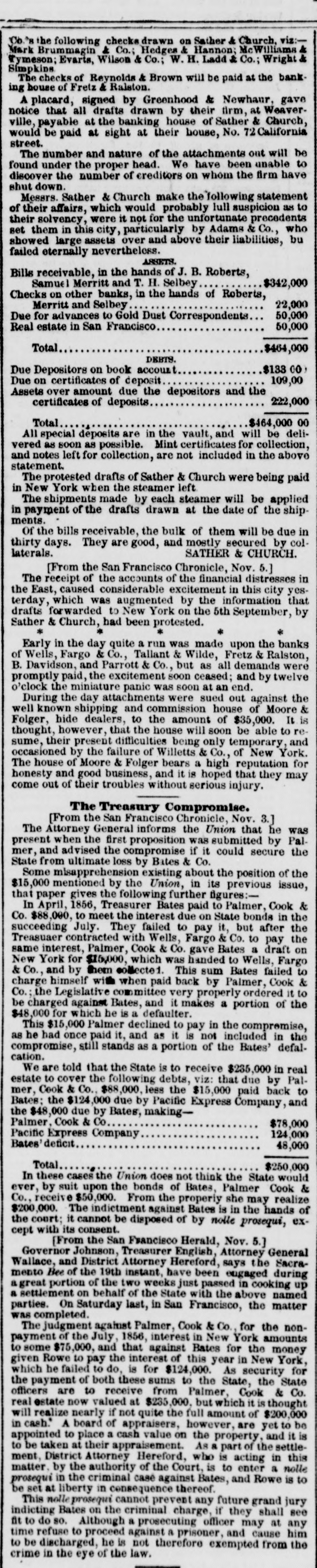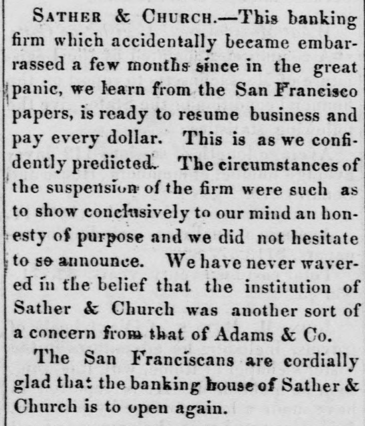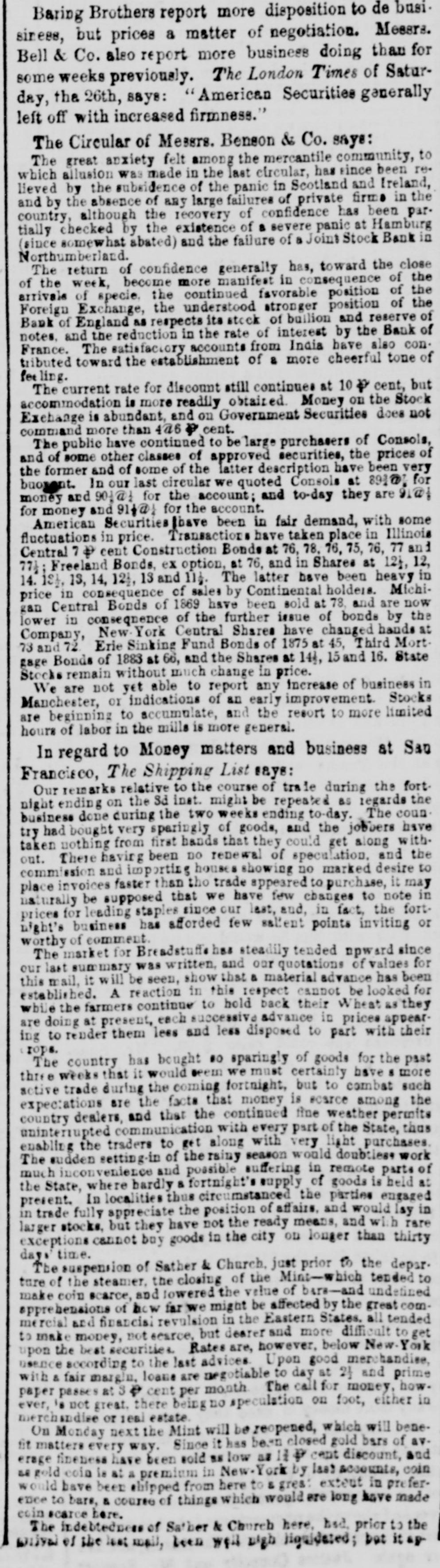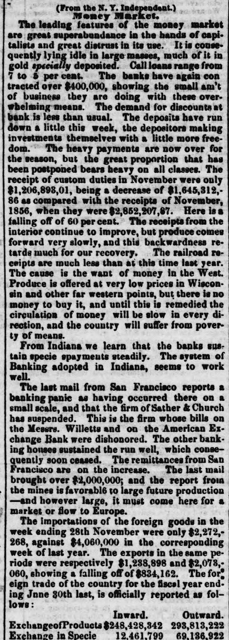 # The Financial Crisis It has long been evident that a financial crisis was in store for our country. Its signs were indelibly written on passing events. It has come. Two weeks since the Atlantic papers came with a long list of houses broken or suspended. A steamer has just arrived adding full two hundred names to the unlucky catalogue. A revulsion such as the commercial world has never witnessed now afflicts our brethren East. Nor is its evil effects confined to the Atlantic side. It must strike commerce the world over with a mildew blight. It cannot be otherwise. California is bound to feel it, not so poignantly, as her sister States from her peculiar position, but sensibly and disastrously. The pressure East had probably much to do with the assignment of an eminent banking house in San Francisco. Whatever may be the future of the house of Sather & Church, its recent suspension can have no other than deleterious influences. Confidence not fully recovered since the failures of Adams & Co., Page, Bacon & Co., is again shaken. Thousands will hereafter dare not deposit their hard earnings with self constituted bankers. Capital will return to the ground to benefit none. Miners will bury their gold, the currency of the country already too limited for trade, will be contracted, and hereafter we may expect a tightness in the money market, to which the present time, cannot compare. Credit must inevitably receive a check, and the cash system be inaugurated. Our summers are unproductive of gold. Our merchants will not, for they cannot, wait as they have done for the mining harvest. Demands will come upon the merchants of San Francisco from their brethren in New York, which they must meet in cash. Our country traders must furnish it for they live at the fountains of money. Thus when the mines are unproductive, thier population must be drained of the last dollar. Crashures are inevitable. We have no money market proper under the control of business men to whom we can go in an emergency and raise a thousand dollars by pledging ten for one. To whom shall we go for kelp to save a fortune on the brink of destruction, placed there perhaps by an unforseen accident? Such is the general distrust created by repeated failures, that the producers of capital, knowing nothing of securities and caring less, cannot be induced to part with it at any price. Regardless only of the consequences to themselves, and not to their neighbors, they will gripe their money in their own clutches. Thus business must be paralized, and honorable men despoiled by shylocks, lawyers and officers of the law. Experience teaches a dear school, but, it is said, fools will learn in no other. We have been, at last taught by experience, that men live possessed of more money than honor or business capacity, and very little of the first commodity. These have the assurance to open banking institutions "Fools rush in where angels fear to tread." They are perfectly irresponsible. No law protects the depositor. He becomes the victim of misplaced confidence. The man possessed of more brass than gold and more impudence than honesty, proves to be a swindler, or a squirt wasting his little substance in riotous living. Such is the repeated lesson. And yet locofocoism will never make an effort to establish a safe system of banking by law. It is the erying necessity of the times. Safe places of deposit are indispensible, and the State does not its duty to its citizens if it does not grant them protection. During the coming session of the legislature the State debt will probably be established on a secure basis. Four millions of State Bonds will make an excellent banking capital. Let the New York banking law be enacted in this State, and compel those who would become bankers to deposit ample security either in State Bonds or other safe pledges, with the State Controller, as guarantees of good faith and sureties for the depositor. The reign of rascality will then soon end, so far as banking institu-