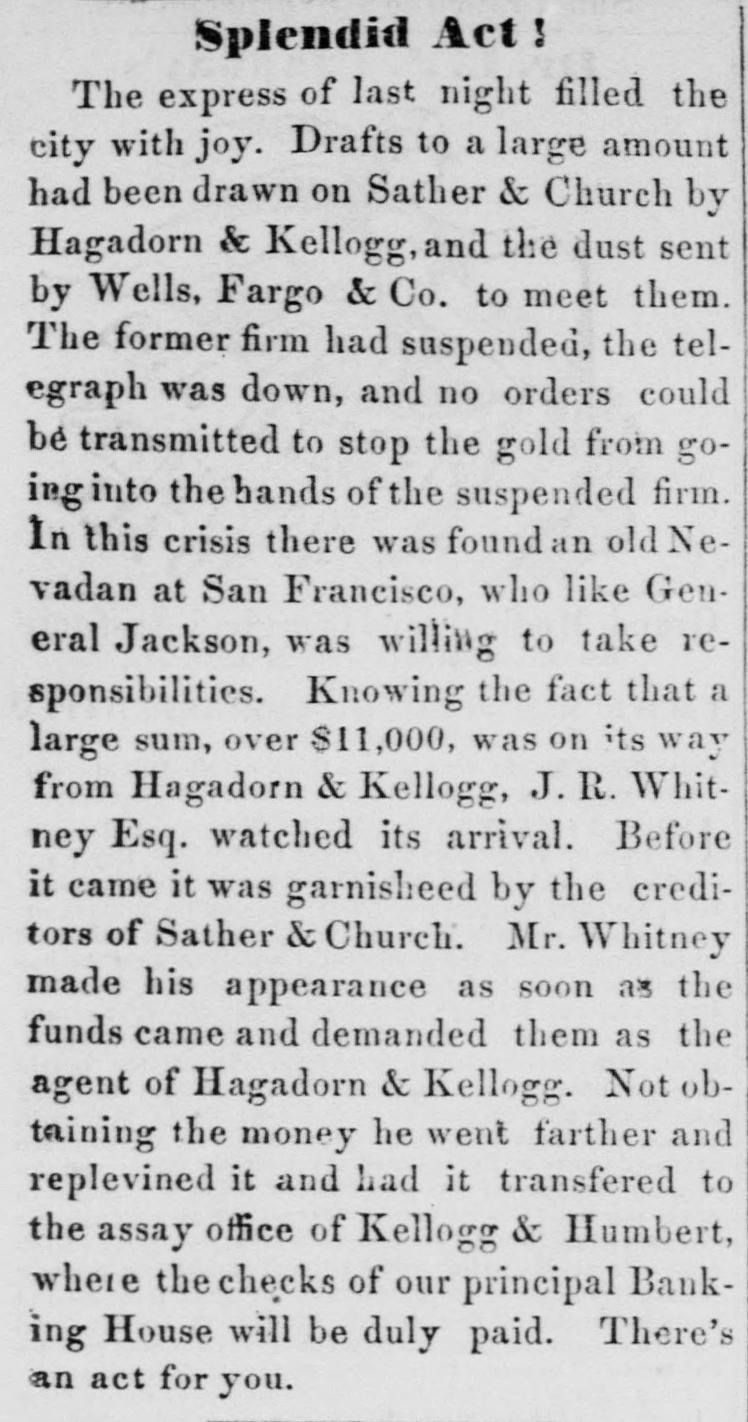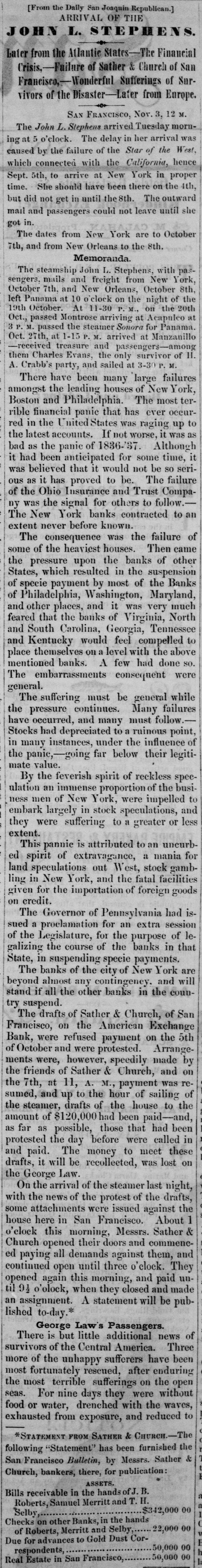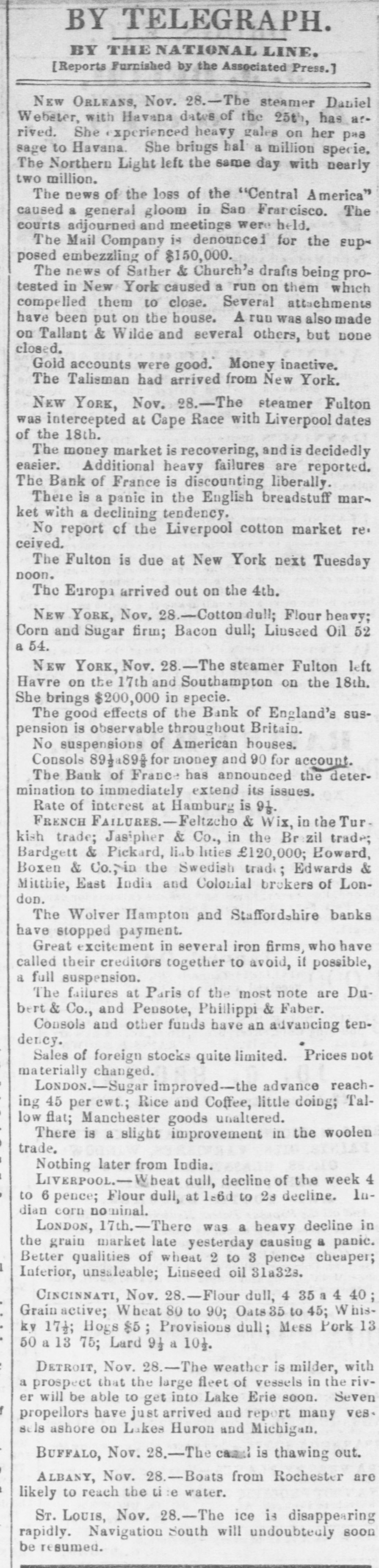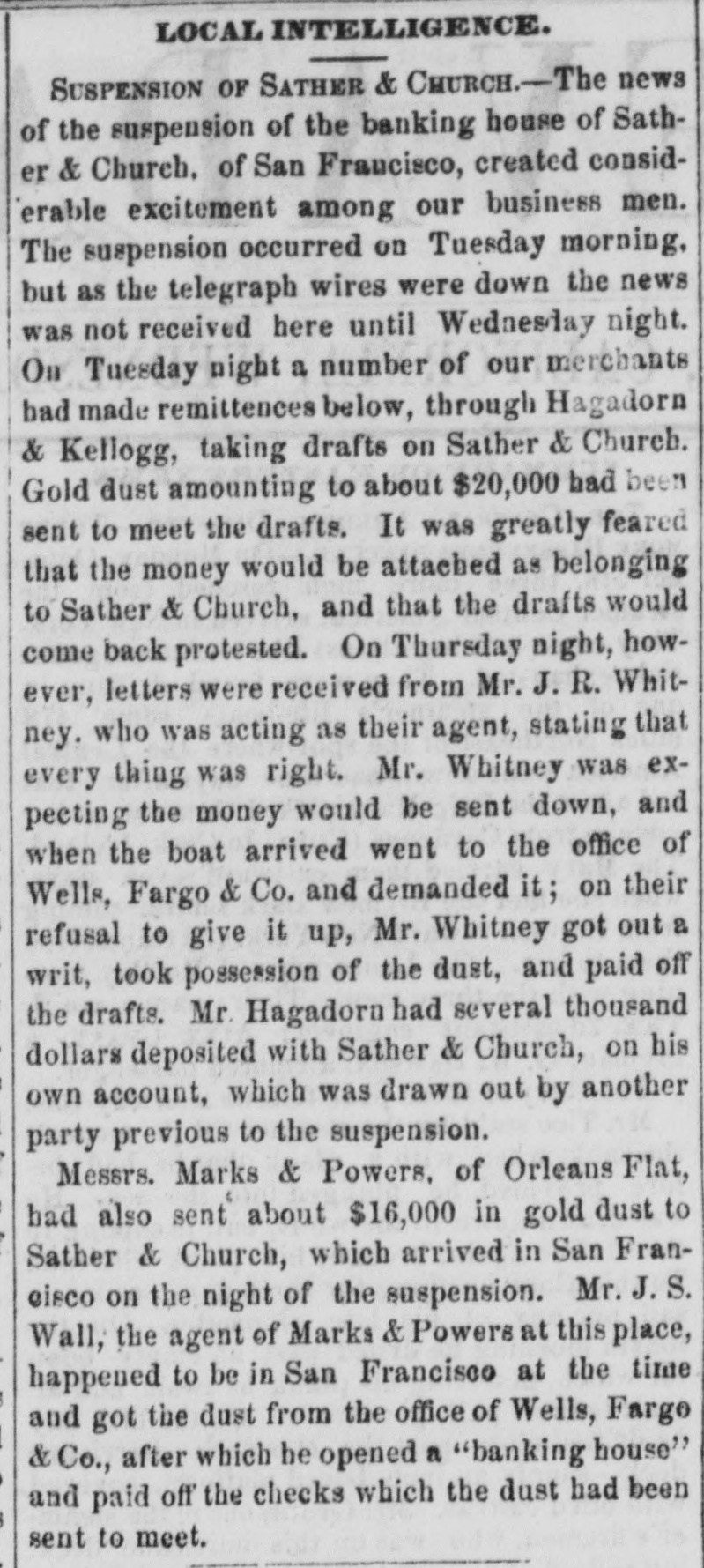 # The Financial Crisis It has long been evident that a financial crisis was in store for our country. Its signs were indelibly written on passing events. It has come. Two weeks since the Atlantic papers came with a long list of houses broken or suspended. A steamer has just arrived adding full two hundred names to the unlucky catalogue. A revulsion such as the commercial world has never witnessed now afflicts our brethren East. Nor is its evil effects confined to the Atlantic side. It must strike commerce the world over with a mildew blight. It cannot be otherwise. California is bound to feel it, not so poignantly, as her sister States from her peculiar position, but sensibly and disastrously. The pressure East had probably much to do with the assignment of an eminent banking house in San Francisco. Whatever may be the future of the house of Sather & Church, its recent suspension can have no other than deleterious influences. Confidence not fully recovered since the failures of Adams & Co., Page, Bacon & Co., is again shaken. Thousands will hereafter dare not deposit their hard earnings with self constituted bankers. Capital will return to the ground to benefit none. Miners will bury their gold, the currency of the country already too limited for trade, will be contracted, and hereafter we may expect a tightness in the money market, to which the present time, cannot compare. Credit must inevitably receive a check, and the cash system be inaugurated. Our summers are unproductive of gold. Our merchants will not, for they cannot, wait as they have done for the mining harvest. Demands will come upon the merchants of San Francisco from their brethren in New York, which they must meet in cash. Our country traders must furnish it for they live at the fountains of money. Thus when the mines are unproductive, thier population must be drained of the last dollar. Crashures are inevitable. We have no money market proper under the control of business men to whom we can go in an emergency and raise a thousand dollars by pledging ten for one. To whom shall we go for kelp to save a fortune on the brink of destruction, placed there perhaps by an unforseen accident? Such is the general distrust created by repeated failures, that the producers of capital, knowing nothing of securities and caring less, cannot be induced to part with it at any price. Regardless only of the consequences to themselves, and not to their neighbors, they will gripe their money in their own clutches. Thus business must be paralized, and honorable men despoiled by shylocks, lawyers and officers of the law. Experience teaches a dear school, but, it is said, fools will learn in no other. We have been, at last taught by experience, that men live possessed of more money than honor or business capacity, and very little of the first commodity. These have the assurance to open banking institutions "Fools rush in where angels fear to tread." They are perfectly irresponsible. No law protects the depositor. He becomes the victim of misplaced confidence. The man possessed of more brass than gold and more impudence than honesty, proves to be a swindler, or a squirt wasting his little substance in riotous living. Such is the repeated lesson. And yet locofocoism will never make an effort to establish a safe system of banking by law. It is the erying necessity of the times. Safe places of deposit are indispensible, and the State does not its duty to its citizens if it does not grant them protection. During the coming session of the legislature the State debt will probably be established on a secure basis. Four millions of State Bonds will make an excellent banking capital. Let the New York banking law be enacted in this State, and compel those who would become bankers to deposit ample security either in State Bonds or other safe pledges, with the State Controller, as guarantees of good faith and sureties for the depositor. The reign of rascality will then soon end, so far as banking institu-