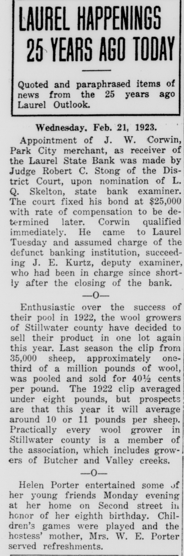 LAUREL HAPPENINGS 25 YEARS AGO TODAY Quoted and paraphrased items of news from the 25 years ago Laurel Outlook. Wednesday. Feb. 21, 1923. Appointment of J. W. Corwin, Park City merchant, as receiver of the Laurel State Bank was made by Judge Robert C. Stong of the District Court, upon nomination of L. Q. Skelton, state bank examiner. The court fixed his bond at $25,000 with rate of compensation to be determined later. Corwin qualified immediately. He came to Laurel Tuesday and assumed charge of the defunct banking institution, succeeding J. E. Kurtz, deputy examiner, who had been in charge since shortly after the closing of the bank. -0Enthusiastic over the success of their pool in 1922, the wool growers of Stillwater county have decided to sell their product in one lot again this year. Last season the clip from 35,000 sheep, approximately onethird of a million pounds of wool, was pooled and sold for 40½ cents per pound. The 1922 clip averaged under eight pounds, but prospects are that this year it will average around 10 or 11 pounds per sheep. Practically every wool grower in Stillwater county is a member of the association, which includes growers of Butcher and Valley creeks. -0Helen Porter entertained some of her young friends Monday evening at her home on Second street in honor of her eighth birthday. Children's games were played and the hostess' mother, Mrs. W. E. Porter served refreshments.