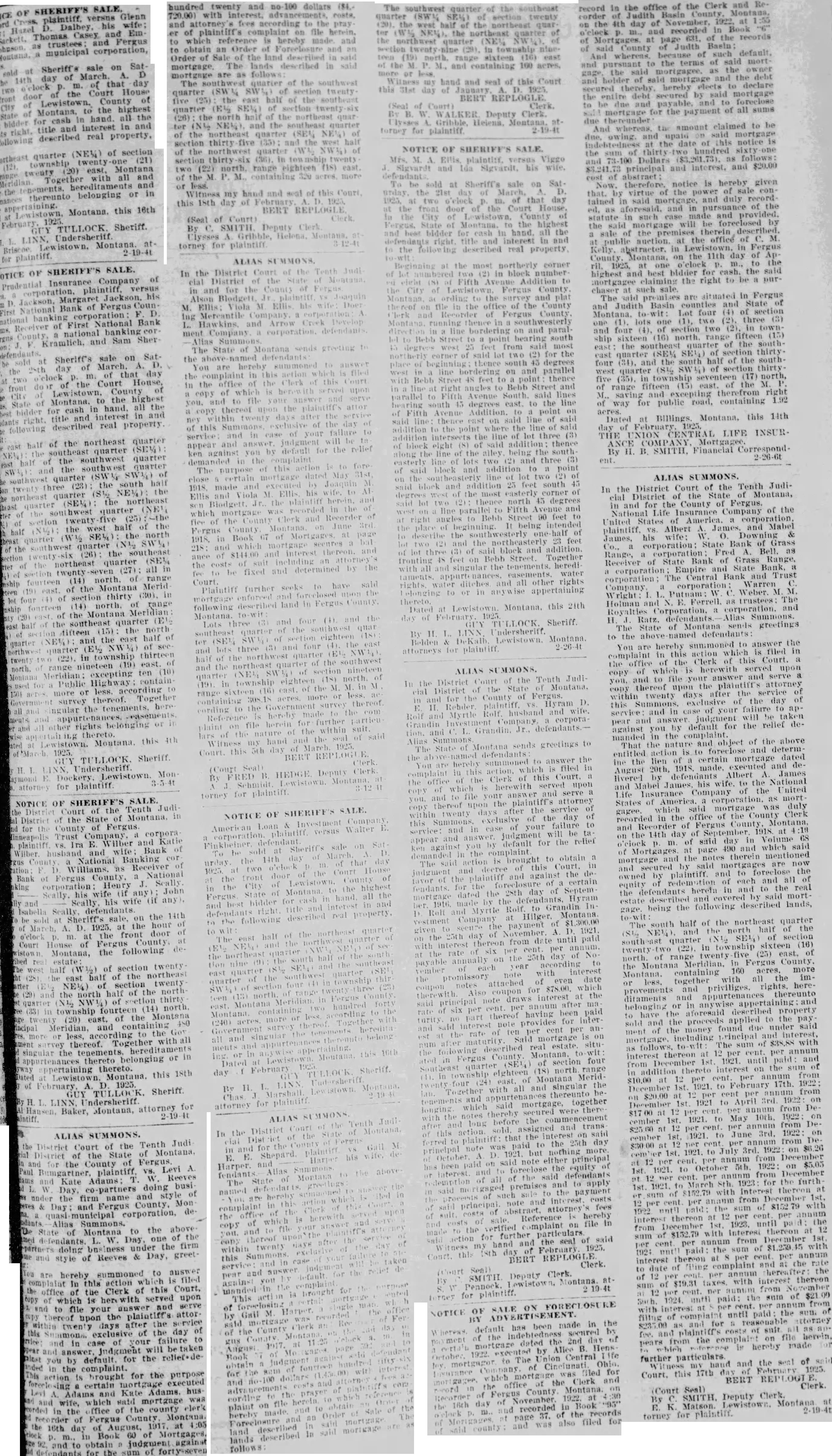 SHERIFF'S Glenn plaintiff, versus his and Em Thomas Casey and Fergus trustees as municipal corporation, SatSheriff's sale on A. D day of 14th that day m. of Court House the door County Lewistown, of the highest of all the hand. for cash and and interest title described real property, of section quarter (21) twenty township Montana (20) east, twenty with all and Together Meridian hereditaments belonging and in or thereunto this 16th Montana. Lewistown, 1925. February GUY TULLOCK. Sheriff. LINN, Montana. OF SHERIFF'S SALE. of Insurance Company Prudential plaintiff, versus D. Margaret Jackson. his National Bank of Fergus Counnational banking corporation: Receiver of First National Bank cora national County, Kramlich, and Sam Sherdefendants. sold at Sheriff's sale on Satthe 25th day of March. that A. day D. m. of o'clock front two of the Court House, County City State of Montana. to the highest bidder for cash in interest hand, all in and the title and following right. described real property. half of the northeast quarter the southeast quarter (SEM): half of the southwest quarter and the southwest quarter southwest quarter (SWW of twenty three (23): the south half northeast quarter the quarter (SE%) the northeast of the southwest quarter (NEW of section (25) half west half of the quarter (W½ SE%): the north southwest quarter (N½ (26): the southeast of the northeast quarter (SE% section (27): all in mship fourteen (14) north. of range (19) east. of the Montana Merid lot four of section thirty (30). in north. of range (14) fourteen of the Montana Meridian half of the southeast quarter (E½ fifteen (15): the north quarter NEW); and the east half of northwest quarter (E½ of sectwenty (22). in township thirteen north. range nineteen (19) east. of Montana Meridian: excepting ten (10) for Public Highway contain more or less. according to survey thereof. Together and Ingular the tenements, here other rights belonging or thereto. Lewistown. Montana, this 4th 1925. Sheriff. GUY E. Dockery, Lewistown. Mon attorney for plaintiff. hundred twenty and dollars ($4.and attorney's fees according to the pray er of plaintiff's complaint on file herein. to which reference is hereby made and to obtain an Order of and Order of Sale of the land described in said mortgage. The lands described in said mortgage are as follows: The southwest quarter of the southwest quarter (SWM of section twenty five the east half of the southeast quarter (E½ SE%) of twenty (26) the north half of the northeast quar NEW) and the southeast quarter (SEV of of the quarter section thirty five and the west half of the quarter of section (36). in twenty two (22) north. range eighteen (18) east. of the M P. M. containing 320 acres more or less. Witness my hand and seal of this Court. this 18th day of February 1925. BERT REPLOGLE (Seal of Court) By SMITH Deputy Clerk torney for plaintiff In the District Court of the Tenth Judi cial District of the State of Montana, in and for the County of M. Ellis: Viola M Ellis his Doer Ing Mercantile Company Hawkins. and Arrow Creek Develop ment Company corporation. defendants. Alias State of Montana sends greeting The the defendants You are hereby summoned the complaint in this action is filed in the office of the Clerk this Court copy of which is upon and and to file your you. copy thereof upon the plaintiff's after ney within twenty days after the of this Summons exclusive of the day service and in case of your failure to appear and answer judgment will be tn against you by default for the relief demanded in the complaint The purpose of this action is to fore close certain mortgage dated May 31st M made and Ellis and Viola M Ellis his to AT Blodgett. Jr. the plaintiff herein. and which mortgage was recorded in the of fice of the County Clerk and Recorder of Fergus County Montana June 3rd 1918. in Book 07 of at page 218: and which mortgage secures bal ance of and interest thereon. and the costs of suit an fee to be fixed and determined by the Plaintiff further seeks to have said mortgage enforced and moon the described land in Fergus Montana. Lots three (3) and four (1) and the southeast quarter of the southwest quar ter (SEM of eighteen and lots three (3) and four (4). the east and the northeast quarter of the southwest quarter of section 18) north. nineteen of eighteen (19). range sixteen township east. of the M. in M containing acres. more or less. cording to the Government Reference hereby made to the com plaint file herein for further partieu lars of the nature of the within seal suit. of said and the hand my Court. this 5th day of March 1925. BERT Clerk (Court Seal) Deputy B. HEDGE By FRED torney for plaintiff. NOTICE OF SHERIFF'S SALE. District Court of the Tenth Judi District of the State of Montana. in for the County of Fergus Inneapolis Trust Company, corpora plaintiff Ira E Wilber and Katie Wilber. husband and wife: Bank of County National Banking cor D. Williams. as Receiver of Bank of Fergus County. National nking corporation Henry Scally. Scally. his wife (if any John wife (if his sold at Sheriff's sale, on the 14th of March, A. D. 1925. at the hour of o'clock at the front door of Court House of Fergus County. at Montana, the following deestate: west half of section twenty. the east half of the northeast arter NE14) of section twenty (29) and the north half of the north quarter NW½ of section thirty (33) in township fourteen (14) north, twenty (20) east, of the Montana incipal Meridian, and containing 450 more or less, according to the Gov ament survey thereof. Together with all singular the tenements. appurtenances thereto belonging or in yway uppertaining thereto. Lewistown. Montana. this 18th of D. Hausen, Baker, Montana, attorney for ALIAS SUMMONS. District Court of the Tenth Judi District of the State of Montana, and for the County of Fergus Paul Bumgartner, plaintiff, VS. Levi A. and Kate Adams: Reeves Day, co-partners doing busi under the firm name and style of and Fergus County