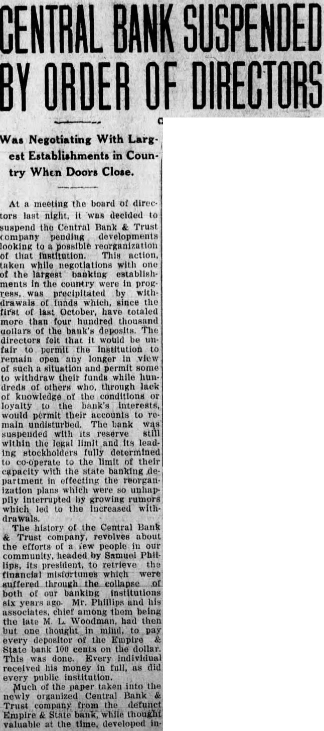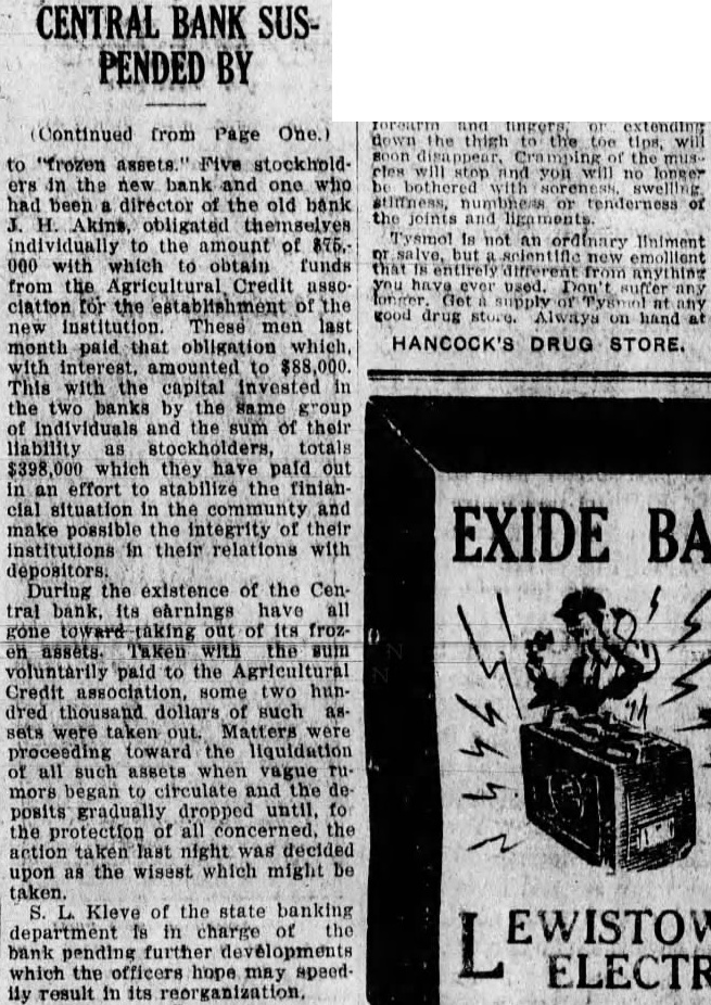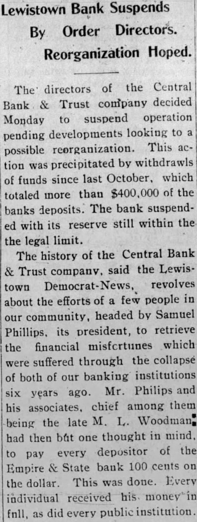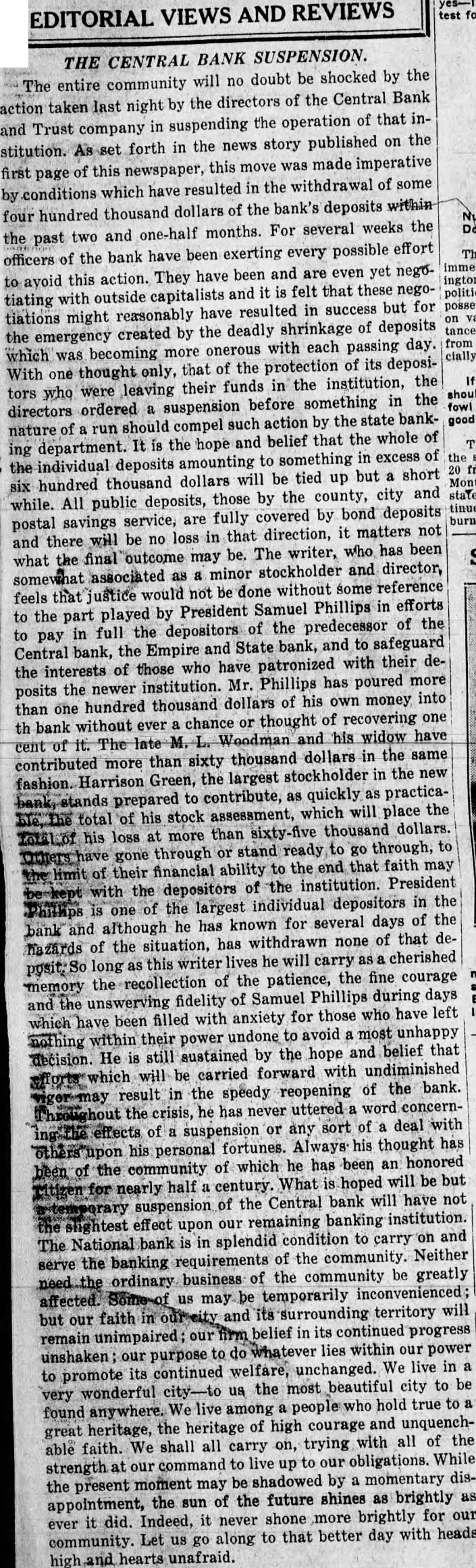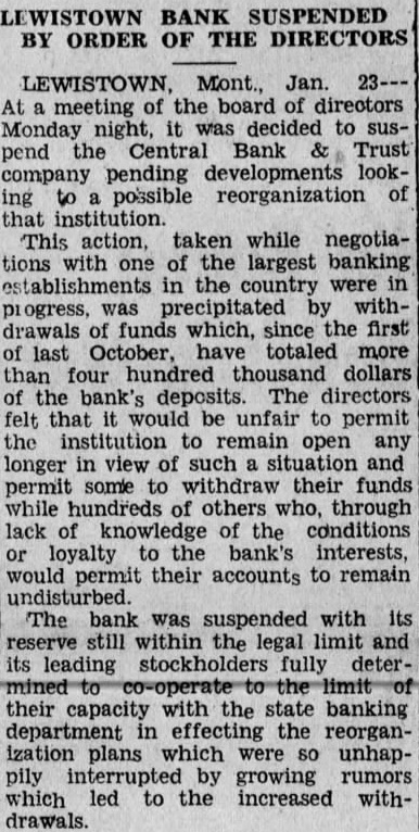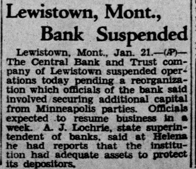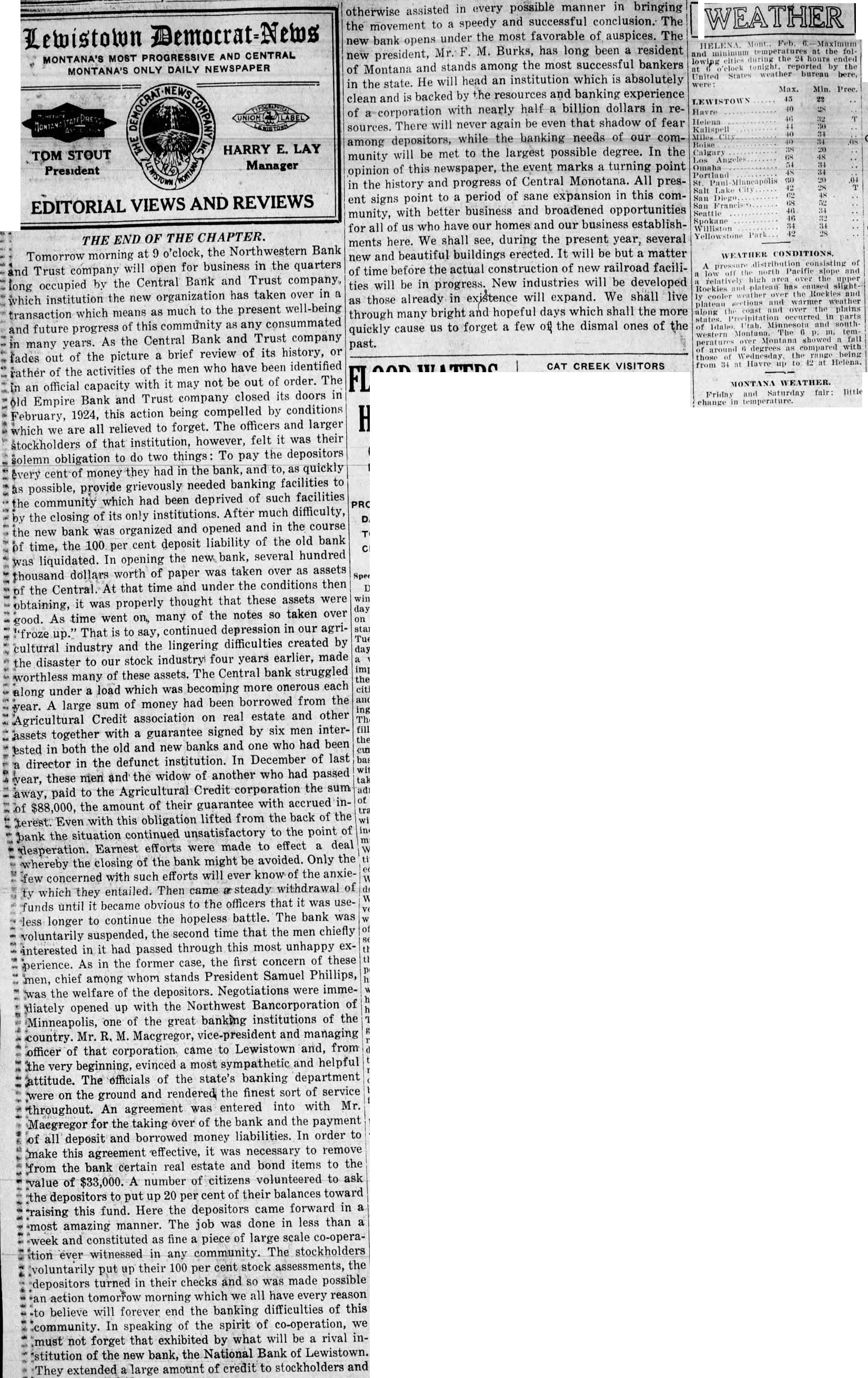 THE END OF THE CHAPTER. Tomorrow morning at 9 o'clock, the Northwestern Bank and Trust company will open for business in the quarters long occupied by the Central Bank and Trust company, which institution the new organization has taken over in a transaction which means as much to the present well-being and future progress of this community as any consummated in many years. As the Central Bank and Trust company past. fades out of the picture a brief review of its history, or rather of the activities of the men who have been identified in an official capacity with it may not be out of order. The old Empire Bank and Trust company closed its doors in February, 1924, this action being compelled by conditions which we are all relieved to forget. The officers and larger stockholders of that institution, however, felt it was their solemn obligation to do two things: To pay the depositors every cent of money they had in the bank, and to, as quickly as possible, provide grievously needed banking facilities to the community which had been deprived of such facilities by the closing of its only institutions. After much difficulty, the new bank was organized and opened and in the course of time, the 100 per cent deposit liability of the old bank was liquidated. In opening the new bank, several hundred thousand dollars worth of paper was taken over as assets of the Central. At that time and under the conditions then obtaining, it was properly thought that these assets were good. As time went on, many of the notes SO taken over froze up." That is to say, continued depression in our agricultural industry and the lingering difficulties created by the disaster to our stock industry four years earlier, made worthless many of these assets. The Central bank struggled along under a load which was becoming more onerous each year. A large sum of money had been borrowed from the Agricultural Credit association on real estate and other assets together with a guarantee signed by six men interested in both the old and new banks and one who had been director in the defunct institution. In December of last year, these men and the widow of another who had passed away, paid to the Agricultural Credit corporation the sum of $88,000, the amount of their guarantee with accrued interest. Even with this obligation lifted from the back of the bank the situation continued unsatisfactory to the point of desperation. Earnest efforts were made to effect a deal whereby the closing of the bank might be avoided. Only the few concerned with such efforts will ever know of the anxiety which they entailed. Then came a steady withdrawal of funds until it became obvious to the officers that it was useless longer to continue the hopeless battle. The bank was voluntarily suspended, the second time that the men chiefly interested in it had passed through this most unhappy experience. As in the former case, the first concern of these men, chief among whom stands President Samuel Phillips, was the welfare of the depositors. Negotiations were immediately opened up with the Northwest Bancorporation of Minneapolis, one of the great banking institutions of the country. Mr. R. M. Macgregor, vice-president and managing officer of that corporation. came to Lewistown and, from the very beginning, evinced a most sympathetic and helpful attitude. The officials of the state's banking department were on the ground and rendered the finest sort of service throughout. An agreement was entered into with Mr. Macgregor for the taking over of the bank and the payment of all deposit and borrowed money liabilities. In order to make this agreement effective, it was necessary to remove from the bank certain real estate and bond items to the "value of $33,000. A number of citizens volunteered to ask the depositors to put up 20 per cent of their balances toward "raising this fund. Here the depositors came forward in a most amazing manner. The job was done in less than a week and constituted as fine a piece of large scale co-operaition ever witnessed in any community. The stockholders voluntarily put up their 100 per cent stock assessments, the depositors turned in their checks and so was made possible *an action tomorrow morning which we all have every reason to believe will forever end the banking difficulties of this community. In speaking of the spirit of co-operation, we must not forget that exhibited by what will be a rival institution of the new bank, the National Bank of Lewistown. They extended a large amount of credit to stockholders and otherwise assisted in every possible manner in bringing the movement to a speedy and successful conclusion. The new bank opens under the most favorable of auspices. The new president, Mr. M. Burks, has long been a resident MONTANA'S MOST PROGRESSIVE AND CENTRAL of Montana and stands among the most successful bankers MONTANA'S ONLY DAILY NEWSPAPER in the state. He will head an institution which is absolutely clean and is backed by the resources and banking experience of corporation with nearly half a billion dollars in reCOMPANY sources. There will never again be even that shadow of fear among depositors, while the banking needs of our comTHE HARRY E. LAY TOM STOUT munity will be met to the largest possible degree. In the Manager President opinion of this newspaper, the event marks a turning point in the history and progress of Central Monotana. All present signs point to a period of sane expansion in this comEDITORIAL VIEWS AND REVIEWS munity, with better business and broadened opportunities for all of us who have our homes and our business establishments here. We shall see, during the present year, several new and beautiful buildings erected. It will be but a matter of time before the actual construction of new railroad facilities will be in progress. New industries will be developed as those already in existence will expand. We shall live through many bright and hopeful days which shall the more quickly cause us to forget a