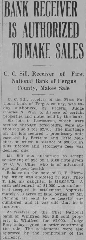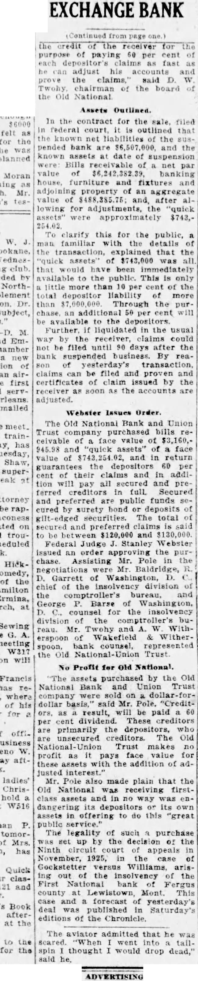 "The assets purchased by the Old National Bank and Union Trust company were sold on dollar basis, said Mr. Pole. "Creditors, result, will be paid 60 per cent dividend. These creditors are primarily the depositors, are unsecured creditors. The Old National-Union Trust makes profit as pays face value for these assets the addition of adjusted Mr Pole also made plain that the Old National was firstclass assets and in no way was endangering its depositors its own assets in offering to do this "great public The legality of such a purchase was set up by the decision of the Ninth court appeals in November, the case of ing out of the insolvency of the First National bank Fergus county at Lewistown, Mont. This case and forecast of yesterday's deal was published in Saturday's editions of the