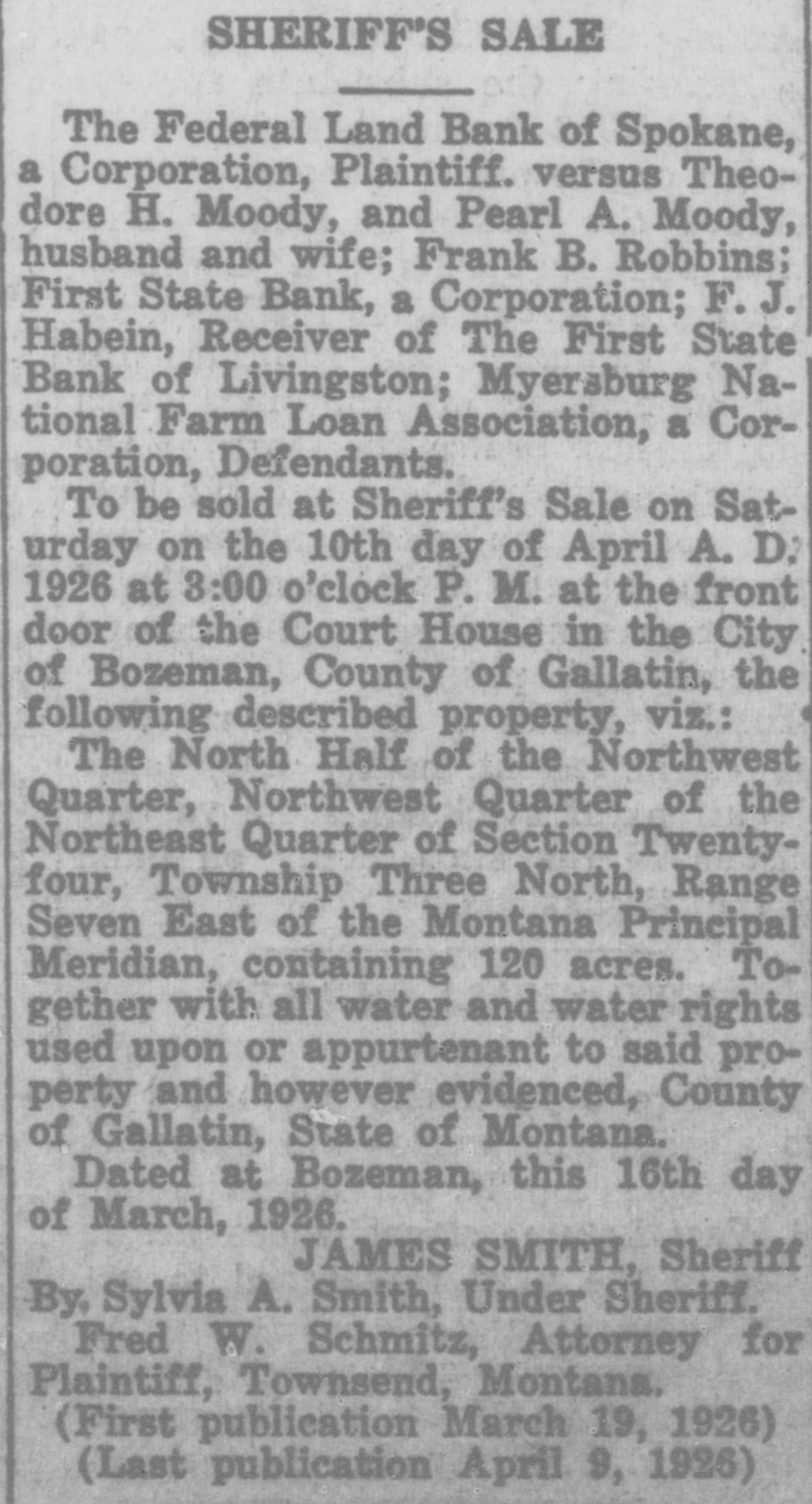 To be sold at Sheriff's Sale on Saturday on the 10th day of April A. D: 1926 at 3:00 o'clock P. M. at the front door of the Court House in the City of Bozeman, County of Gallatin, the following described property, viz.: The North Half of the Northwest Quarter, Northwest Quarter of the Northeast Quarter of Section Twenty-four, Township Three North, Range Seven East of the Montana Principal Meridian, containing 120 acres. Together with all water and water rights used upon or appurtenant to said property and however evidenced, County of Gallatin, State of Montana.