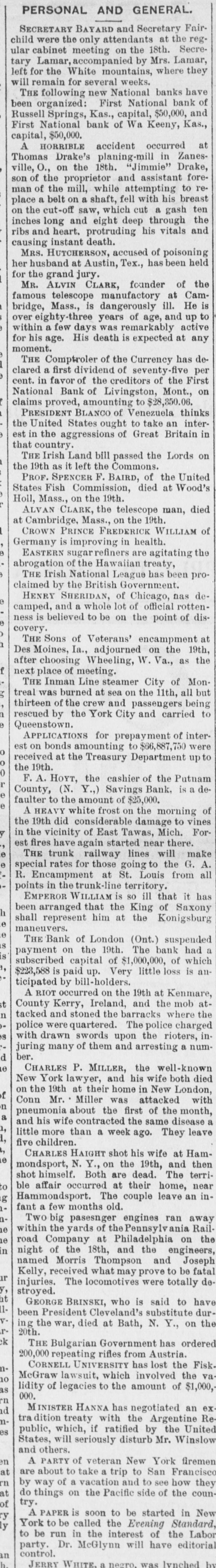 PERSONAL AND GENERAL. SECRETARY BAYARD and Secretary ild were the only attendants at the ar cabinet meeting on the 18th. ry Lamar, accompanied by Mrs. Lama it for the White mountains, where the ill remain for several weeks. THE following new National banks en organized: First National bank ussell Springs, Kas., capital, $50,000, rst National bank of Wa Keeny, pital, $50,000. A HORRIBLE accident occurred nomas Drake's planing-mill in lle, O., on the 18th. "Jimmie" Drak n of the proprietor and assistant an of the mill, while attempting to ace a belt on a shaft, fell with his 1 the cut-off saw, which cut a gash ches long and eight deep through os and heart. protruding his vitals using instant death. MRS. HUTCHERSON, accused of poisonin r husband at Austin, Tex., has been r the grand jury. MR. ALVIN CLARK, founder of mous telescope manufactory at idge, Mass., is dangerously ill. He er eighty-three years of age, and up ithin a few days was remarkably r his oment. age. His death is expected at THE Comptroler of the Currency has ared a first dividend of seventy-five nt. in favor of the creditors of the ational Bank of Livingston, Mont., aims proved, amounting to $28,850.06. PRESIDENT BLANCO of Venezuela thin e United States ought to take an t in the aggressions of Great Britain at country. THE Irish Land bill passed the Lords e 19th as it left the Commons. PROF. SPENCER F. BAIRD, of the Unit ates Fish Commission, died at Wood oll, Mass., on the 19th. ALVAN CLARK, the telescope man, Cambridge, Mass., on the 19th. CROWN PRINCE FREDERICK WILLIAM ermany is improving in health. EASTERN sugar refiners are agitating orogation of the Hawaiian treaty, THE Irish National League has been aimed by the British Government. HENRY SHERIDAN, of Chicago, nas imped, and a whole lot of official ess is very. believed to be on the point of THE Sons of Veterans' encampment es Moines, Ia., adjourned on the ter choosing Wheeling, W. Va., as xt place of meeting. THE Inman Line steamer City of eal was burned at sea on the 11th, all irteen of the crew and passengers scued by ueenstown. the York City and carried APPLICATIONS for prepayment of t on bonds amounting to $66,887,750 ceived at the Treasury Department e 19th. F. A. HOYT, the cashier of the Putna ounty, (N. Y.,) Savings Bank, is a ulter to the amount of $25,000. A HEAVY white frost on the morning e 19th did considerable damage to the vicinity of East Tawas, Mich. t fires have again started near there. THE trunk railway lines will ecial rates for those going to the G. . Encampment at St. Louis from oints in the trunk-line territory. EMPEROR WILLIAM is so ill that it en arranged that the King of