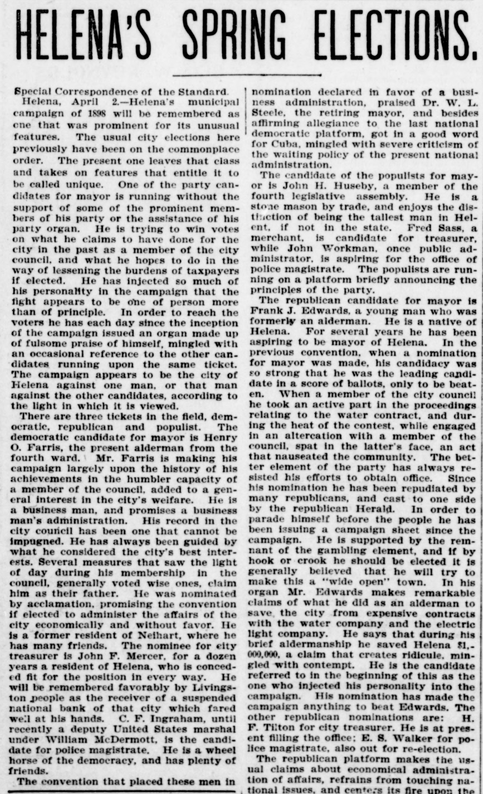 HELENA'S SPRING ELECTIONS. nomination declared in favor of a busiSpecial Correspondence of the Standard Helena, April 2.-Helena's municipal ness administration, praised Dr. W. L. Steele, the retiring mayor, and besides campaign of 1898 will be remembered as affirming allegiance to the last national one that was prominent for its unusual democratic platform, got in a good word features. The usual city elections here for Cuba, mingled with severe criticism of previously have been on the commonplace the waiting policy of the present national order. The present one leaves that class administration. and takes on features that entitle it to The candidate of the populists for maybe called unique. One of the party canor is John H. Huseby, a member of the fourth legislative assembly. He is a didates for mayor is running without the stone mason by trade, and enjoys the dissupport of some of the prominent memtinction of being the tallest man in Helbers of his party or the assistance of his ent. if not in the state. Fred Sass, a party organ. He is trying to win votes merchant, is candidate for treasurer, on what he claims to have done for the while John Workman, once public adcity in the past as a member of the city ministrator. is aspiring for the office of council, and what he hopes to do in the police magistrate. The populists are runway of lessening the burdens of taxpayers ning on a platform briefly announcing the if elected. He has injected so much of principles of the party. his personality in the campaign that the The republican candidate for mayor is fight appears to be one of person more Frank J. Edwards, a young man who was than of principle. In order to reach the formerly an alderman. He is a native of voters he has each day since the inception Helena. For several years he has been of the campaign issued an organ made up aspiring to be mayor of Helena. In the of fulsome praise of himself, mingled with previous convention. when a nomination an occasional reference to the other canfor mayor was made, his candidacy was didates running upon the same ticket. so strong that he was the leading candiThe campaign appears to be the city of date in a score of ballots, only to be beatHelena against one man, or that man en. When a member of the city council against the other candidates, according to he took an active part in the proceedings the light in which it is viewed. relating to the water contract, and durThere are three tickets in the field, deming the heat of the contest, while engaged ocratic, republican and populist. The in an altercation with a member of the democratic candidate for mayor is Henry council, spat in the latter's face, an act O. Farris, the present alderman from the that nauseated the community. The betfourth ward. Mr. Farris is making his ter element of the party has always recampaign largely upon the history of his sisted his efforts to obtain office. Since achievements in the humbler capacity of his nomination he has been repudiated by a member of the council. added to a genmany republicans, and cast to one side eral interest in the city's weifare. He is by the republican Herald. In order to a business man, and promises a business parade himself before the people he has man's administration. His record in the been issuing a campaign sheet since the city council has been one that cannot be campaign. He is supported by the reinimpugned. He has always been guided by nant of the gambling element, and if by what he considered the city's best interhook or crook he should be elected it is ests. Several measures that saw the light generally believed that he will try to of day during his membership in the make this a "wide open" town. In his council, generally voted wise ones, claim organ Mr. Edwards makes remarkable him as their father. He was nominated claims of what he did as an alderman to by acclamation, promising the convention save the city from expensive contracts if elected to administer the affairs of the with the water company and the electric city economically and without favor. He light company. He says that during his is a former resident of Neihart, where he brief aldermanship he saved Helena $1,has many friends. The nominee for city 000,000, a claim that creates ridicule. mintreasurer is John F. Mercer, for a dozen gled with contempt. He is the candidate years a resident of Helena, who is concedreferred to in the beginning of this as the ed fit for the position in every way. He one who injected his personality into the will be remembered favorably by Livingscampaign. His nomination has made the ton people as the receiver of a suspended campaign anything to beat Edwards. The national bank of that city which fared other republican nominations are: H. we'l at his hands. C. F. Ingraham, until F. Tilton for city treasurer. He is at presrecently a deputy United States marshal ent filling the office: E. S. Walker for pounder William McDermott, is the candilice magistrate, also out for re-election. date for police magistrate. He is a wheel The republican platform makes the ushorse of the democracy, and has plenty of ual claims about economical administrafriends. tion of affairs, refrains from touching naThe convention that placed these men in tional issues, and centers its fire upon the