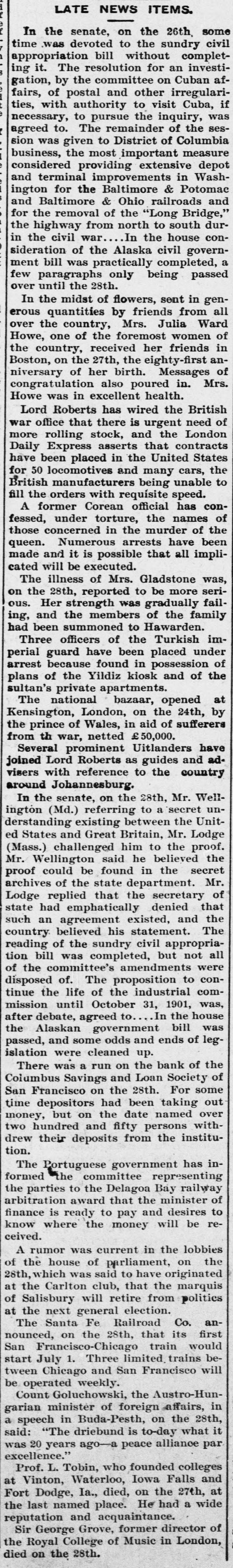 LATE NEWS ITEMS. the senate, on the 26th, some civil In was devoted to the sundry complettime bill without investiappropriation it. The resolution for an Cuban afing by the committee on and other with authority to visit ties, to pursue the of the to. The remainder necessary, agreed fairs, gation, of postal inquiry, irregulari- Columbia Cuba, ses- was if given to District of measure sion was the most important depot business, providing extensive in Washimprovements Potomac and for the Baltimore & Ohio ington considered terminal Baltimore railroads & Bridge," and and removal of the "Long south durIn the the civil war the for the highway from north to house consideration in bill was of the practically Alaska civil completed, govern- passed a ment few paragraphs only being until the 28th. over the midst of flowers, sent from in gen- all In quantities by friends Ward erous the country, Mrs. Julia women of over of the foremost in Howe, one received her friends anthe country, on the 27th, the eighty-fir of Boston, of her birth. Messages Mrs. congratulation niversary also poured health. in. was in excellent Howe Roberts has wired the British of Lord that there is urgent war stock, and office rolling that the contracts London need more Express asserts United States Daily been placed in the cars, the have locomotives and many unable to for 50 manufacturers being speed. British fill the orders with requisite official has conformer Corean the names of A under torture, murder of the fessed, concerned in the have been those Numerous arrests all impliqueen. made and it is possible that cated will be executed. illness of Mrs. Gladstone was, seriThe 28th, reported to be more failon the was gradually the members of ing, summoned to had ous. been and Her strength Hawarden. Turkish the family imofficers of the under perial Three guard have been in placed possession of arrest of because the Yildiz found kiosk and of the at plans private apartments. sultan's The national bazaar, the opened 24th, by Kensington, of London, Wales, in on aid of sufferers the from prince th war, prominent netted £50,000. Uitlanders and have adSeveral Lord Roberts as guides country joined visers with reference to the around Johannesburg. Wellthe senate, on the 28th, `secret Mr. unIn (Md.) referring to a the Unitderstanding ington and existing Great Britain, between Mr. Lodge proof. challenged believed said the be found in proof of the state that the ed archives Mr. (Mass.) States Wellington could him department. he to secretary the secret that Mr. the of Lodge had replied emphatically denied and the an agreement of believed the sundry civil but not was completed, country such reading state bill his amendments existed, statement. appropria- were The all tion committee's to conof the of. The proposition comdisposed life of the industrial 1901, was, tinue the until October 31, the house debate, agreed after mission government to In bill was passed, cleaned up. the Alaskan and some odds and ends of legislation on the of There were was a run and Loan bank Society of the Columbus Savings 28th. For some Francisco on the been taking out San time depositors the had date named with over money, but on fifty persons drew two hundred their deposits and from the instituintion. The Portuguese committee government representing railway has formed the to the Delagoa the Bay minister of arbitration the parties award that and desires to know where the finance is ready to money pay will be received. rumor was current in the on lobbies the of A the which house was of said parliament, to that have the originated marquis 28th, at the Carlton will club, retire from politics of Salisbury general election. at the next Fe Railroad Co. first anThe Santa on the 28th, that train its would San nounced, Francisco-Chicago.ited Three trains will bestart tween July Chicago 1. and San Francisco be operated Goluchowski, weekly. the Austro-Hun- affairs, in garian Count minister in Buda-Pesth, of foreign is to-day on the what 28th, 20 a "The driebund alliance L. Tobin, who Falls said: was excellence." speech years ago-a peace founded Iowa colleges and par it last named place. at Fort Prof. Vinton, Dodge, Waterloo, Ia., died, on He the had 27th, a wide at of the and acquaintance. former director died on the 28th. the reputation Sir Royal George College Grove, of Music in London,