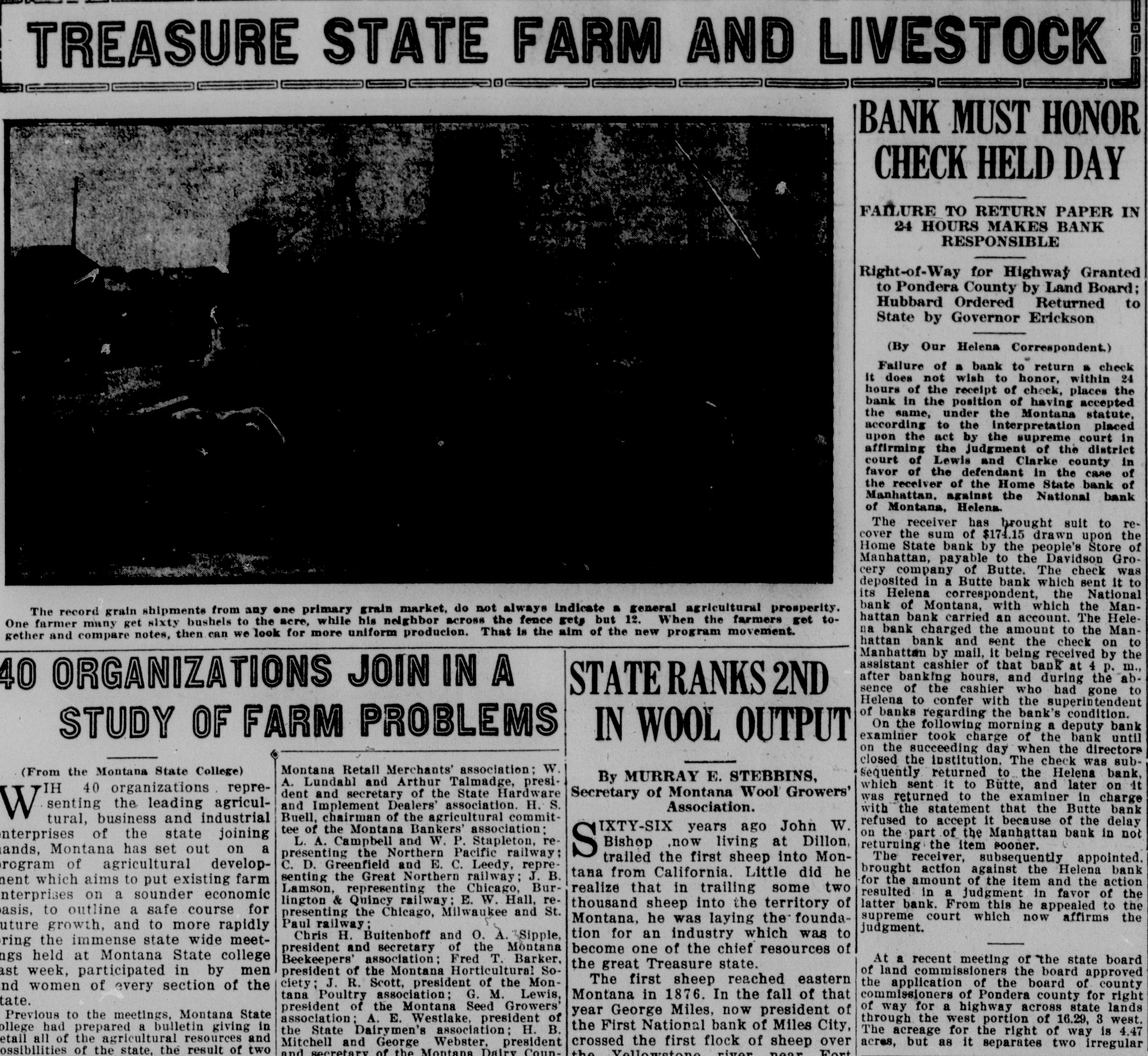 TREASURE STATE FARM AND LIVESTOCK BANK MUST HONOR CHECK HELD DAY FAILURE TO RETURN PAPER IN 24 HOURS MAKES BANK RESPONSIBLE Right-of-Way for Highway Granted to Pondera County by Land Board; Hubbard Ordered Returned to State by Governor Erickson (By Our Helena Correspondent.) Failure of a bank to return a check it does not wish to honor, within 24 hours of the receipt of check, places the bank in the position of having accepted the same, under the Montana statute, according to the interpretation placed upon the act by the supreme court in affirming the judgment of the district court of Lewis and Clarke county in favor of the defendant in the case of the receiver of the Home State bank of Manhattan, against the National bank of Montana, Helena. The receiver has brought suit to recover the sum of $174.15 drawn upon the Home State bank by the people's Store of Manhattan, payable to the Davidson Grocery company of Butte. The check was deposited in a Butte bank which sent it to its Helena correspondent, the National bank of Montana, with which the ManThe record grain shipments from any one primary grain market, do not always indicate a general agricultural prosperity. hattan bank carried an account. The HeleOne farmer many get sixty bushels to the acre, while his neighbor across the fence gets but 12. When the farmers get tona bank charged the amount to the Mangether and compare notes, then can we look for more uniform producion. That is the aim of the new program movement. hattan bank and sent the check on to Manhattan by mail, it being received by the assistant cashier of that bank at 4 p. m., after banking hours, and during the ab40 ORGANIZATIONS JOIN IN A STATE RANKS 2ND sence of the cashier who had gone to Helena to confer with the superintendent of banks regarding the bank's condition. On the following morning a deputy bank STUDY OF FARM PROBLEMS examiner took charge of the bank until IN WOOL OUTPUT on the succeeding day when the directors closed the institution. The check was subMontana Retail Merchants' association: W. (From the Montana State College) Sequently returned to the Helena bank, By MURRAY E. STEBBINS, A. Lundahl and Arthur Talmadge, presiwhich sent it to Butte, and later on it IH 40 organizations repredent and secretary of the State Hardware Secretary of Montana Wool Growers' was returned to the examiner in charge senting the leading agriculand Implement Dealers' association. H. S. Association. with the statement that the Butte bank W Buell, chairman of the agricultural committural, business and industrial refused to accept it because of the delay IXTY-SIX years ago John W. tee of the Montana Bankers' association: on the part of the Manhattan bank in not nterprises of the state joining L. A. Campbell and W. P. Stapleton, reBishop ,now living at Dillon, returning the item sooner. ands, Montana has set out on a S presenting the Northern Pacific railway; trailed the first sheep into MonThe receiver, subsequently appointed. C. D. Greenfield and E. C. Leedy, reprerogram of agricultural developbrought action against the Helena bank tana from California. Little did he senting the Great Northern railway; J. B. nent which aims to put existing farm for the amount of the item and the action Lamson, representing the Chicago, Burrealize that in trailing some two resulted in a judgment in favor of the nterprises on a sounder economic lington & Quincy railway; E. W. Hall, rethousand sheep into the territory of latter bank. From this he appealed to the asis, to outline a safe course for presenting the Chicago, Milwaukee and St. supreme court which now affirms the Montana, he was laying the foundaPaul railway; uture growth, and to more rapidly judgment. tion for an industry which was to Chris H. Buitenboff and O. A. Sipple, ring the immense state wide meetpresident and secretary of the Montana become one of the chief resources of held at Montana State college Beekeepers' association; Fred T. Barker. At a recent meeting of the state board the great Treasure state. president of the Montana Horticultural Soweek, participated in by men of land commissioners the board approved The first sheep reached eastern ciety; J. R. Scott, president of the Monthe application of the board of county nd women of every section of the Montana in 1876. In the fall of that tana Poultry association; G. M. Lewis, commissioners of Pondera county for right tate. of way for a highway across state lands president of the Montana Seed Growers' year George Miles, now president of Previous to the meetings, Montana State association: A. E. Westlake, president of through the west portion of 16.29, 3 west. the First National bank of Miles City, ollege had prepared a bulletin giving in the State Dairymen's association: H. B. The acreage for the right of way is 4.47 etail all of the agricultural resources and crossed the first flock of sheep over Mitchell and George Webster, president acres, but as it separates two irregular the Vellowstone river near Fort ossibilities of the state, the result of two and secretary of the Montana Dairy Coun-