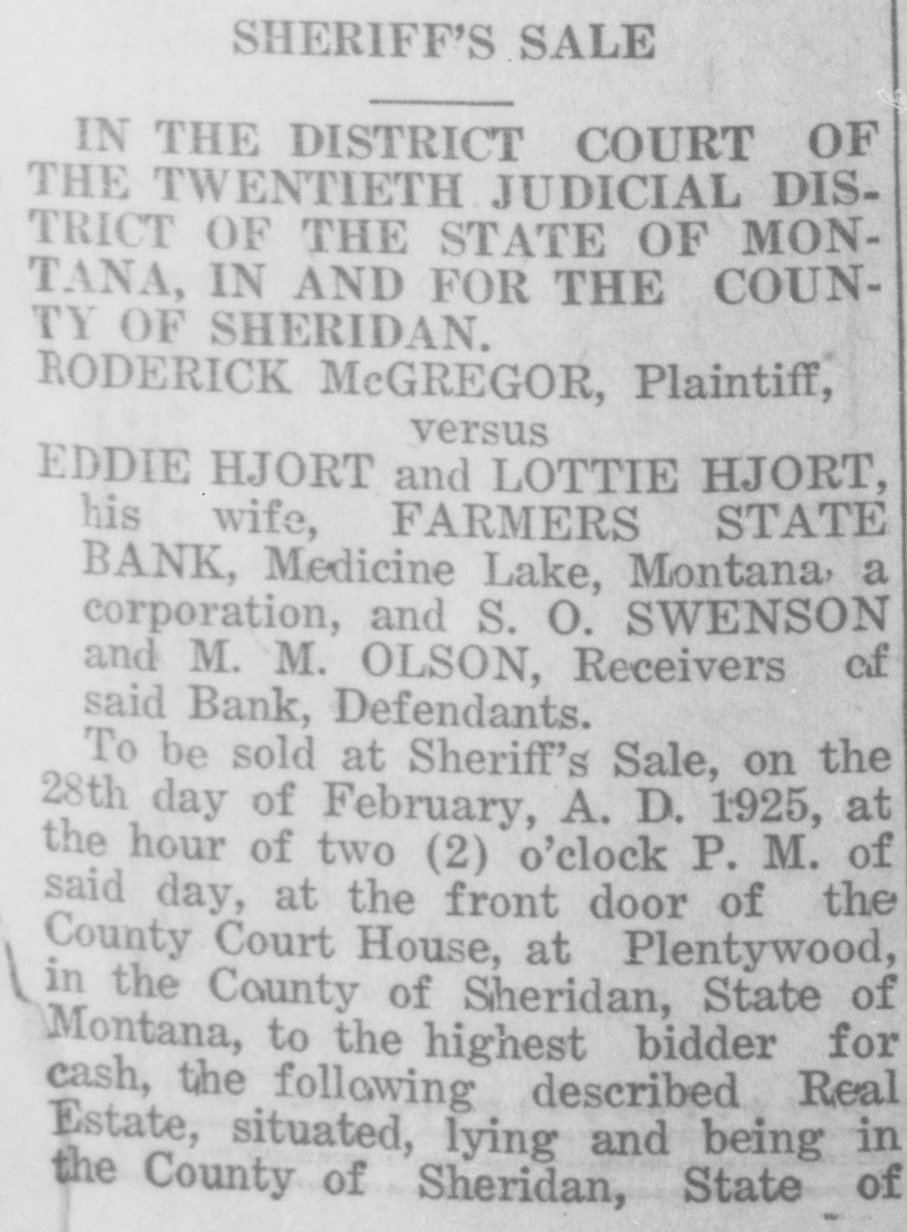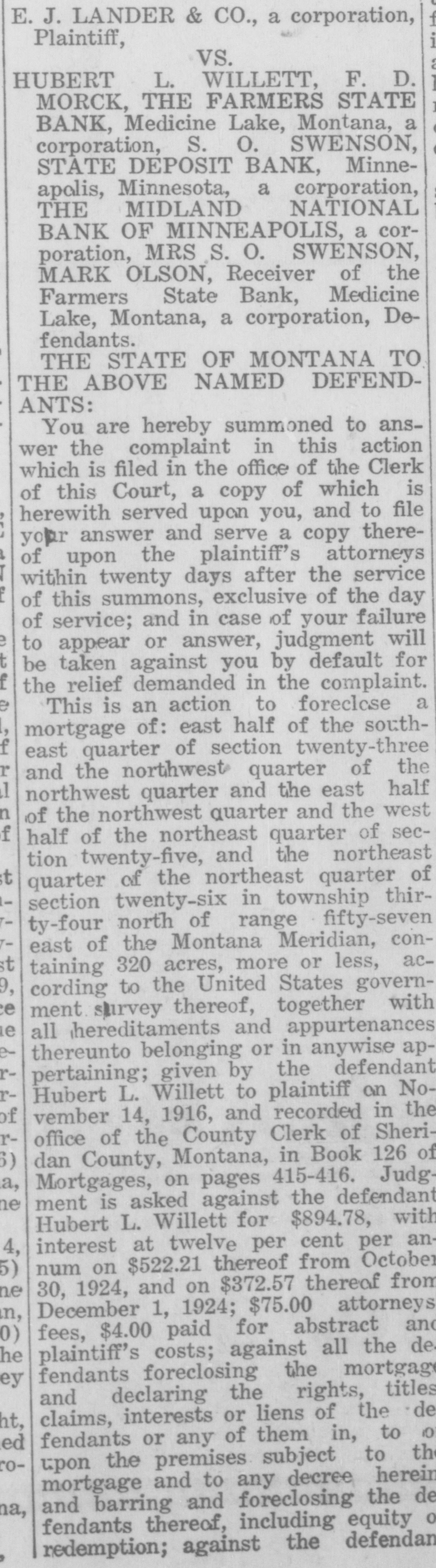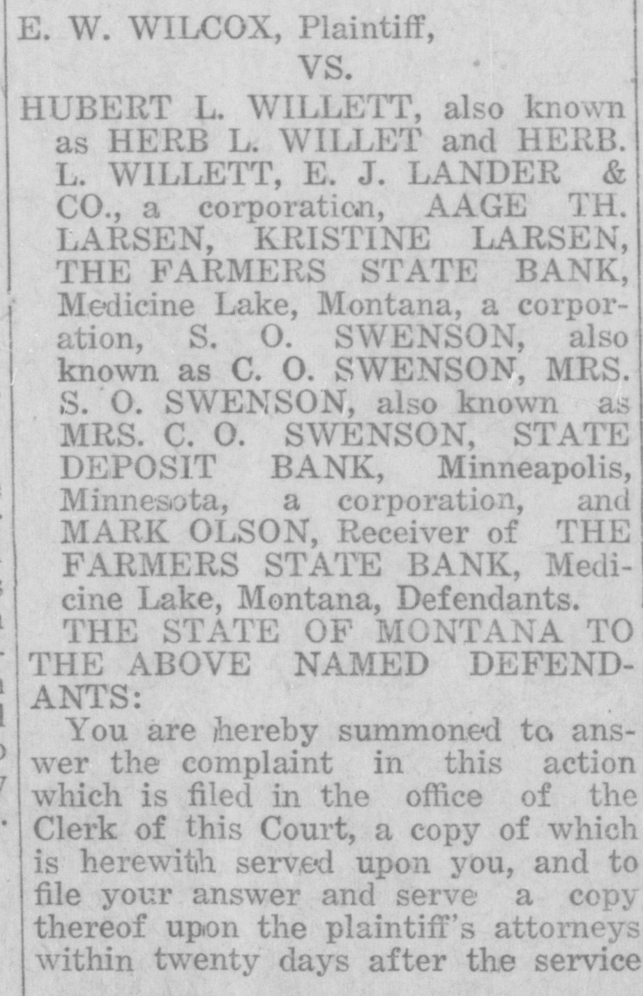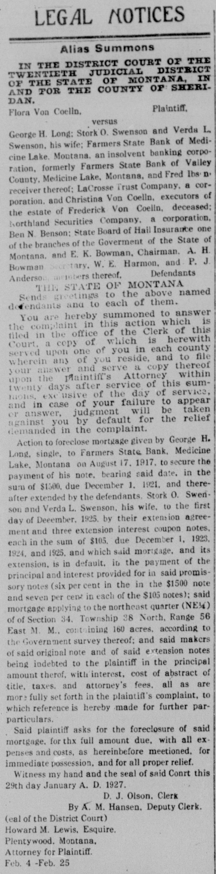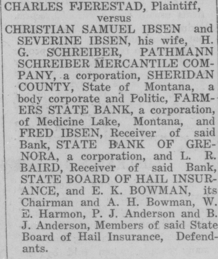 George H. Long; Stork O. Swenson and Verda L. Swenson, his wife; Farmers State Bank of Medicine Lake. Montana, an insolvent banking corporation, formerly Farmers State Bank of Valley County, Medicine Lake, Montana, and Fred Ibs n receiver thereof; LaCrosse Trust Company, a corporation, and Christina Von Coelln, executors of the estate of Frederick Von Coelln, deceased; Northland Securities Company, a corporation, Ben N. Benson; State Board of Hail Insurance one of the branches of the Goverment of the State of Montana, and E. K. Bowman, Chairman. A. H. Bowman Secretary, W. E. Harmon, and. P. J. Anderson, members thereof, Defendants