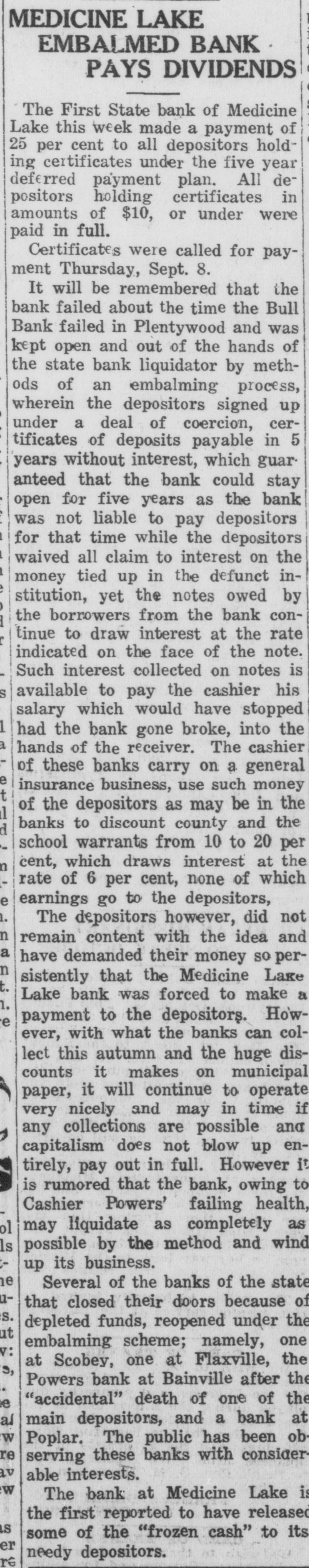 MEDICINE LAKE EMBALMED BANK PAYS DIVIDENDS The First State bank of Medicine Lake this week made a payment of 25 per cent to all depositors holding certificates under the five year deferred payment plan. All depositors holding certificates in amounts of $10, or under were paid in full. Certificates were called for payment Thursday, Sept. 8. It will be remembered that the bank failed about the time the Bull Bank failed in Plentywood and was kept open and out of the hands of the state bank liquidator by methods of an embalming process, wherein the depositors signed up under a deal of coercion, certificates of deposits payable in 5 years without interest, which guar anteed that the bank could stay open for five years as the bank was not liable to pay depositors for that time while the depositors waived all claim to interest on the money tied up in the defunct institution, yet the notes owed by the borrowers from the bank continue to draw interest at the rate indicated on the face of the note. Such interest collected on notes is S available to pay the cashier his salary which would have stopped had the bank gone broke, into the hands of the receiver. The cashier of these banks carry on a general e insurance business, use such money of the depositors as may be in the d school warrants from 10 to 20 per cent, which draws interest at the UNITED banks to discount county and the C rate of 6 per cent, none of which e earnings go to the depositors, The depositors however, did not n remain content with the idea and a have demanded their money SO pern sistently that the Medicine Lake Lake bank was forced to make a 1. payment to the depositors. Ho'we ever, with what the banks can collect this autumn and the huge discounts it makes on municipal paper, it will continue to operate very nicely and may in time if any collections are possible and capitalism does not blow up entirely, pay out in full. However it is rumored that the bank, owing to Cashier Powers' failing health, may liquidate as completely as ol Is possible by the method and wind up its business. e Several of the banks of the state -1 that closed their doors because of S. depleted funds, reopened under the ut embalming scheme; namely, one v: at Scobey, one at Flaxville, the 9, Powers bank at Bainville after the "accidental" death of one of the al main depositors, and a bank at W Poplar. The public has been ob re serving these banks with considerav able interests. W The bank at Medicine Lake is the first reported to have released is some of the "frozen cash" to its er needy depositors. re