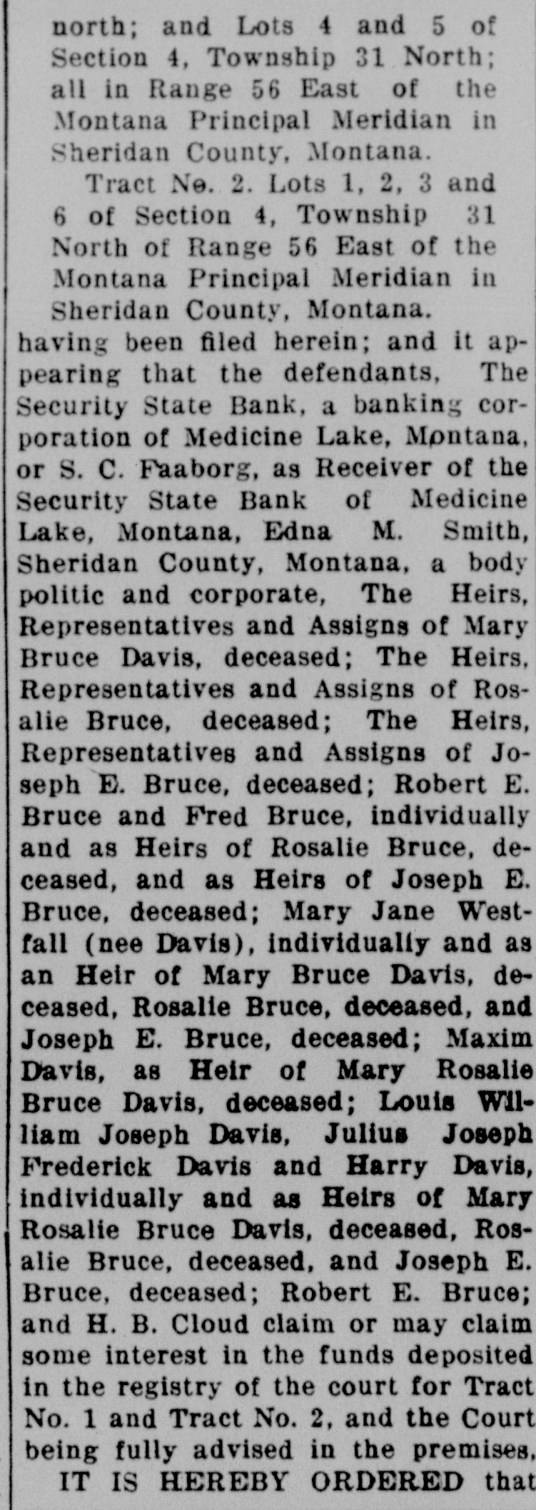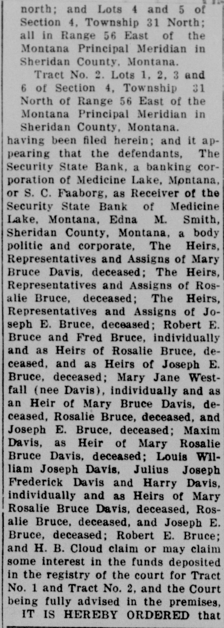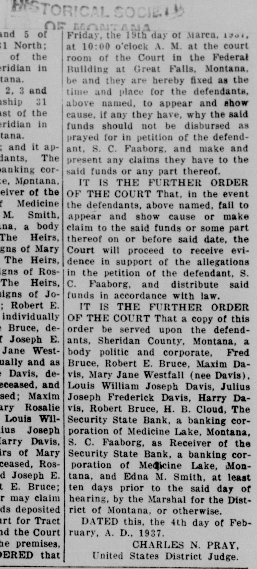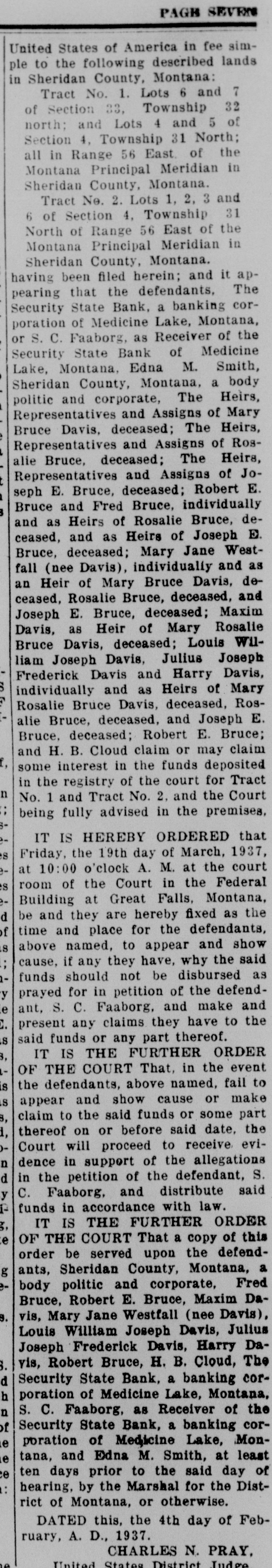 TORICAL SOCIE OF MONTANA 5 of Friday, the 19th day of Marcn, 1901, North; at 10:00 o'clock A. M. at the court of the room of the Court in the Federal ridian in Building at Great Falls, Montana, be and they are hereby fixed as the and 3 2, time and place for the defendants, 31 above named, to appear and show the of cause, if any they have, why the said in eridian funds should not be disbursed as prayed for in petition of the defendand it apant, S. C. Faaborg, and make and dants, The present any claims they have to the anking corsaid funds or any part thereof. Montana, IT IS THE FURTHER ORDER eiver of the OF THE COURT That, in the event Medicine the defendants, above named, fail to M. Smith, appear and show cause or make a body claim to the said funds or some part The Heirs, thereof on or before said date, the of Mary Court will proceed to receive eviThe Heirs, dence in support of the allegations of Rosin the petition of the defendant, S. The Heirs, C. Faaborg, and distribute said of Jofunds in accordance with law. Robert E. IT IS THE FURTHER ORDER individually OF THE COURT That a copy of this Bruce, deorder be served upon the defendJoseph E. ants, Sheridan County, Montana, a Jane Westbody politic and corporate, Fred and as Bruce, Robert E. Bruce, Maxim DaDavis, devis, Mary Jane Westfall (nee Davis), eceased, and Louis William Joseph Davis, Julius Maxim Joseph Frederick Davis, Harry DaRosalie vis, Robert Bruce, H. B. Cloud, The Louis WilSecurity State Bank, a banking corJoseph poration of Medicine Lake, Montana, Davis, S. C. Faaborg, as Receiver of the of Mary Security State Bank, a banking corceased, Rosporation of Medicine Lake, MonJoseph E. tana, and Edna M. Smith, at least E. Bruce; ten days prior to the said day of may claim hearing, by the Marshal for the Distdeposited rict of Montana, or otherwise. for Tract DATED this, the 4th day of Febthe Court ruary, A. D., 1937. premises, CHARLES N. PRAY, ERED that United States District Judge.