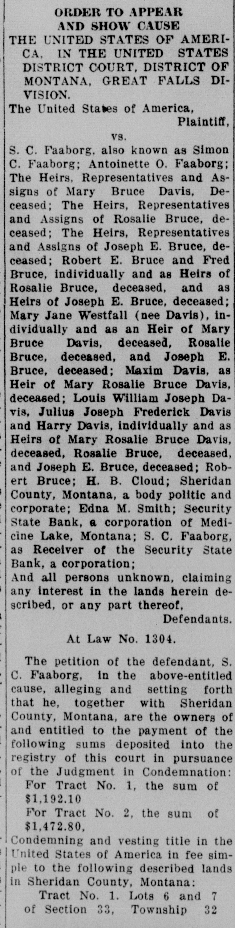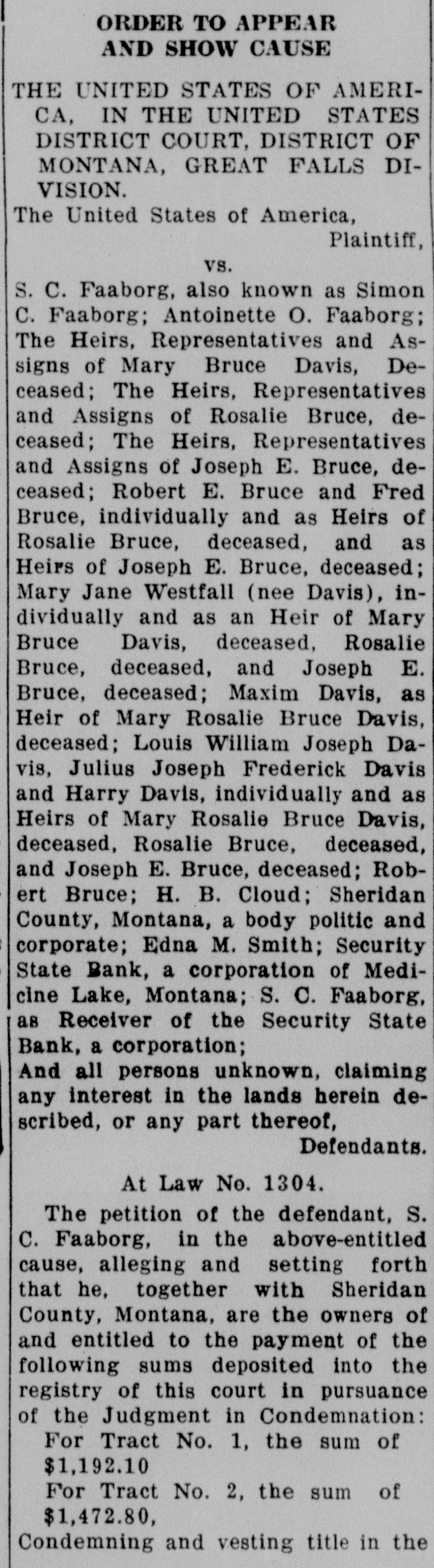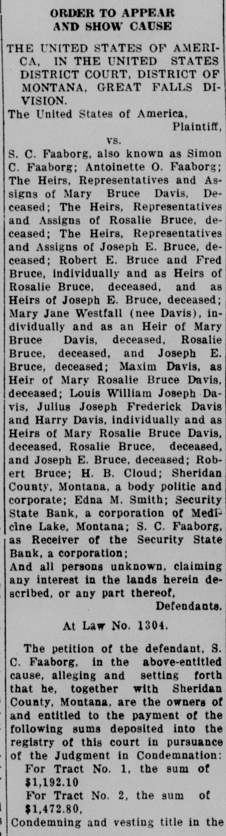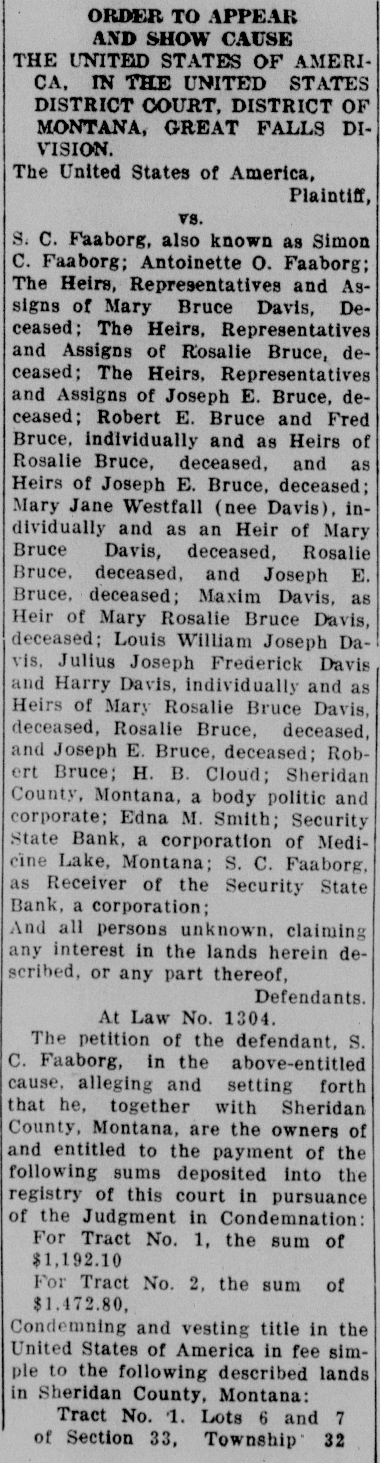 TORICAL SOCIE OF MONTANA 5 of Friday, the 19th day of Marcn, 1901, North; at 10:00 o'clock A. M. at the court of the room of the Court in the Federal ridian in Building at Great Falls, Montana, be and they are hereby fixed as the and 3 2, time and place for the defendants, 31 above named, to appear and show the of cause, if any they have, why the said in eridian funds should not be disbursed as prayed for in petition of the defendand it apant, S. C. Faaborg, and make and dants, The present any claims they have to the anking corsaid funds or any part thereof. Montana, IT IS THE FURTHER ORDER eiver of the OF THE COURT That, in the event Medicine the defendants, above named, fail to M. Smith, appear and show cause or make a body claim to the said funds or some part The Heirs, thereof on or before said date, the of Mary Court will proceed to receive eviThe Heirs, dence in support of the allegations of Rosin the petition of the defendant, S. The Heirs, C. Faaborg, and distribute said of Jofunds in accordance with law. Robert E. IT IS THE FURTHER ORDER individually OF THE COURT That a copy of this Bruce, deorder be served upon the defendJoseph E. ants, Sheridan County, Montana, a Jane Westbody politic and corporate, Fred and as Bruce, Robert E. Bruce, Maxim DaDavis, devis, Mary Jane Westfall (nee Davis), eceased, and Louis William Joseph Davis, Julius Maxim Joseph Frederick Davis, Harry DaRosalie vis, Robert Bruce, H. B. Cloud, The Louis WilSecurity State Bank, a banking corJoseph poration of Medicine Lake, Montana, Davis, S. C. Faaborg, as Receiver of the of Mary Security State Bank, a banking corceased, Rosporation of Medicine Lake, MonJoseph E. tana, and Edna M. Smith, at least E. Bruce; ten days prior to the said day of may claim hearing, by the Marshal for the Distdeposited rict of Montana, or otherwise. for Tract DATED this, the 4th day of Febthe Court ruary, A. D., 1937. premises, CHARLES N. PRAY, ERED that United States District Judge.