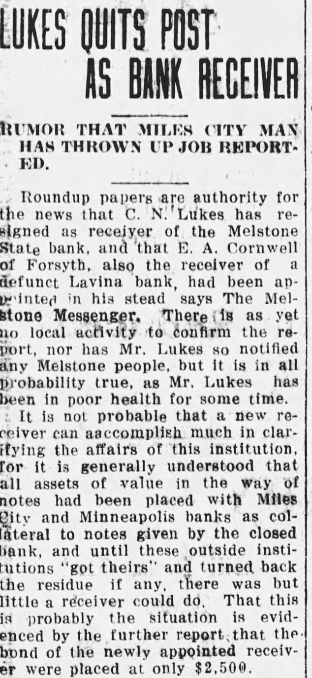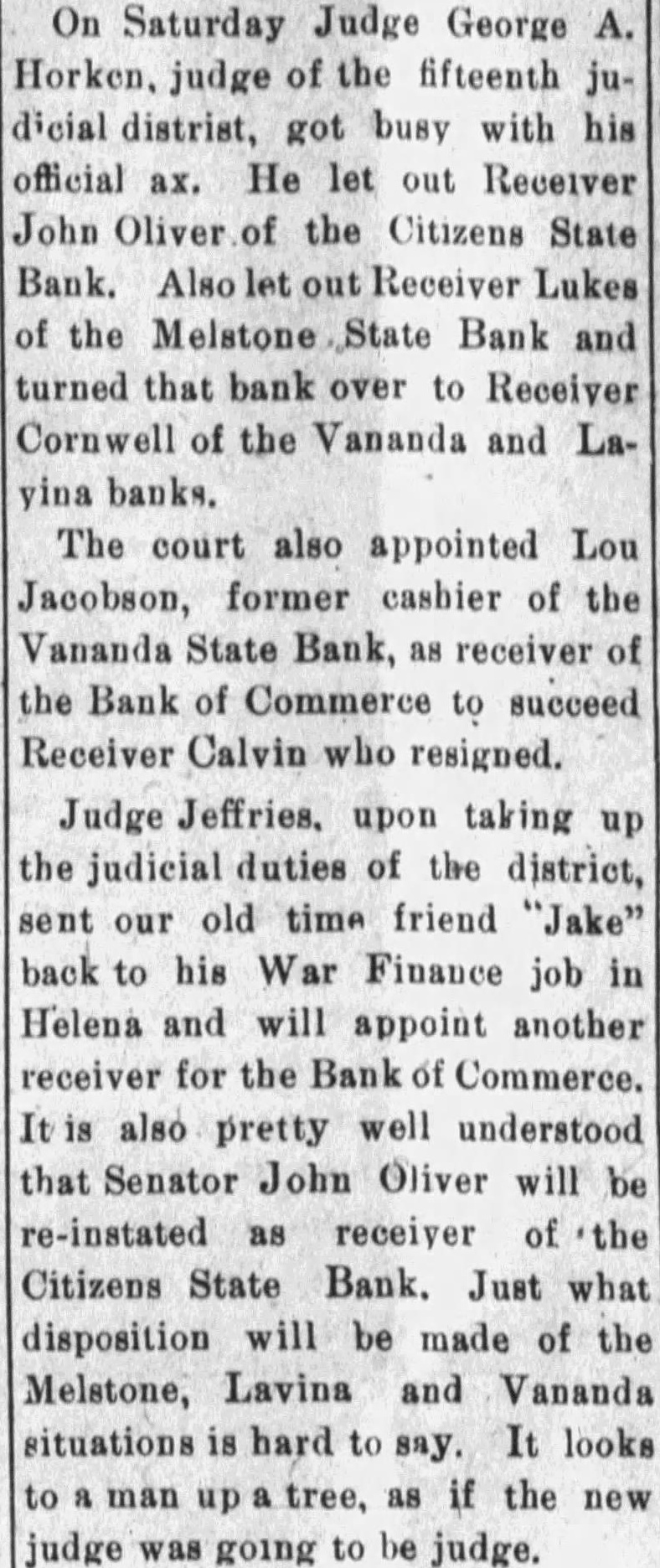 On Saturday Judge George A. Horken, judge of the fifteenth judicial distrist, got busy with his official ax. He let out Receiver John Oliver of the Citizens State Bank. Also let out Receiver Lukes of the Melstone State Bank and turned that bank over to Receiver Cornwell of the Vananda and Layina banks. The court also appointed Lou Jacobson, former casbier of the Vananda State Bank, as receiver of the Bank of Commerce to succeed Receiver Calvin who resigned. Judge Jeffries, upon taking up the judicial duties of the district, sent our old time friend "Jake" back to his War Finance job in Helena and will appoint another receiver for the Bank of Commerce. It is also pretty well understood that Senator John Oliver will be re-instated as receiver of 'the Citizens State Bank. Just what disposition will be made of the Melstone, Lavina and Vananda situations is hard to say. It looks to a man up a tree, as if the new judge was going to be judge.