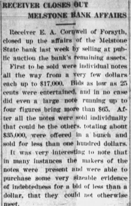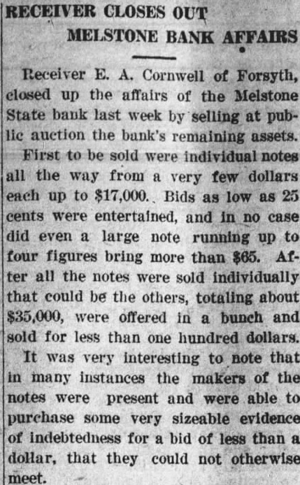 RECEIVER CLOSES OUT MELSTONE BANK AFFAIRS Receiver E. A. Cornwell of Forsyth, closed up the affairs of the Melstone State bank last week by selling at pubHe auction the bank's remaining assets. First to be sold were individual notes all the way from a very few dollars each up to $17,000. Bids as low as 25 cents were entertained, and in no case did even a large note running up to four figures bring more than $65. After all the notes were individually that could be the others. totaling about $35,000, were offered in a bunch and sold for less than one hundred dollars. It was very Interesting to note that in many instances the makers of the notes were present and were able to purchase some very sizeable evidence of indebtedness for a bid of less than a dollar, that they could not otherwise meet.