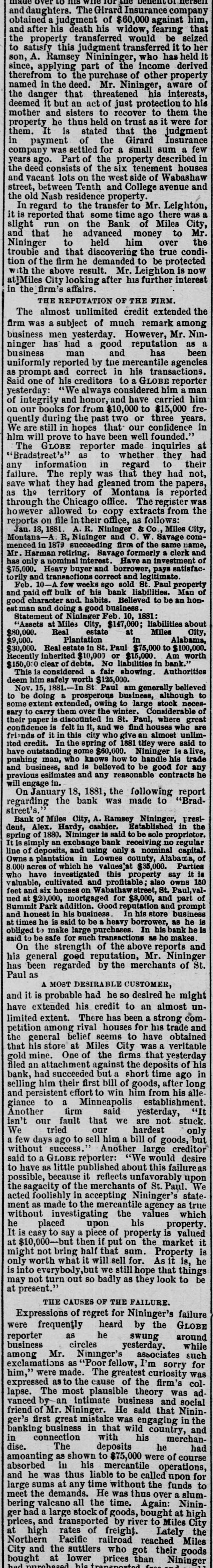 over to me for and daughters. The Girard Insurance company obtained a judgment of $60,000 against him, and after his death his widow, fearing that the property transferred would be seized to satisfy this judgment transferred it to her son, A. Ramsey Ninininger, who has held since, applying part of the income derived therefrom to the purchase of other property named in the deed. Mr. Nininger, aware of the danger that threatened his interests, deemed it but an act of just protection to his mother and sisters to recover to them the property he thus held on trust as it were for them. It is stated that the judgment in payment of the Girard Insurance company was settled for a small sum a few years ago. Part of the property described in the deed consists of the six tenement houses and vacant lots on the west side of Wabashaw street, between Tenth and College avenue and the old Nash residence property In regard to the transfer to Mr. Leighton, a it is reported that some time ago there was slight run on the Bank of Miles City, and that he advanced money to Mr. Nininger to held him over the trouble and that discovering the true condition of the firm he demanded to be protected with the above result. Mr. Leighton is now tiMiles City looking after his further interest in the firm's affairs. THE REPUTATION OF THE FIRM. The almost unlimited credit extended the firm was a subject of much remark among business men yesterday. However, Mr. Ninninger has had a good reputation as a business man and has been uniformly reported by the mercantile agencies as prompt and correct in his transactions. Said one of his creditors to a GLOBE reporter yesterday "We always considered him man of integrity and honor, and have carried him on our books for from $10,000 to $15,000 frequently during the past two or three years. We are still in hopes that our confidence in hlm will prove to have been well founded. The GLOBE reporter made inquiries at Bradstreet's as to whether they had any information in regard to their failure. The reply was that they had not, save what they had gleaned trom the papers, as the territory of Montana is reported through the Chicago office. The register was however allowed to copy extracts from the reports on file in their office, as follows Jan.18,1881 A.R. Nininger & Co. Miles City, Montana-A R. Nininger and W Savage commenced in 1879 succeeding firm of the same name, Mr Harman retiring. Savage formerly clerk and has only nominal interest Have an Investment of $75,000. Heavy buyer and borrower. pays satisfactorily and transactions correct and legitimate. Feb. 10-A few weeks sgo sold St. Paul property and paid off bulk of his bank liabilities. Man of good character and habits. Believed to be an honest man and doing good business Statement of Nininger Feb. 10. 1881 Assets at Miles City, $147,000; liabilities about $80,000. Real estate at Miles City, in Plantation Alabama $9,000. $30,000. Real estate in St. Paul $75,000 to $100,000. Recently inherited $10,000 or $15,000 Am worth $150,030 clear of debts. No liabilities in bank. This is considered a fair showing Authorities deem him safely worth $125,000. Nov. 15, 1881. In St Paul am generally believed to be doing prosperous business. although to some extent extended, owing to large stock neces sary to carry them over the winter. Considerable of their paper is discounted in St. Panl. where great confidence is felt in it. and we find houses who are friends of it in this city who give an almost unlimited credit. In the spring of 1881 they were said to have outsta some $60,000. Nininger live, pushing man, who knows how to handle his trade and business, and is believed to be good for any previous esilmates and any reasonable contracts he will engage in. On January 18, 1881, the following report regarding the bank was made to Bradstreet's Bank of Miles City, A. Ramsey Nininger, rrestdent, Alex. Hardy, cashier. Established in the spring of 1880. Nininger is said to be sole proprietor. It s simply an exchange bank receiving no regular line of deposits, and using only nominal capital. Owns plantation in Lownes county, Alabama, of 8.000 acres of which he values'at $35,000. Parties who have investigated this property say it is valuable, cultivated and profitable also owns 150 feet and six houses on Wabathaw street, St. Paul,va ued at $20,000, mortgaged for $8,000, and part of Summit Park addition. Good reputation and prompt and honest in his business In his store business at times he is said to be heavy borrower. as he is obliged to make large purchases. In his bank he is said to be safe for such transactions as he makes On the strength of the above reports and his general good utation, Mr. Nininger has been regarded by the merchants of St. Paul as A MOST DESIRABLE CUSTOMER, and it is probable had he so desired he might have extended his credit to an almost un limited extent. There has been a strong competition among rival houses for his trade and the general belief seems to have obtained that his store at Miles City was a veritable gold mine. One of the firms that yesterday filed an attachment against the deposits of his bank, had succeeded but a short time ago in selling him their first bill of goods, after long and persistent effort to win him from his alle giance to a Minneapolis establishment Another firm said yesterday, isn't our fault that we are not stuck. our tried hardest We only a few days ago to sell him a bill of goods, but without success. Another large creditor said to a GLOBE reporter: 'We would desire to have as little published about this failureas possible, because it reflects unfavorably upon the sagacity of the merchants of St. Paul. We acted foolishly in accepting Nininger's state ment as made to the mercantile agency as true without investigating the values which he placed upon his property It easy to say a piece of property is valued at $10,000- but then if put on the market it is might not bring half that sum. Property only worth what
