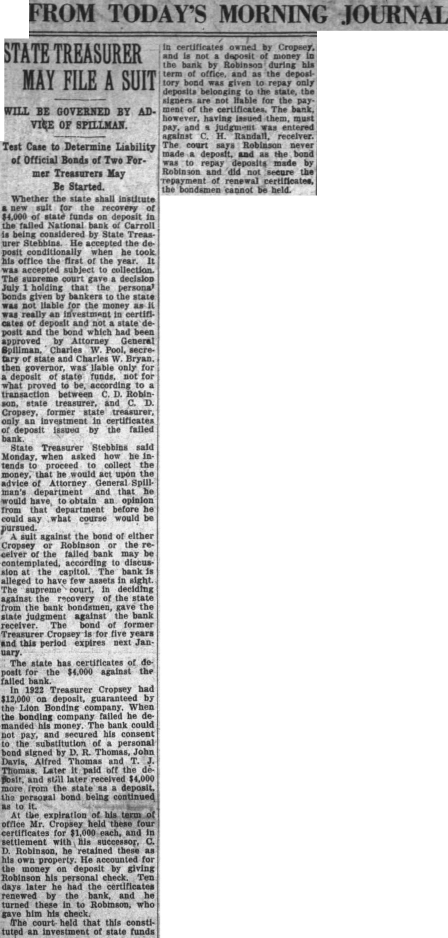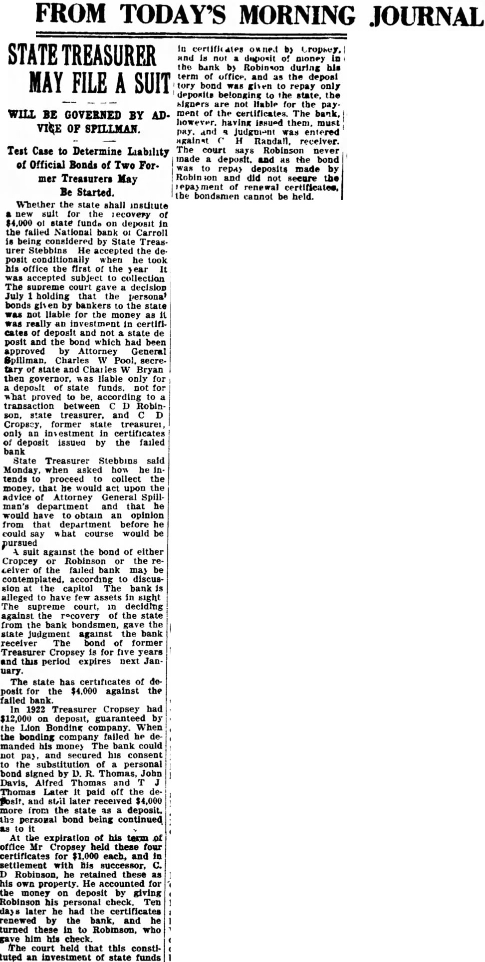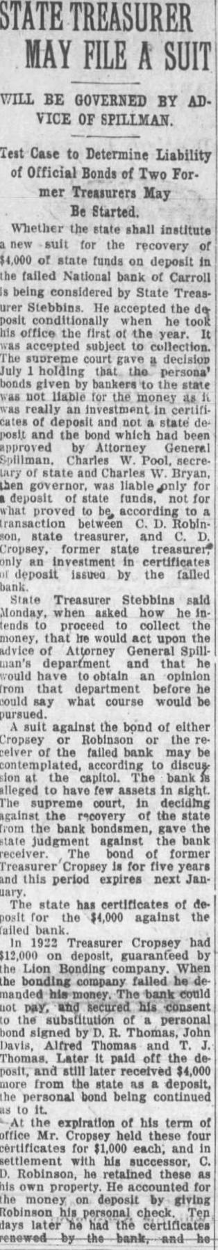 Test Case to Determine Liability of Official Bonds of Two Former Treasurers May Be Started. Whether the state shall institute sult for the recovery $4,000 of state funds on deposit the failed National bank of Carroll being by State TreasStebbins. He accepted the deconditionally when he his office the first of the year. accepted subject to collection. The supreme court gave decision July holding that the personal bonds given bankers state was not liable for the money was really in certificates of deposit and not state deposit and the bond which had been approved by Attorney General Spillman, Charles W. Pool, secretary of state and Charles W. Bryan. then governor, was liable only for deposit of state not for what proved to be, according to transaction between D. Robinson, state treasurer, and C. D. Cropsey, former state treasurer, only investment in certificates of deposit issued by the failed bank. State Treasurer Stebbins said Monday, when asked how he tends to collect the money, that he would act upon the advice Attorney Spillman's and that he would have, to obtain an opinion from that department before he could say what course would pursued. suit against the bond of elther Cropsey Robinson the ceiver of the failed bank may be according to discussion at the capitol. The bank is alleged to have few assets in sight. The supreme court, in deciding against the recovery of the state from the bank gave the state judgment against the bank receiver. The bond of former Treasurer Cropsey for five years and this period expires next January. The state has certificates of posit for $4,000 against the failed bank. In 1922 Treasurer Cropsey had $12,000 deposit, guaranteed by the Lion Bonding company. When the bonding company failed he demanded his money. The bank could not pay, secured his consent the substitution of personal bond signed by R. Thomas, John Davis, Alfred Thomas and Thomas. Later It paid off the posit, and still later received $4,000 more from the state as deposit, the personal bond being continued to it. At the expiration of his term office Mr. Cropsey held these certificates for each, and settlement with his Robinson, he retained these own property. He for money on deposit by giving Robinson his check. Ten days later he had the certificates renewed by the bank, and he turned in to Robinson, who gave him his check. The court held that this constituted an investment of state funds in certificates owned by Cropsey, and is not deposit money in the bank by Robinson during his term of office, and as the depository bond was given to repay only deposits belonging to the state, the signers are not liable for the payment of the certificates. The bank, however, having issued them, must and judgment was entered against H. Randall, receiver. The court says Robinson never made deposit, and as the bond was to repay deposits made by Robinson did not secure the renewal certificates, the bondsmen cannot be held.