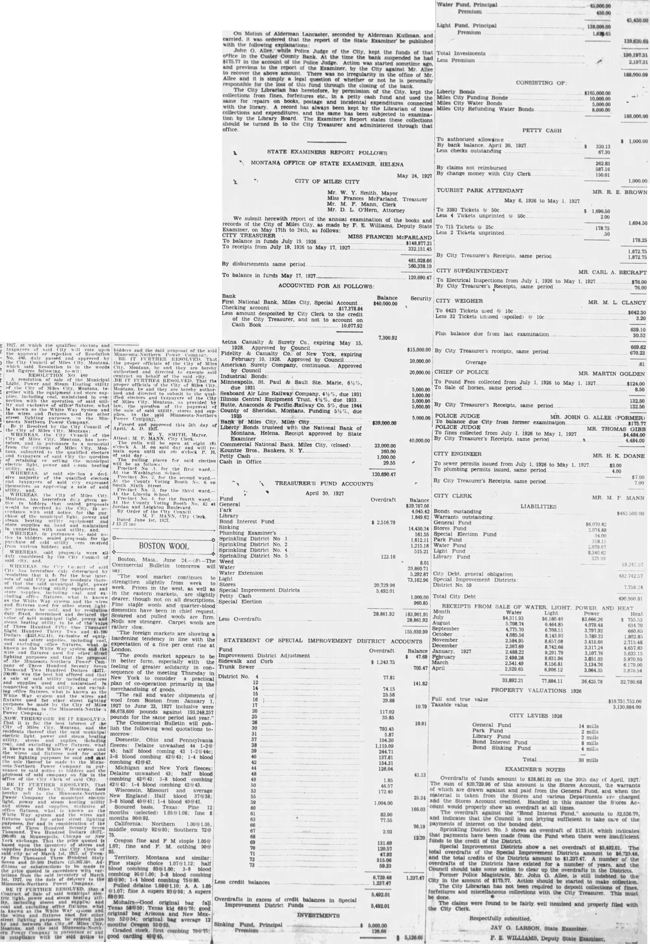 1927. at which the qualified electors and taxpayers said City vote upon the rejection Resolution No. 480. duly and approved by the City Council of Miles City Montana. which Resolution is in the words and figures RESOLUTION NO 480 resolution of sale of the Municipal Light Power and Steam Heating utility the City of Miles City, Montana towith the and supplies. including coal. maintained in connection with the operation said utilIty and exclusive office fixtures. what known the White Way and the wires fixtures used for street the nesota Northern Power Company Resolved the City Council of WHEREAS the City Council of the City of Miles City. Montana. has here tofore, and in pursuasee memorial from Miles City, Mon tana. submitted the qualified electors and taxpayers of said City the question retaining selling the municipal electric light, power and steam heating utility WHEREAS said decl sive majority qualified electors and taxpayers said expressed approving sale of said utility WHEREAS the City of Miles City Móntana, hsa heretofore given no tice bidders that sealed proposals would be received in cordance with said for the pur chase of the municipal light. power and steam heating utility equipment and store supplies on band and maintained connection with said utility and WHEREAS in pursuance said notice to bidders sealed proposals for the purchase of utility were received from bidders and. WHEREAS said proposits were all duly considered by the Council of said and WHEREAS the City neil of said City heretofore duly determined by resolution that for the interests said and residents that the said municipal light. power and steam heating utility equipment and including and ex cluding fixtures what known White and the wires and fixtures used for other light purposes and by resolution duly fixed. determined and declared the value municipal light power and steam the Three Hundred One Eight Hundred Thirty Two and 41-100 Dollars ($351,832) lusive equip ment store supplies, including coal, and excluding fixtures. what is known the system and wire and fixtures for other street lighting purposes and that the proposal of the Minnesota Com pany of Three Hundred Seventy Seven Thousand Two Hundred Dollars $377. 200.00) was the best bid offered and that said utility including and supplies used and maintained In connection with said utility and ing office fixtures, what known as the White Was system and the and fixtures used for other street lighting purposes be City Montana. to the Minnesota Northe Power Company NOW THEREF ORE BE IT RESOLVED That for the best interest City of Miles City, Montana and the residents thereof that the said municipal electric light power and steam heating utility stores including and excluding office what known as the White Way system and the fixtures used for street lighting purposes be sold and that the thereof be the Power Company in suance to said bidders and the proposal said company on file the office of the Clerk of said City BE IT FURTHER RESOLVED That the City Miles Montana does hereby the Minnesota Power Company the municipal electric light. power and steam heating utility and stores and exclusive of office known as White Way system and the and fixtures used other street lighting purposes, for and consideration the sum Three Hundred Seventy Seven Thousand Hundred Dollars ($377, 200.00) in bicago York exchange. That the price quoted based upon the Inventory stores and supplies by the Clerk 95. Twen five Three Hundred Sixty Seven and 50-100 Dollars Ad ditions substractions to be made to the price quoted from the inventory of March on the date delivery to the Minnesota Northern Company BE IT FURTHER RESOLVED that Contract of said municipal elec trie light. and steam heating Ity. including stores and supplie, and office fixtures what known as the White Way system and the wires and fixtures used for other street lighting entered and the Miles City, and the said Minnesota North ern Power with the said notice to compliance On Motion of Alderman Lancaster, seconded by Alderman Kuilman, and carried. the following was ordered that the report of the State Examiner' be published with explanations: John G. Allee, while Police Judge of the City, kept the funds of that office in the Custer County Bank. At the time the bank suspended he had $175.77 in the account of the Police Judge. Action was started sometime ago, and previous to the report of the Examiner, by the City against Mr. Allee to recover the above amount There was no irregularity in the office of Mr. Allee and it is simply a legal question of whether or not he is personally responsible for the loss of this fund through the closing of the bank. The City Librarian has heretofore, by of the City, kept the collections from fines, forfeitures etc., in petty cash fund and used the same for repairs on books, postage and incidental expenditures connected with the library. A record has always been kept by the Librarian of these collections expenditures, and the same has been subjected to examination by the Library Board. The Examiner's Report states these collections should be turned in to the City Treasurer and administered through that office. May 24, 1927 Mr. W. Y. Smith. Mayor Miss Frances McFarland. Treasurer Mr. M. F. Mann, Clerk Mr. D. L. O'Hern, Attorney To balance in funds May 17. 1927 bidders and the said proposal of the sald BE IT FURTHER RESOLVED. That the proper officials of the City of Miles City Montana. and they are hereby authorized and directed execute said contract said city. BE FURTHER RESOL That the proper officials the City of Miles Montana and they are hereby authorand directed to submit to the qualifled and txapayers of the Miles City Montana. provided by law, the question the paproval the said utility stores and supthe said Minnesota Northern Power Company. Passed and paproved this 5th day of April, 1927. BOSTON WOOL Boston. Mass. June 24.-(P)--The Commercial Bulletin tomorrow will say The wool market continues 