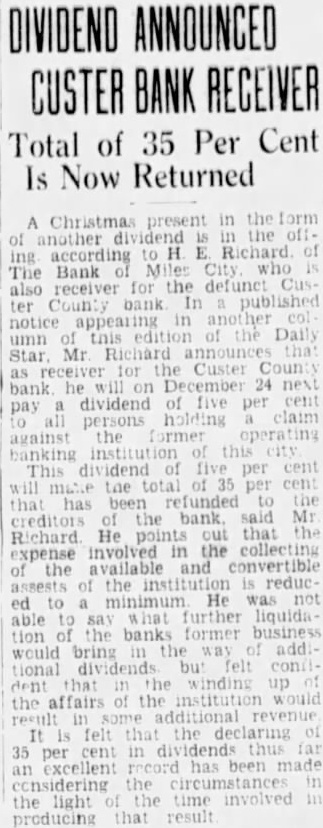 DIVIDEND ANNOUNCED CUSTER BANK RECEIVER Total of 35 Per Cent Is Now Returned A Christmas present H. Richard of ing according Bank the defunct receiver ter bank published appearing umn Daily Mr Richard Custer Count as receiver bank December 24 dividend per cent pay holding against banking dividend per cent 35 per will that has been refunded creditors the bank He that the Richard points involved in the collecting expense available convertible reduc minimum He was ed further liquida able banks former business would bring idends winding up affairs the would the It 35 per excellent has been made an considering the the light time in producing that result